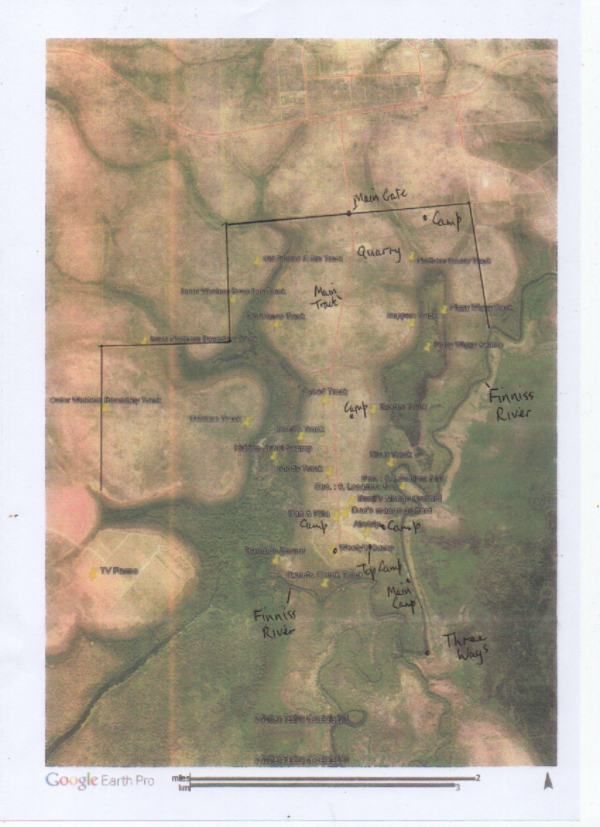 14 km of perimeter fencing and three main gates were built initially and have been maintained since by the Consortium. There is a main road from the top fence, some 6 km of all-weather quality established in 1991, and an estimated 40 km of dry season tracks throughout the property.