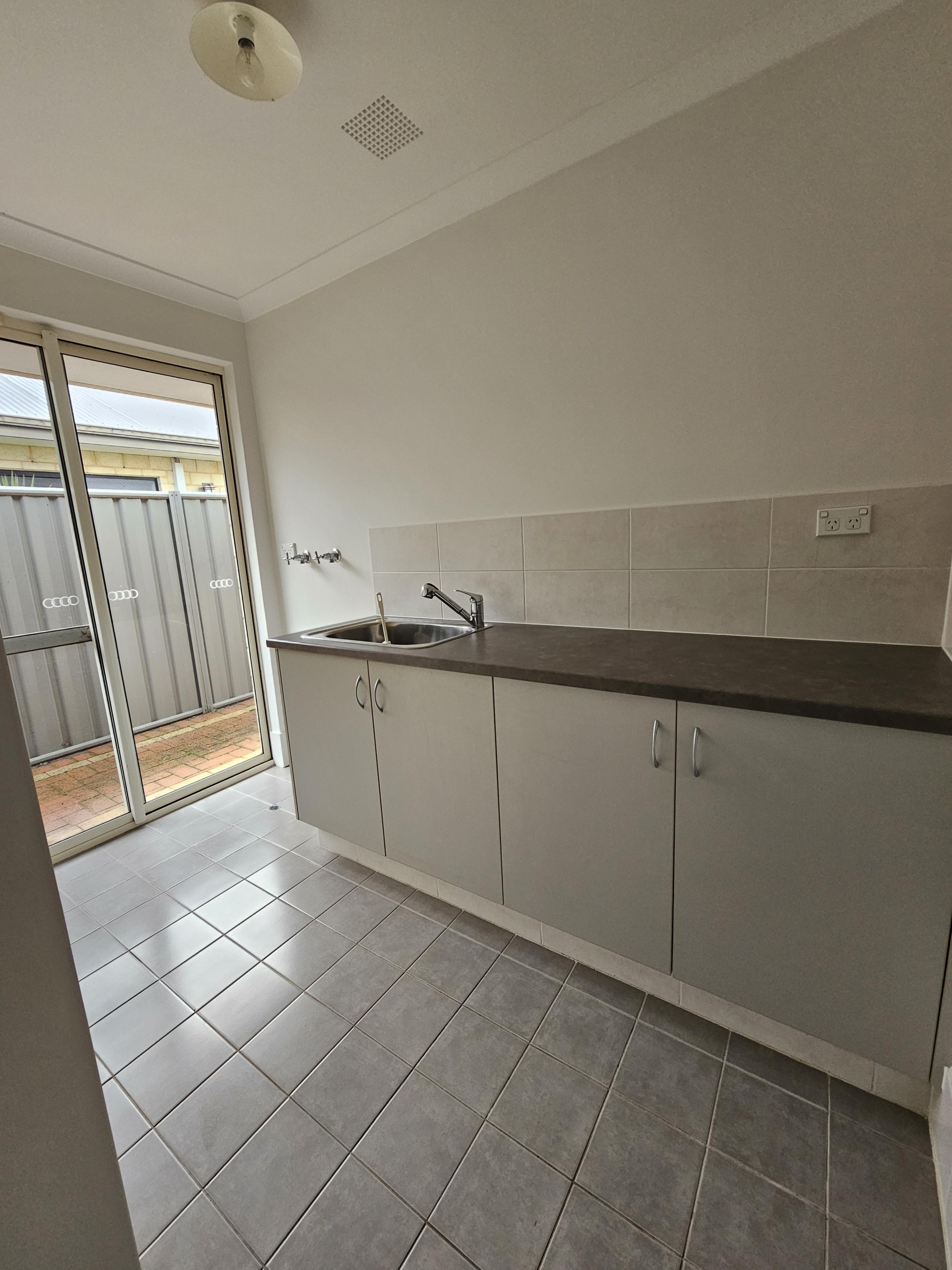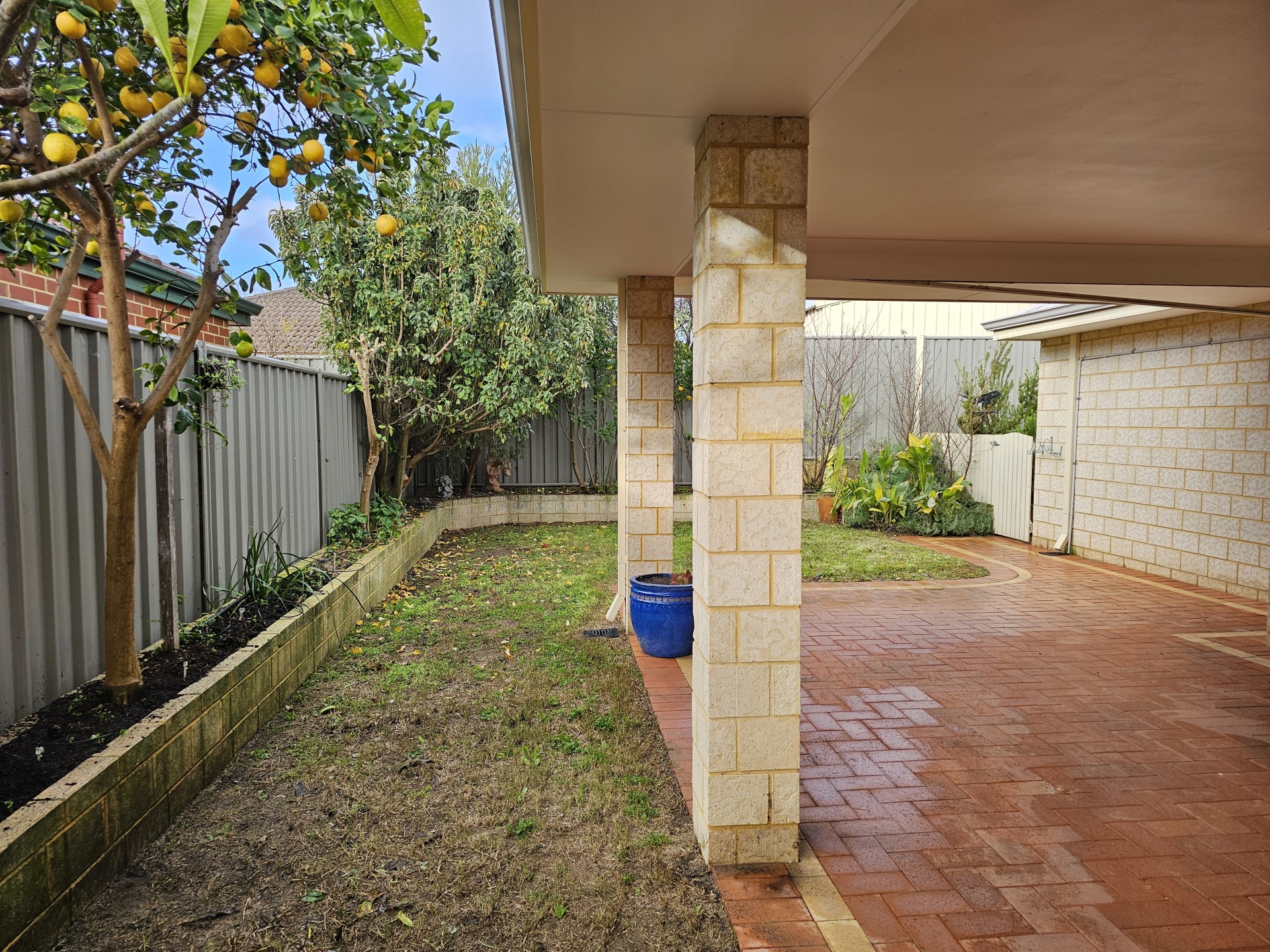 The patio area is an ideal spot for al fresco dining. The outdoor space is enhanced by established fruit trees and room for a vegetable garden.