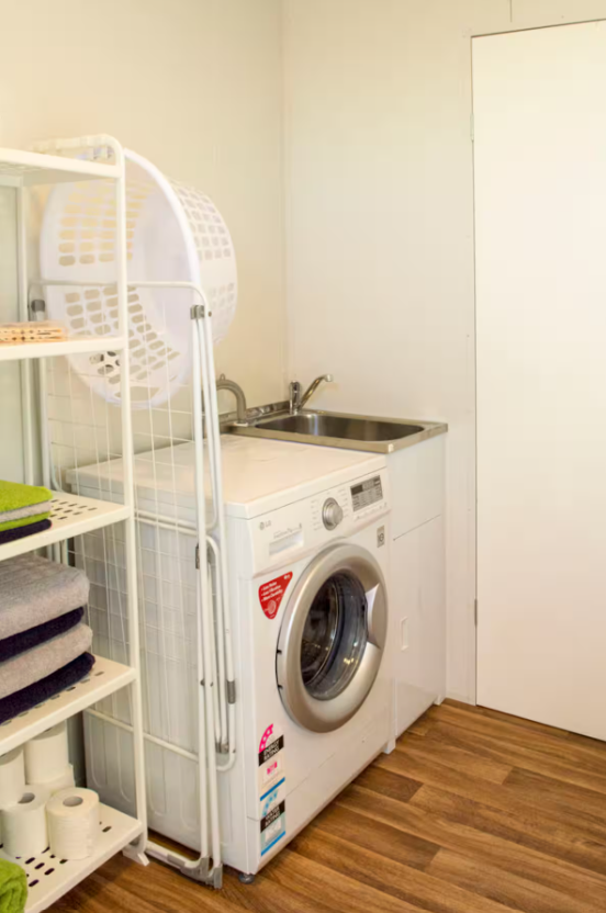 - A functional bathroom with integrated laundry