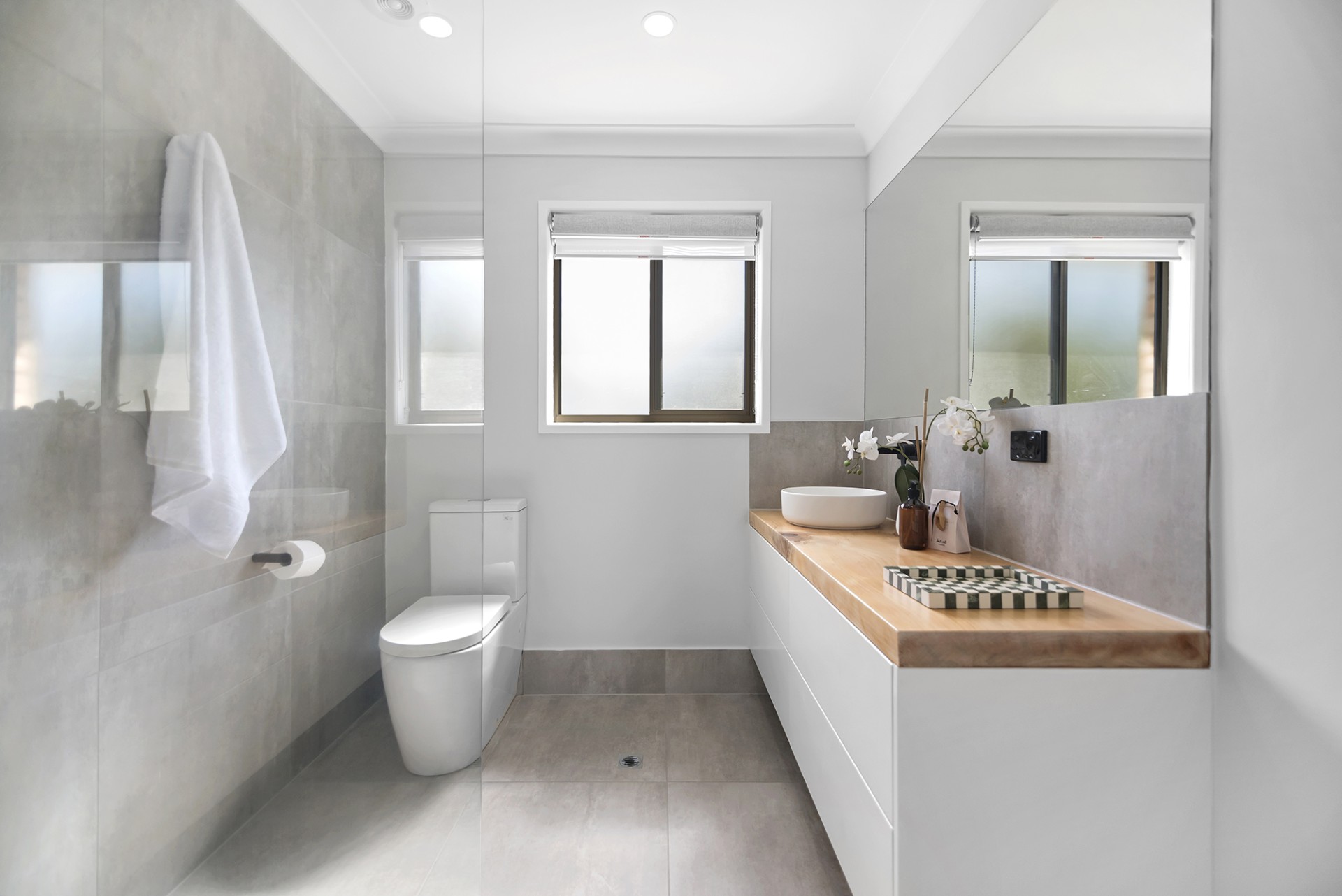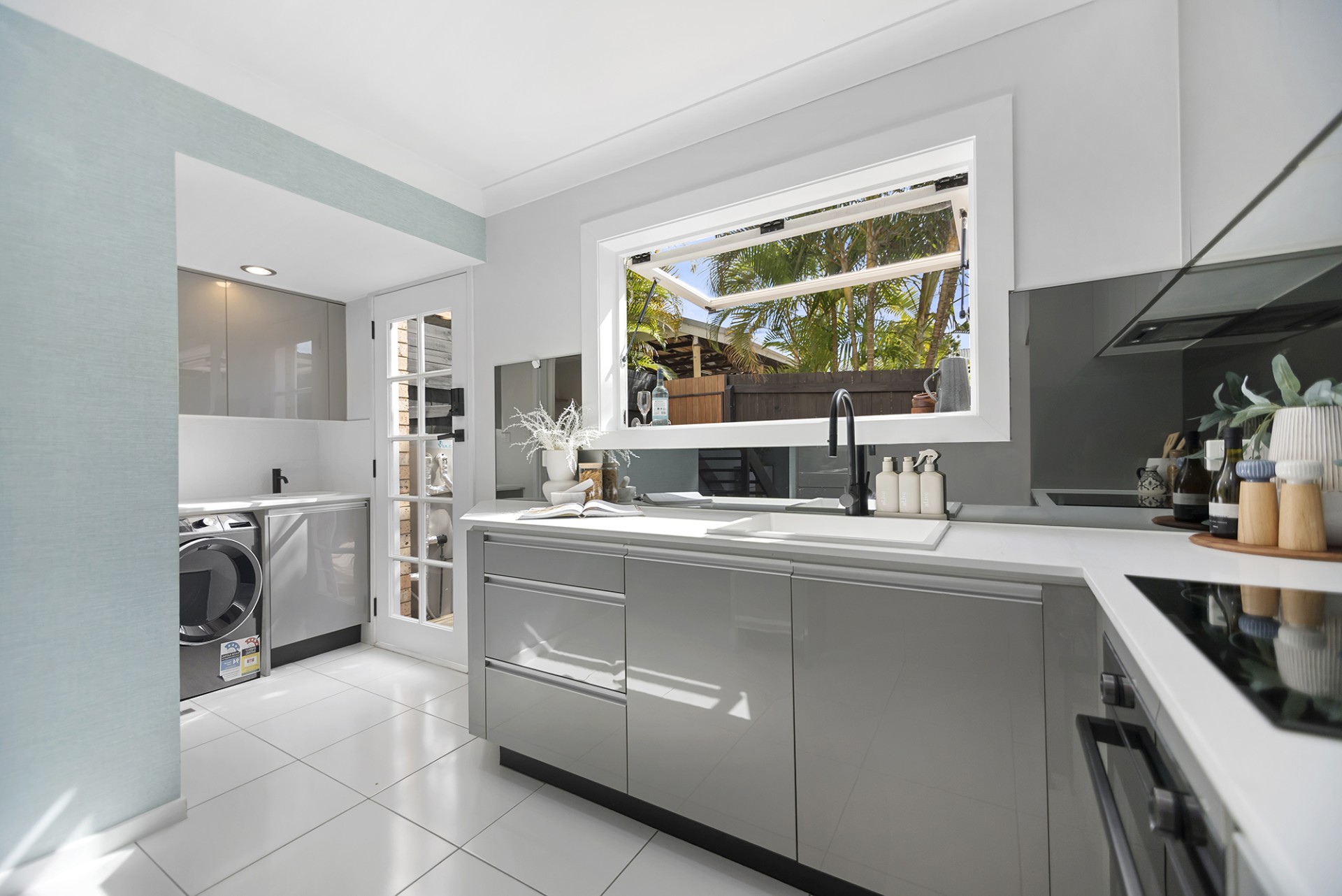 The designer kitchen is the heart of the home, with stone benchtops, quality appliances, sleek cabinetry, and a custom gas-strut servery window that opens to an outdoor bar and timber deck, perfect for weekend brunch or evening drinks.