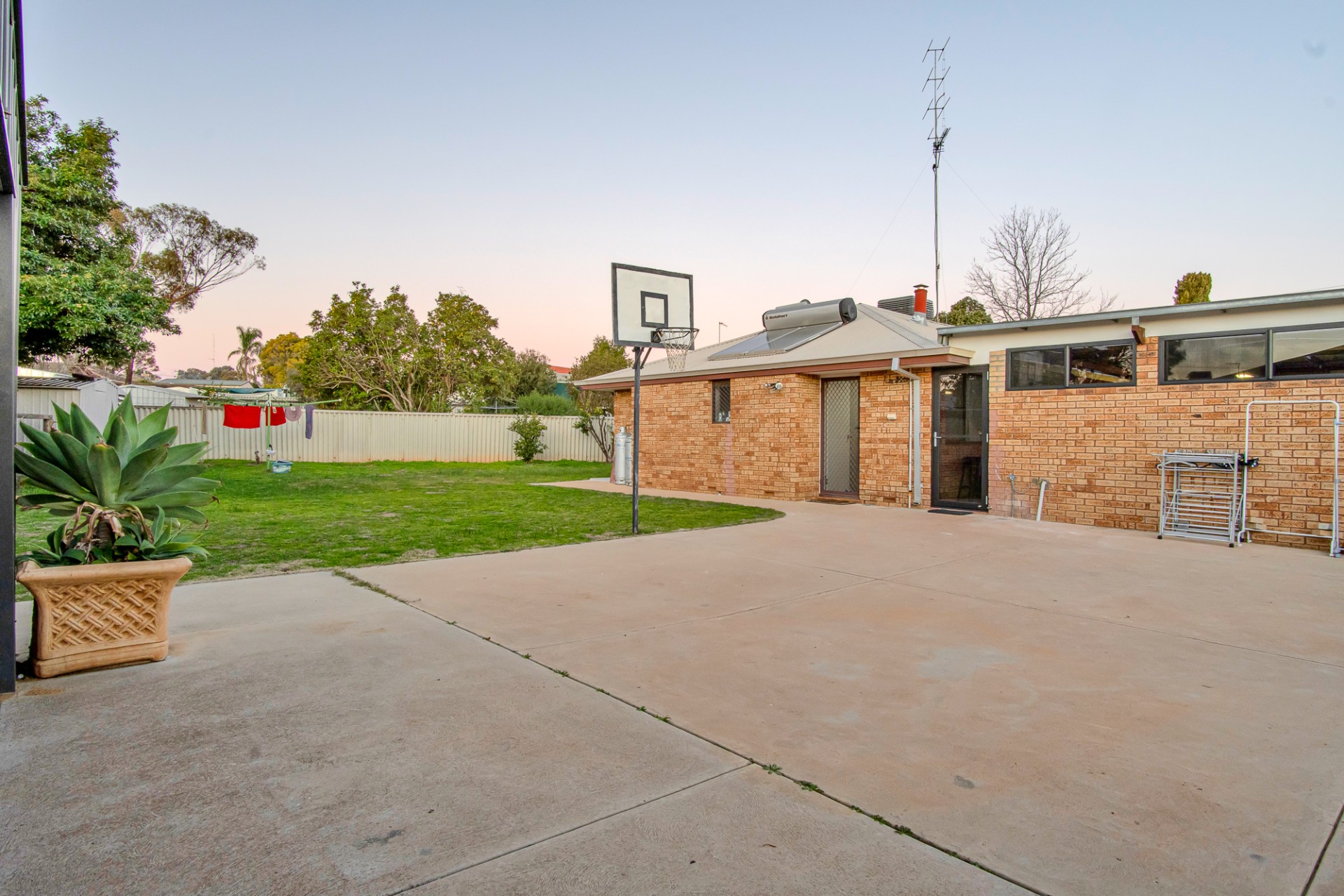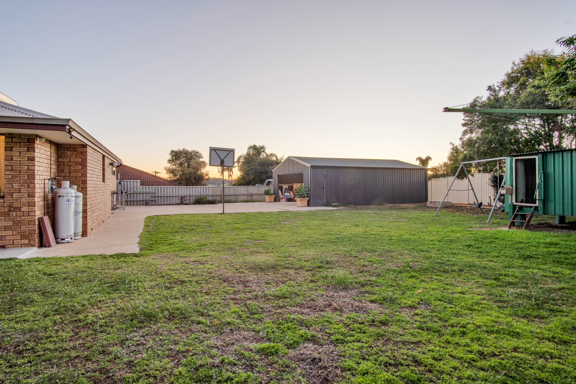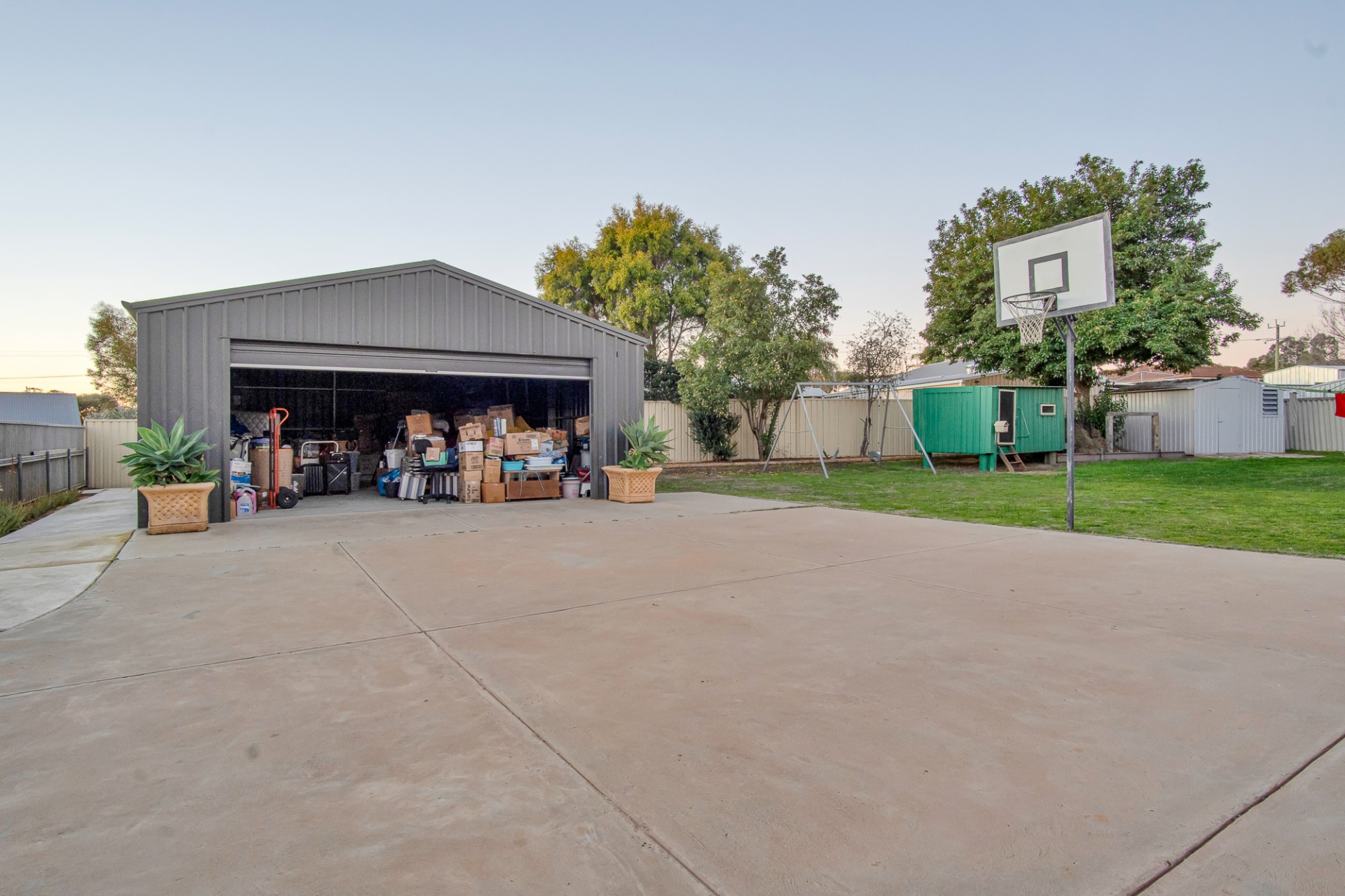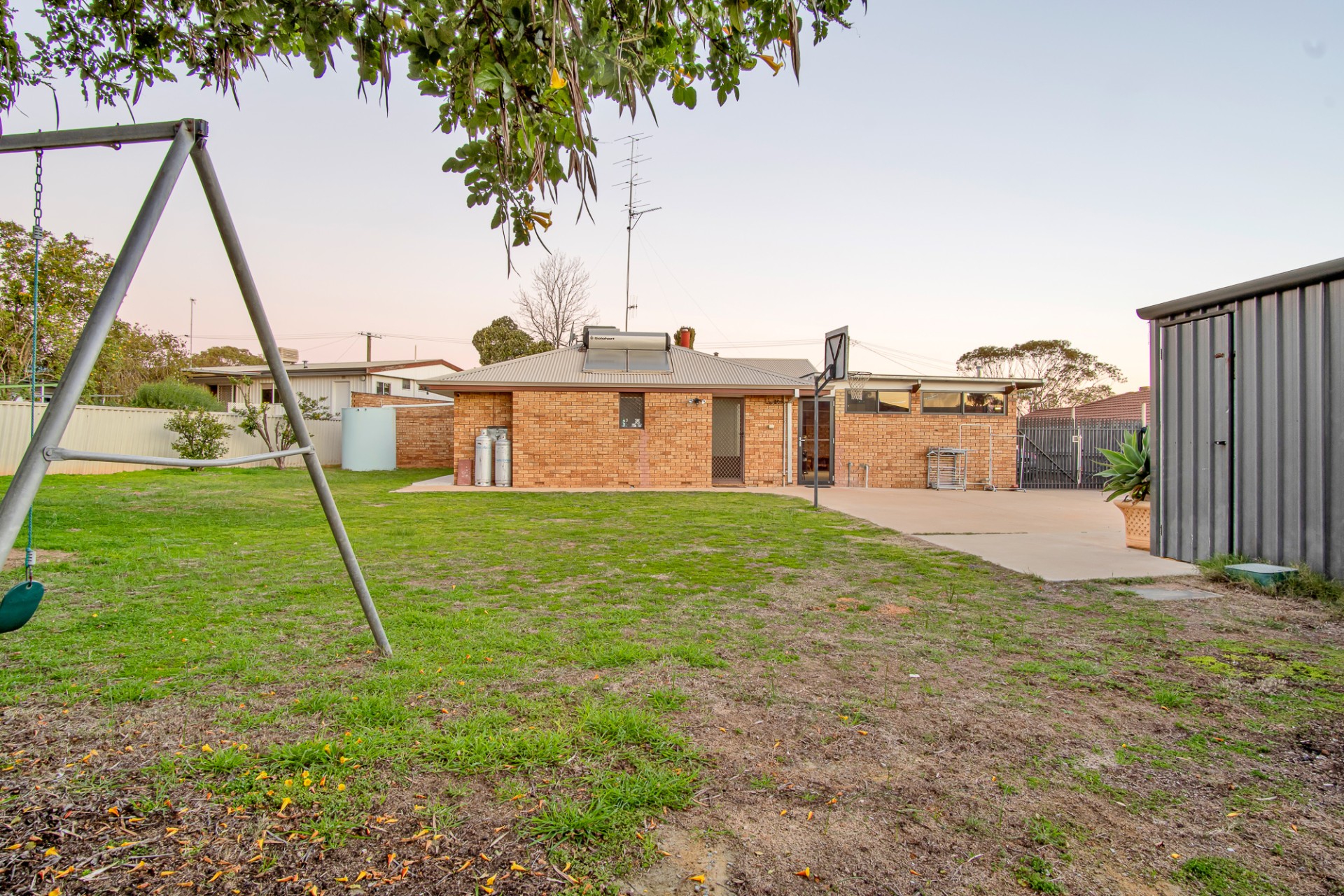 The property is fully fenced with a remote-controlled gate, six monitored cameras for added security, solar hot water, a powered garage/workshop measuring 9m x 6.23m, and a garden shed. The backyard features a swing, cubby house, and basketball hoop for the kids to enjoy.