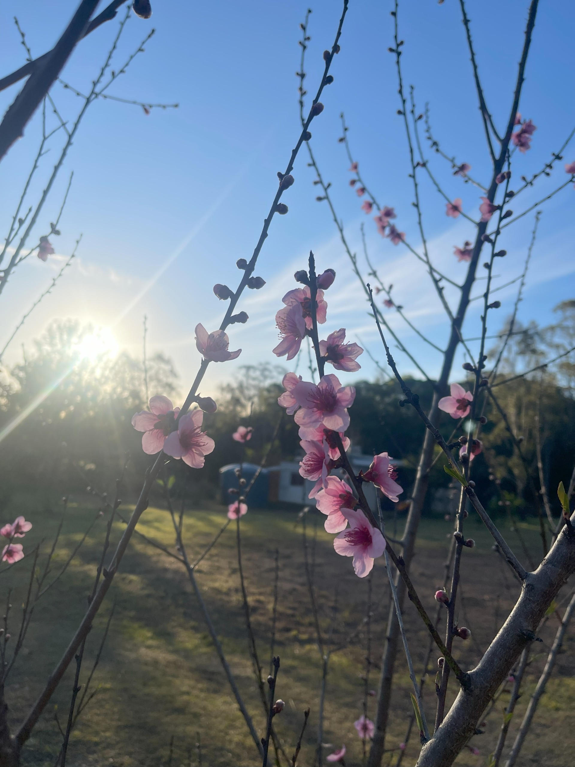 The property also features 2 demountable buildings, each 6m x 3.2m, with solar panels, and the cabin includes a solar hot water system. The front 'house paddock' has a series of established fruit trees, including various rare citrus, an olive grove, a row of peach trees, and many more.