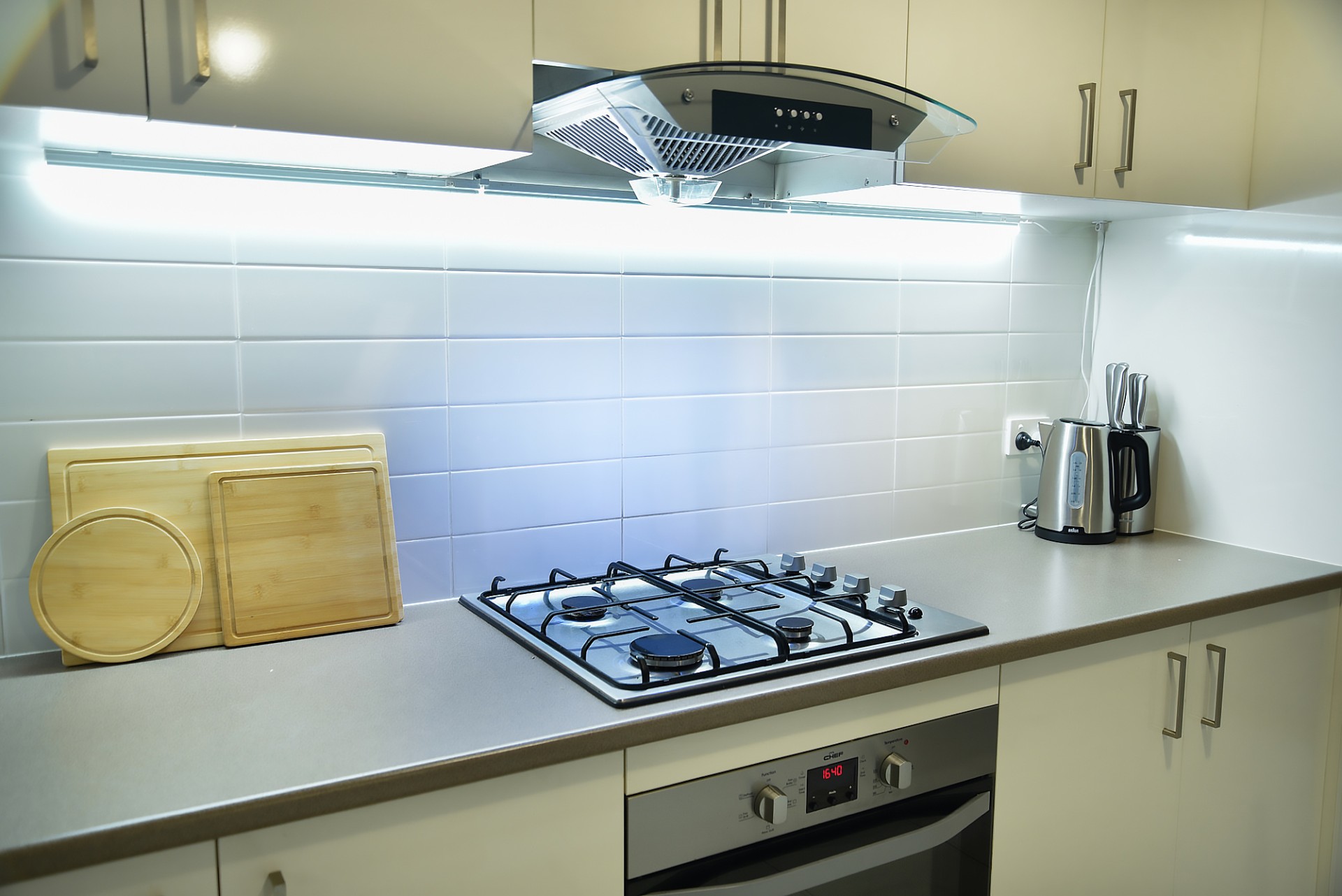 Modern open‑plan kitchen with stone benchtops, stainless steel appliances, and breakfast bar