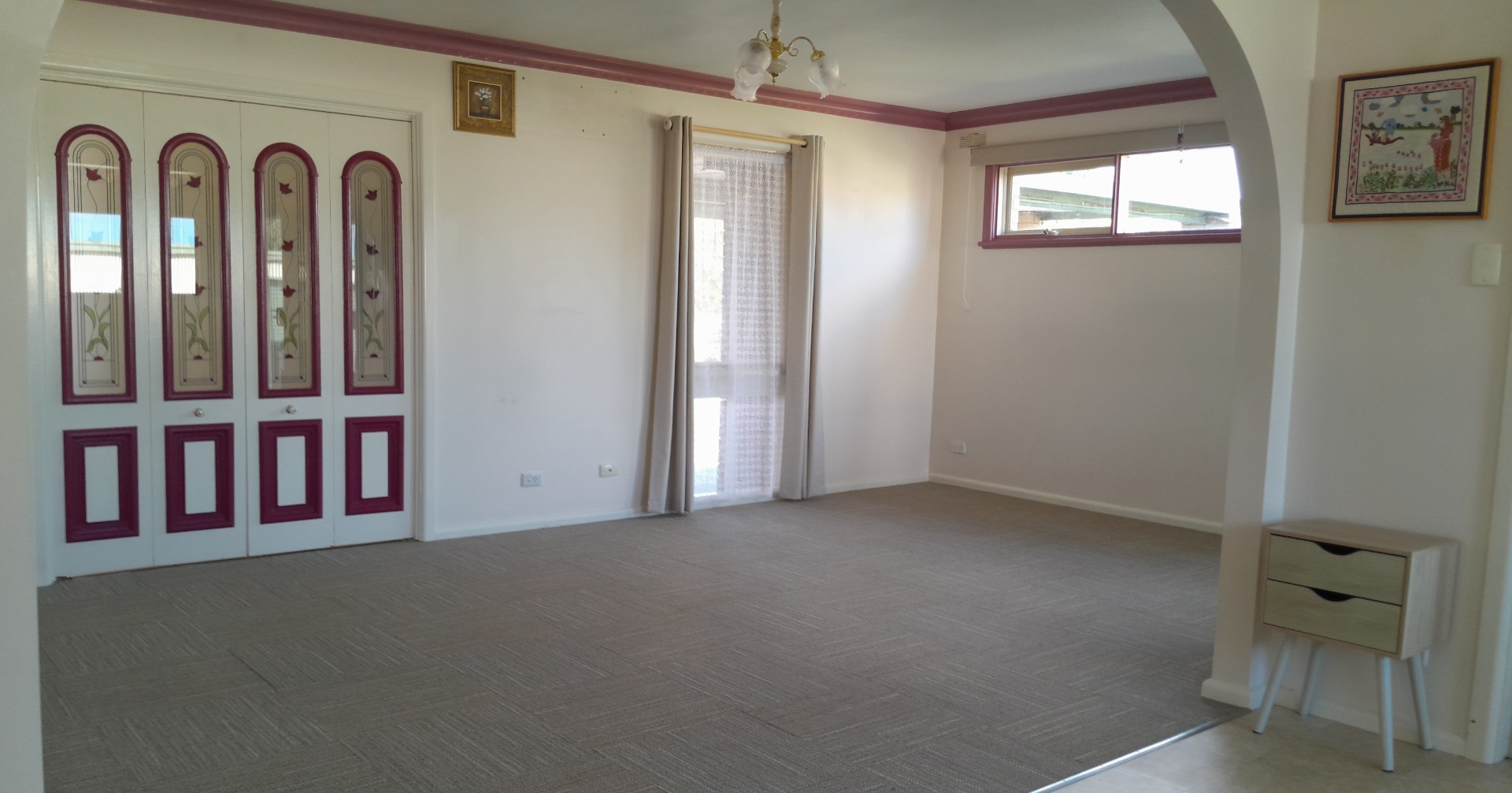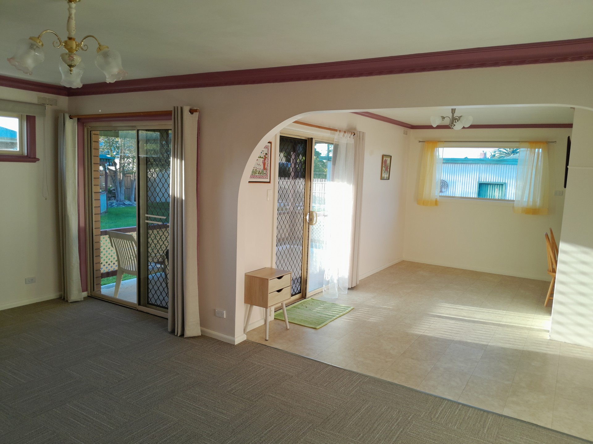 Open plan living/dining room with new carpet.