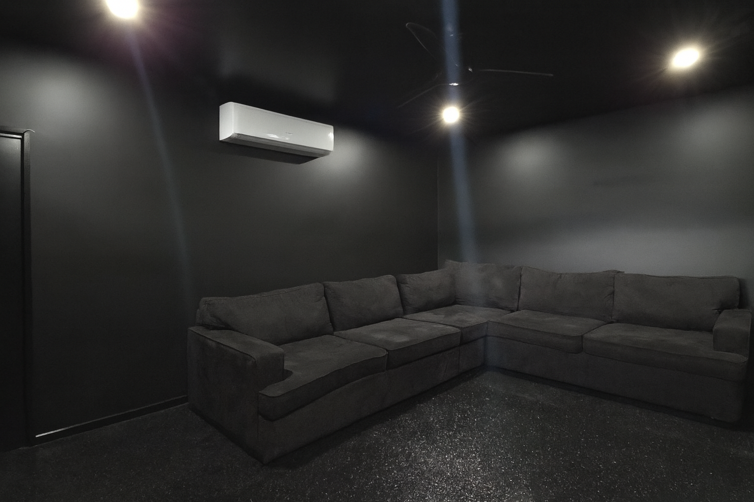 • Built-in front carport / Dedicated media room with black-out design, dimmable lights, and a stunning black & silver-speck concrete floor. Conversion offers a private retreat or home theatre