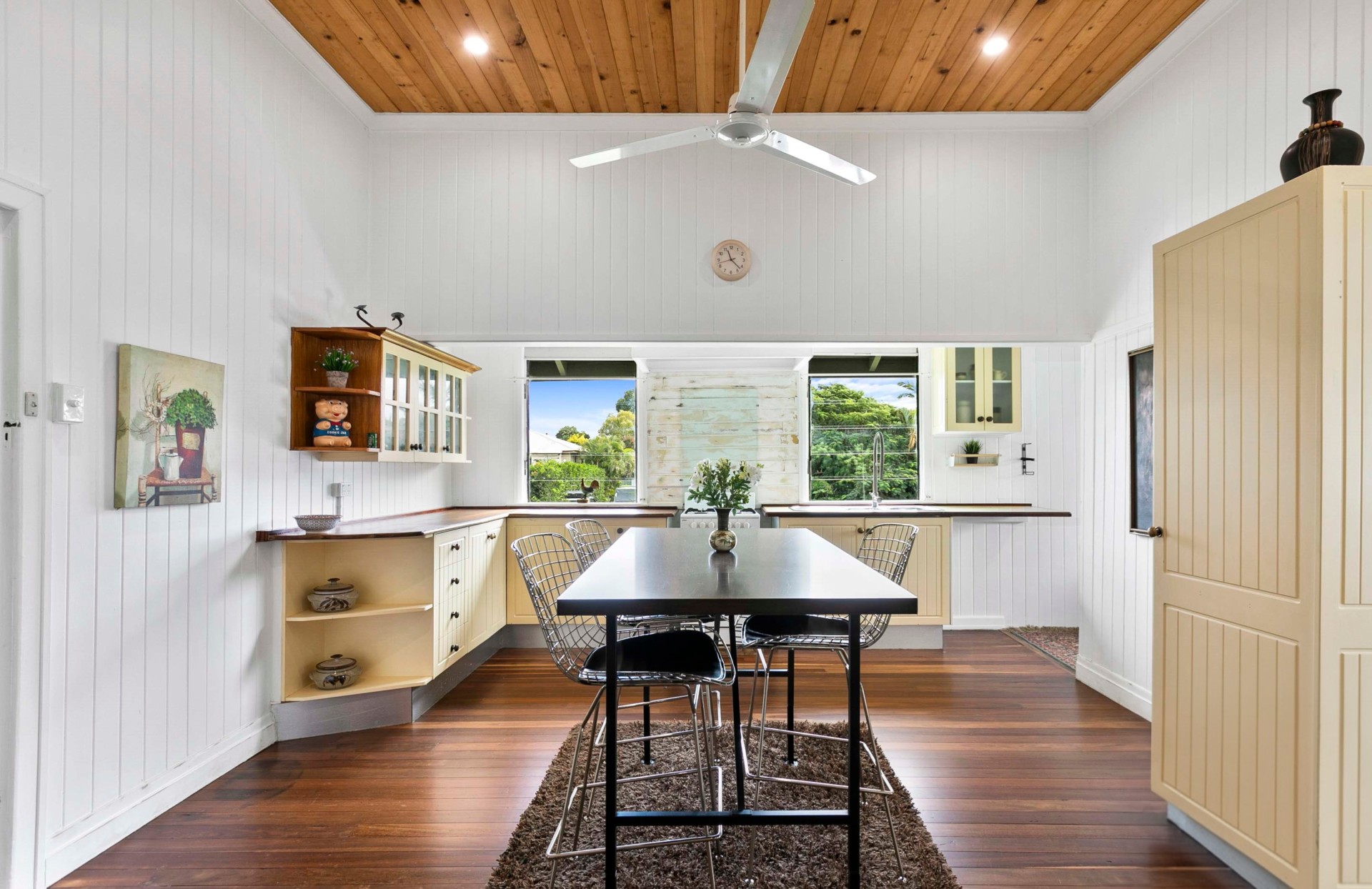The calm tranquil and open plan living spaces allows connection for all the family. Sunroom for slow morning coffee or quiet evenings watching the neighbourhood soften into dusk, 4 large bedrooms, bathroom with bath and shower, 2nd toilet and hand basin for family convenience. Kitchen with gas cooking and 2nd kitchen/ pantry with electric cooking.