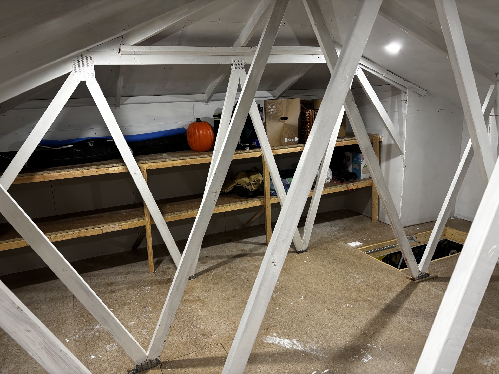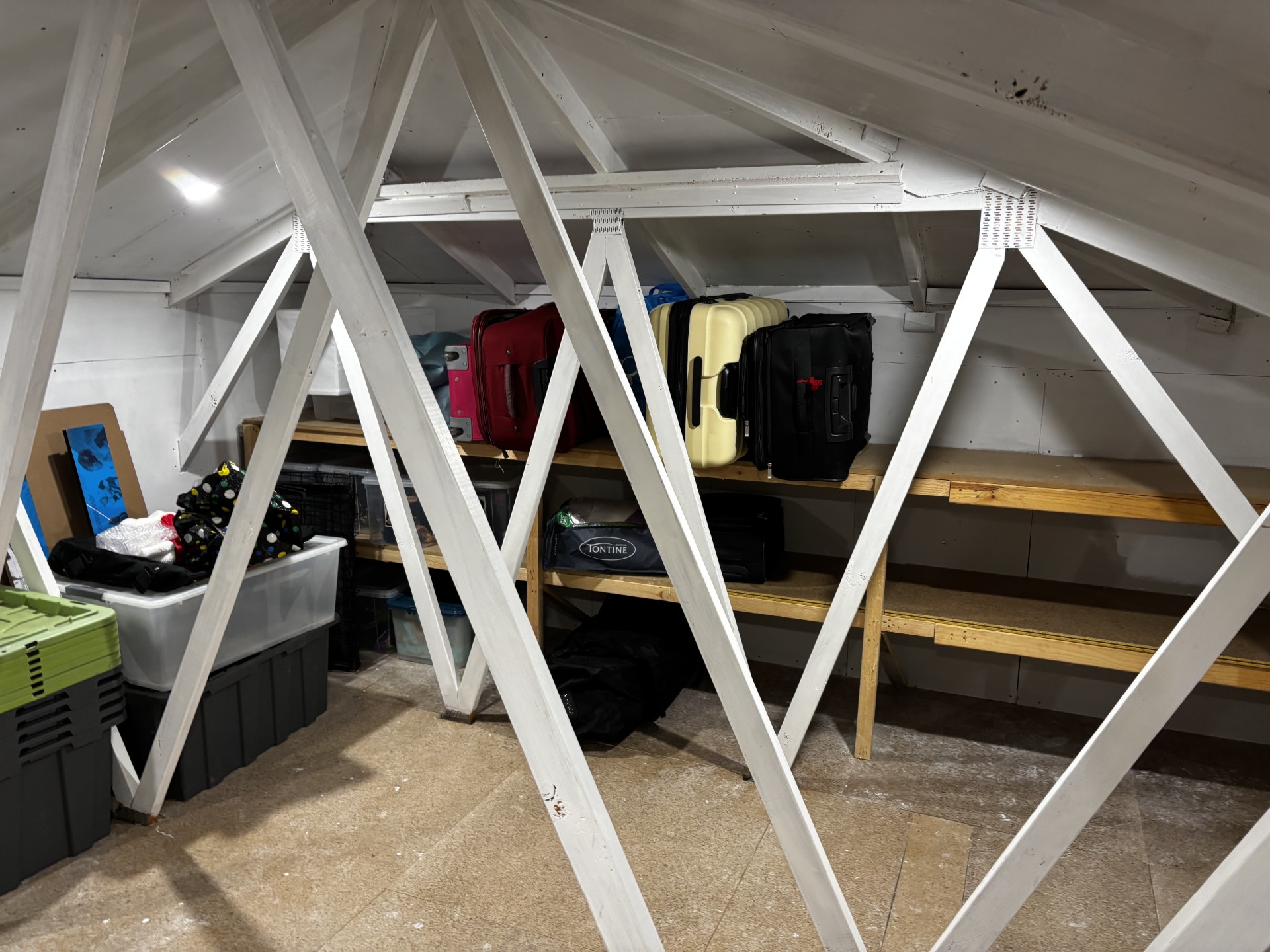 Large attic storage area with shelving