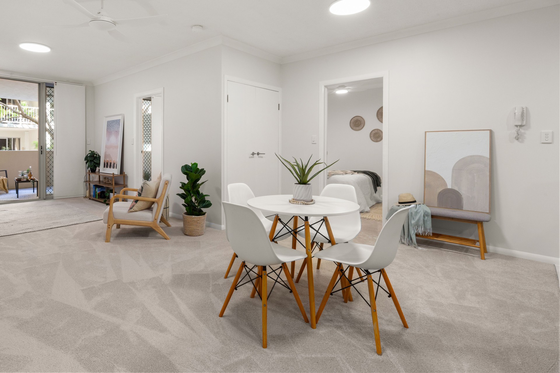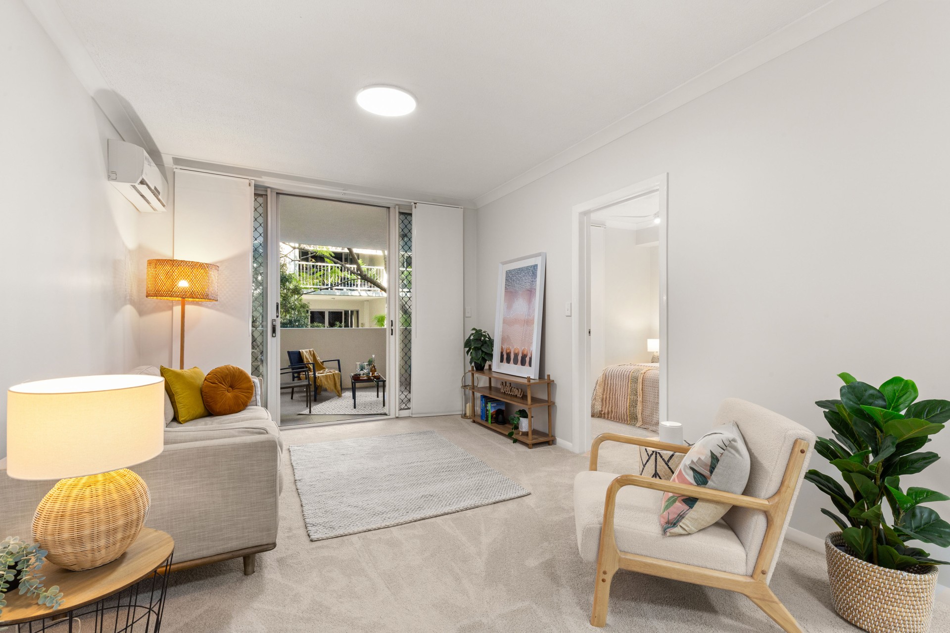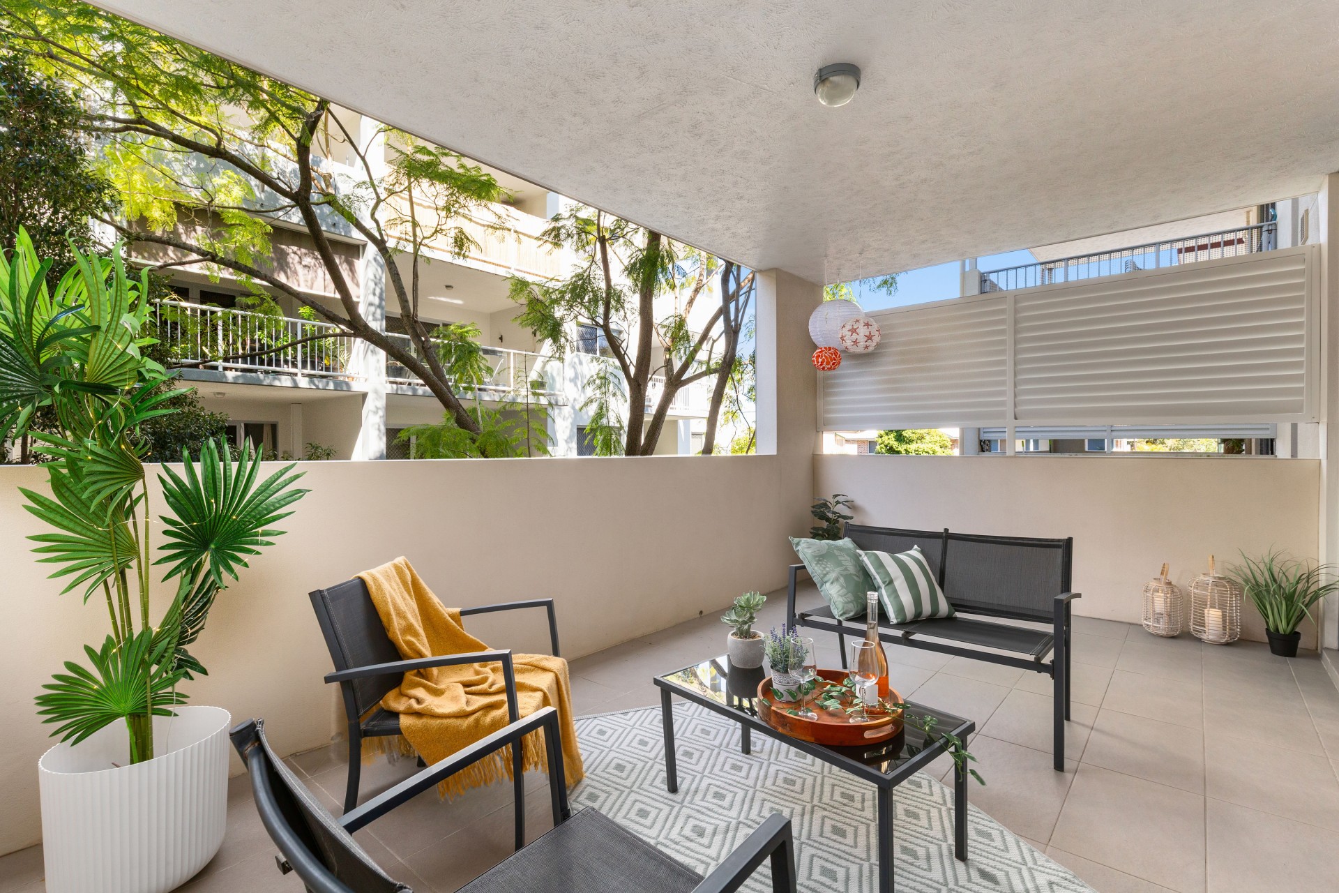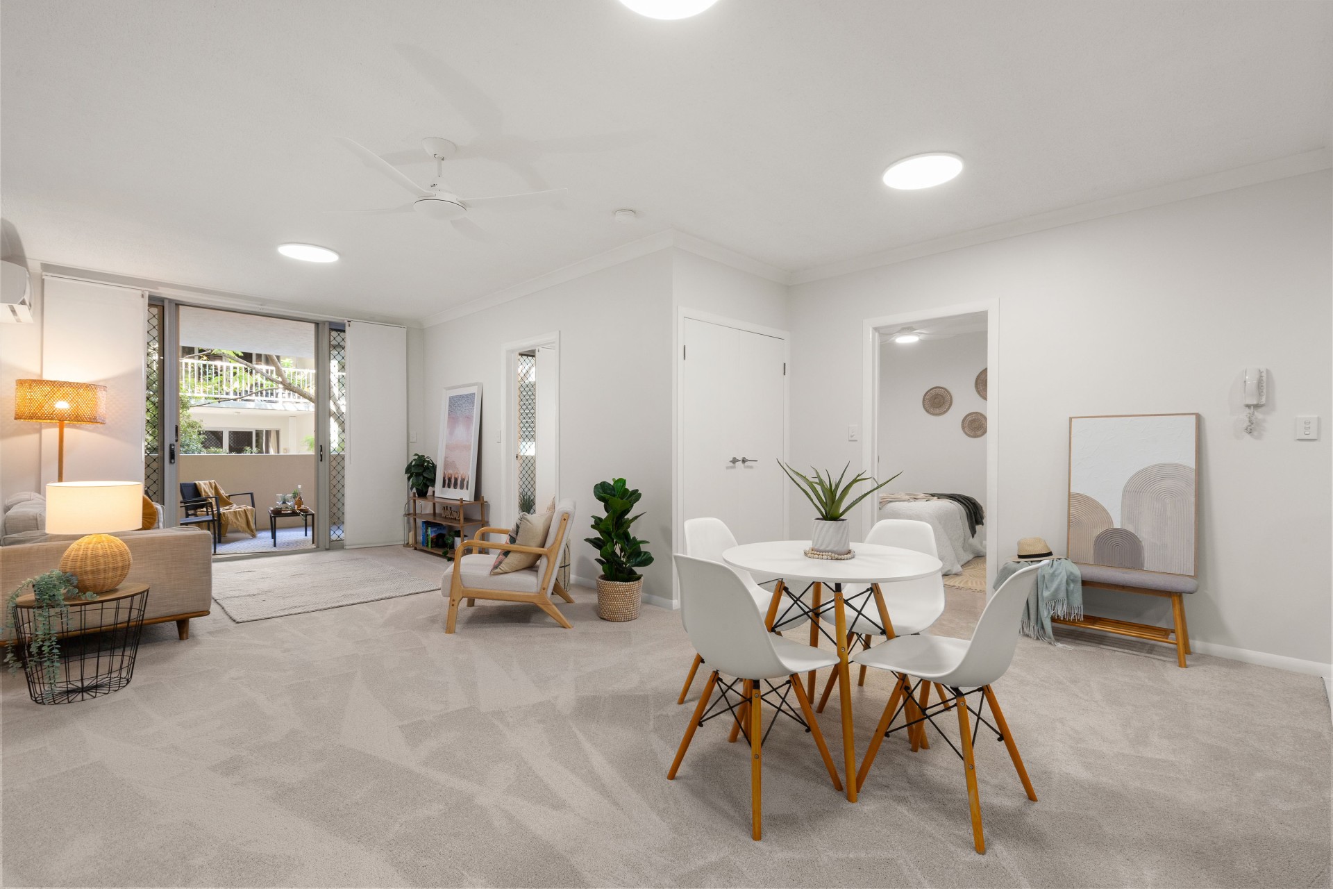 -Open plan living and dining flowing to a private balcony surrounded by greenery