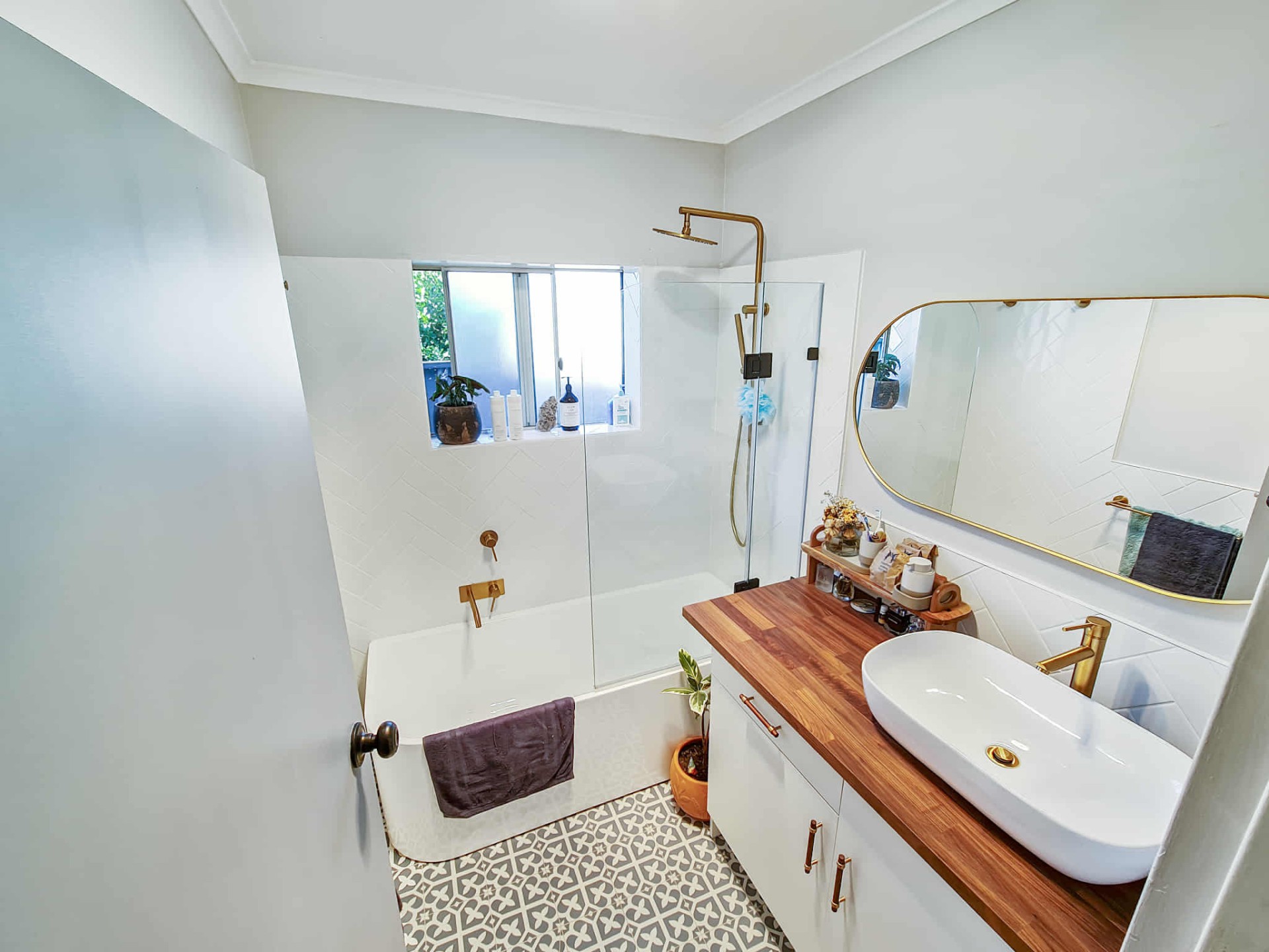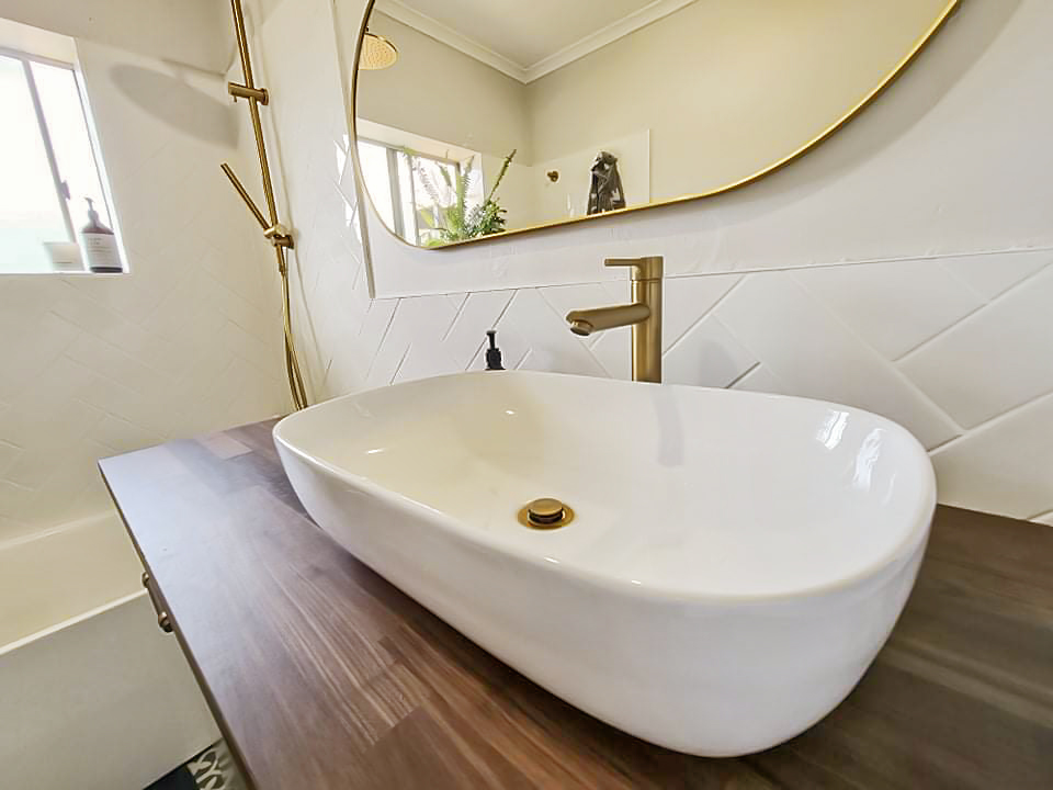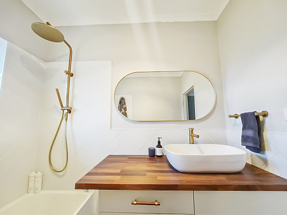 Modern bathroom with brushed gold fittings, bath, shower & above-bench basin