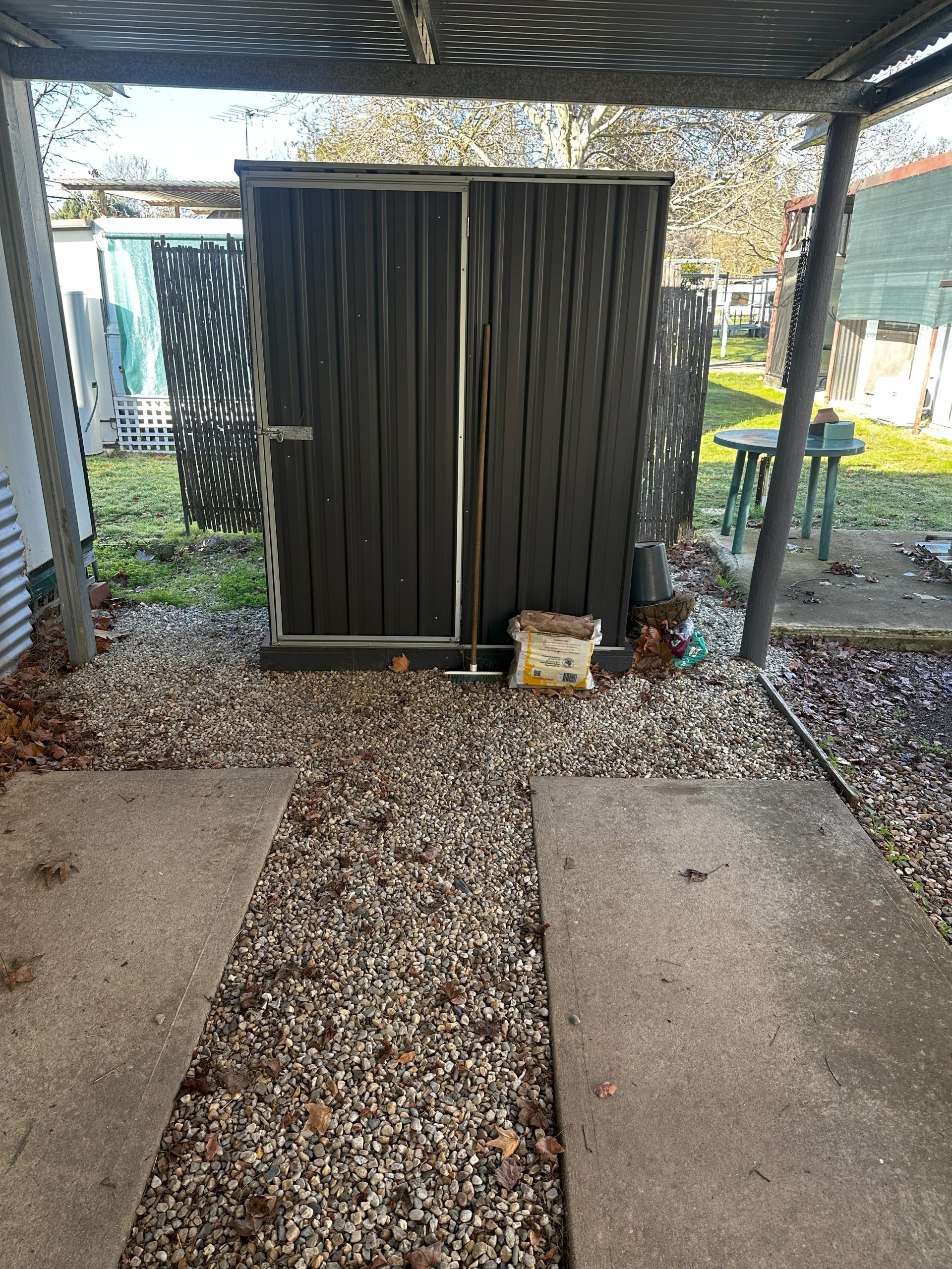 Long single carport + garden shed
