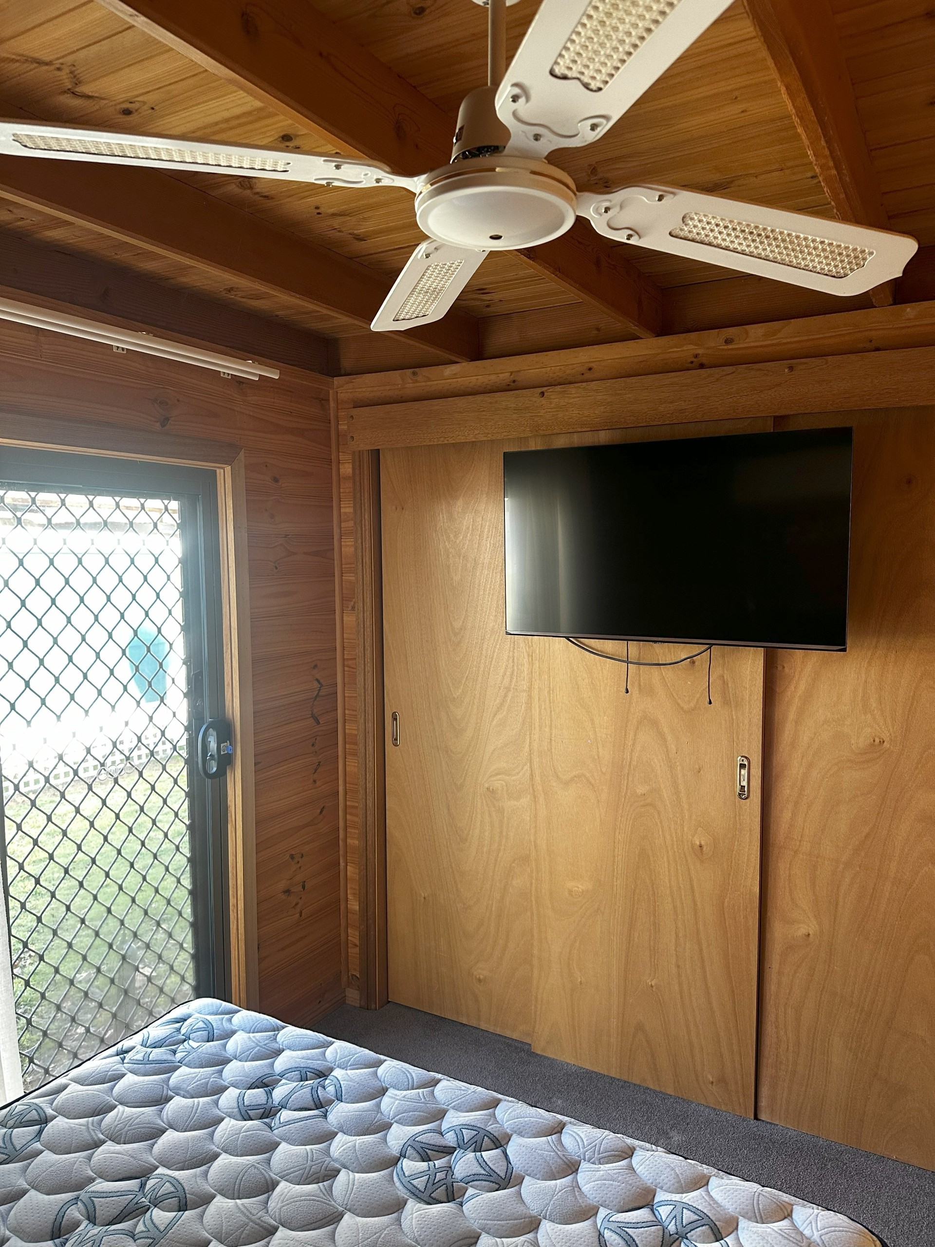 Queen bedroom - built-ins, TV, sliding door, ceiling fan & A/C