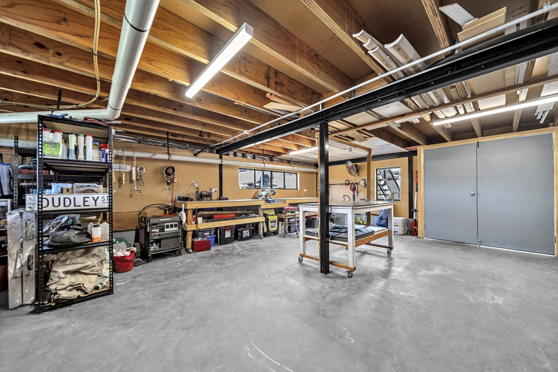 Downstairs, a fully equipped double-doored workshop is a hobbyist's dream. The workspace includes custom-built mobile benches perfectly designed around the drop-saw which is included in this sale along with the 7000w generator.