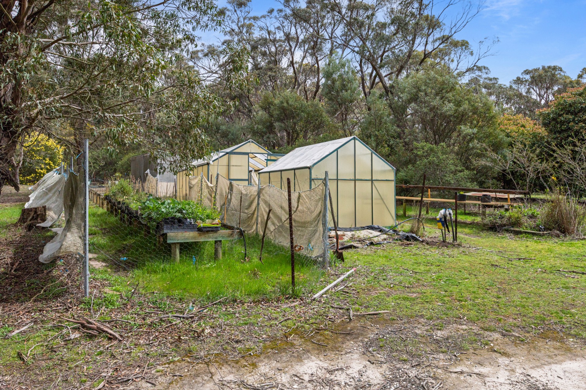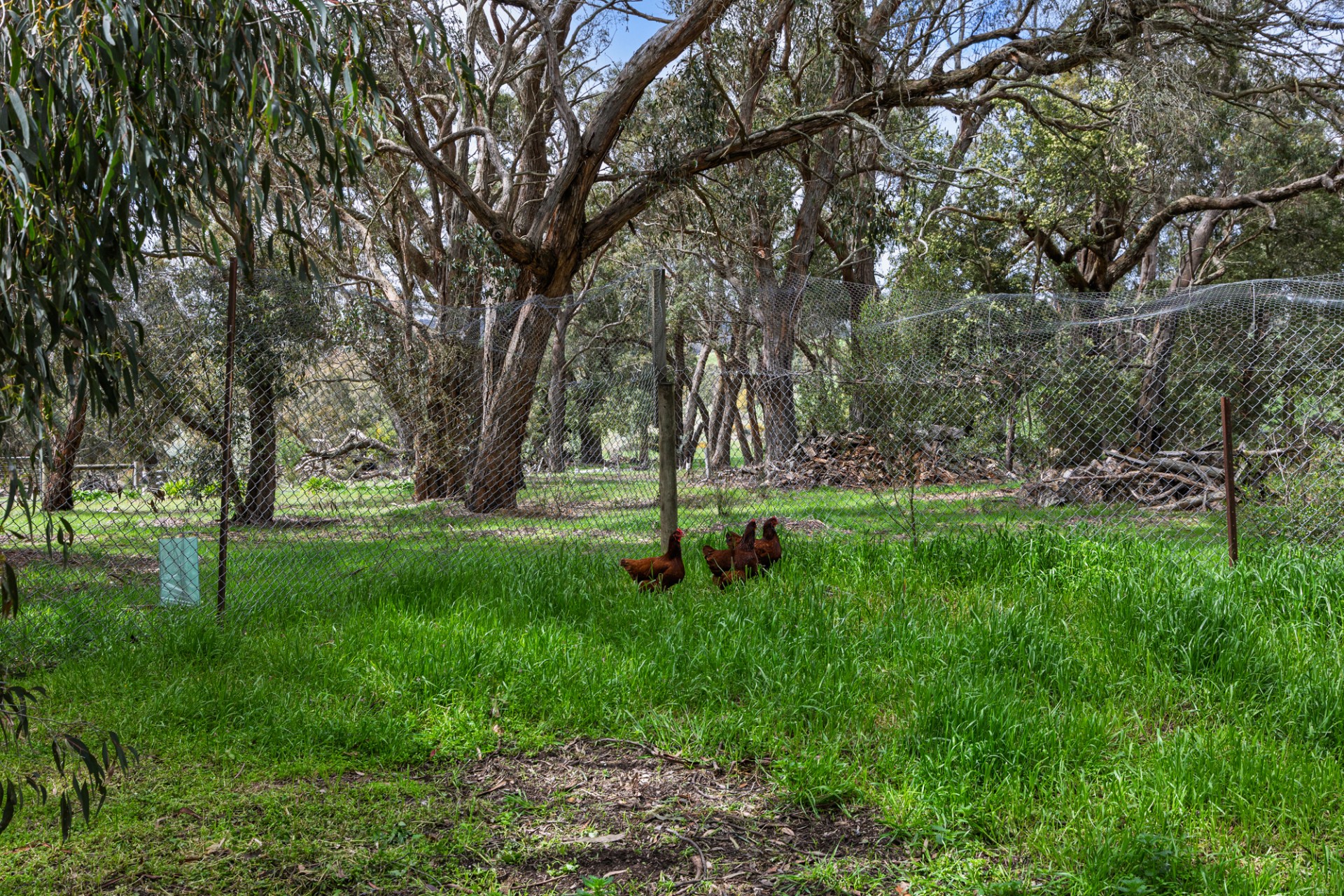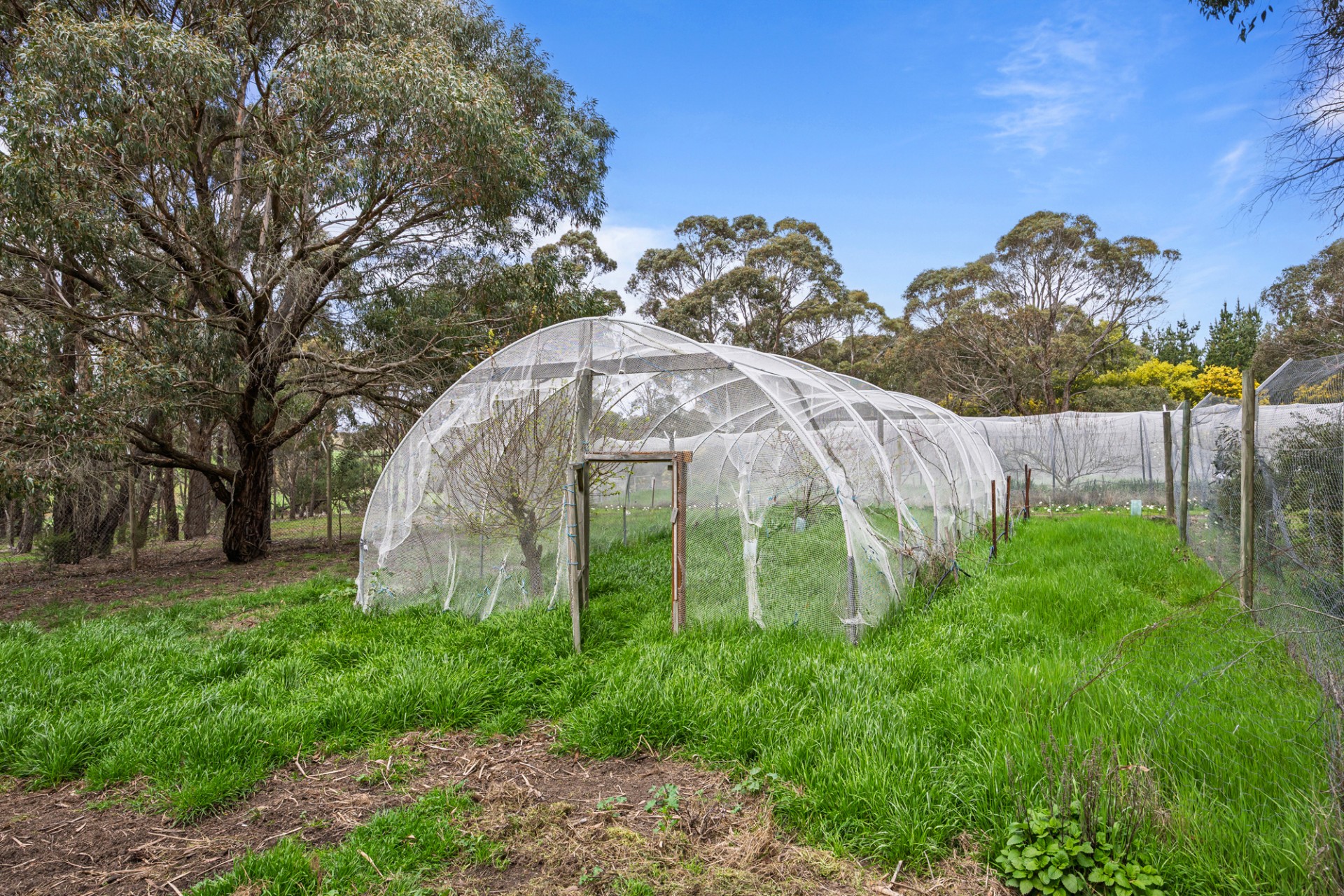 • Netted gardens and orchards, fox proof free range chook yard.