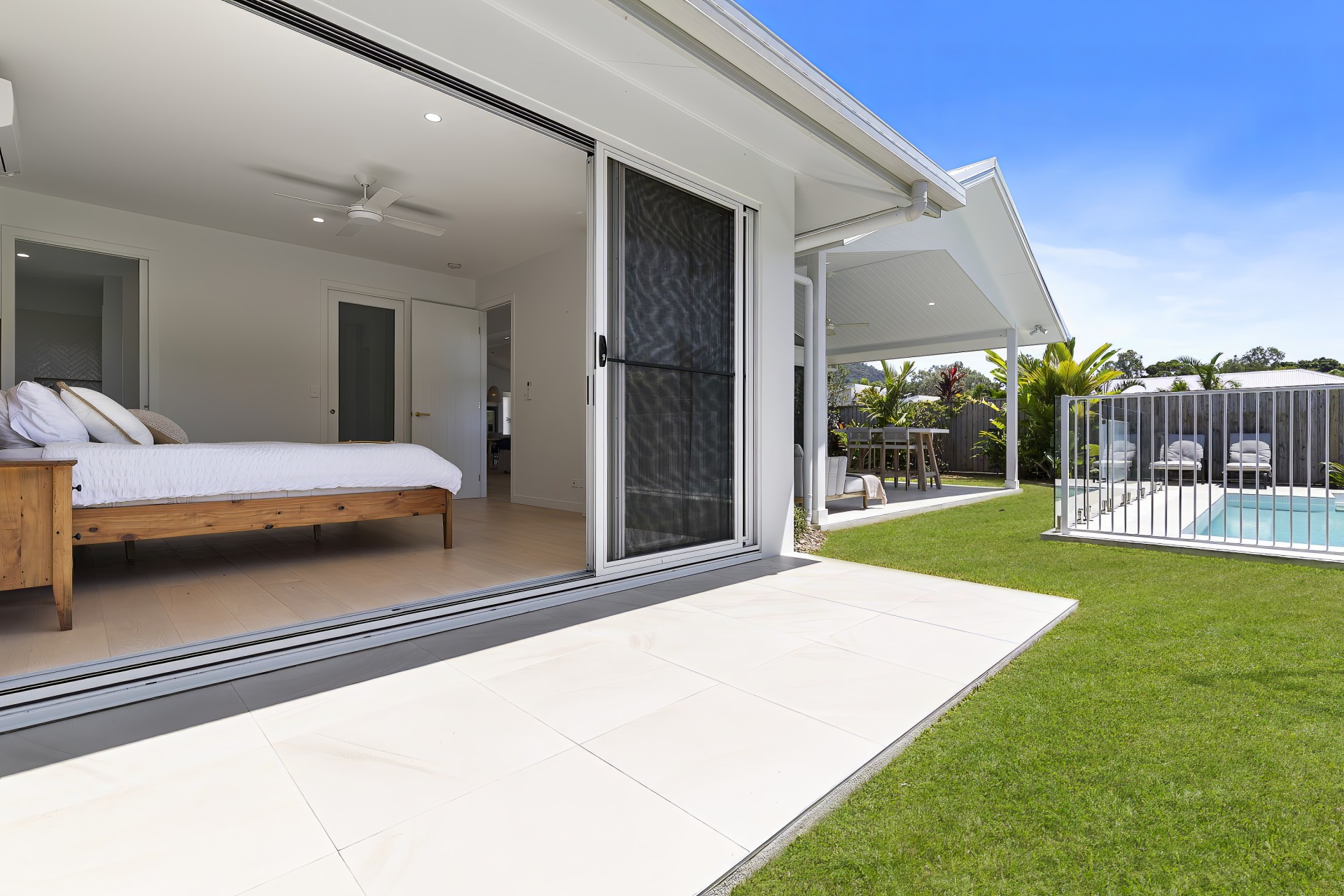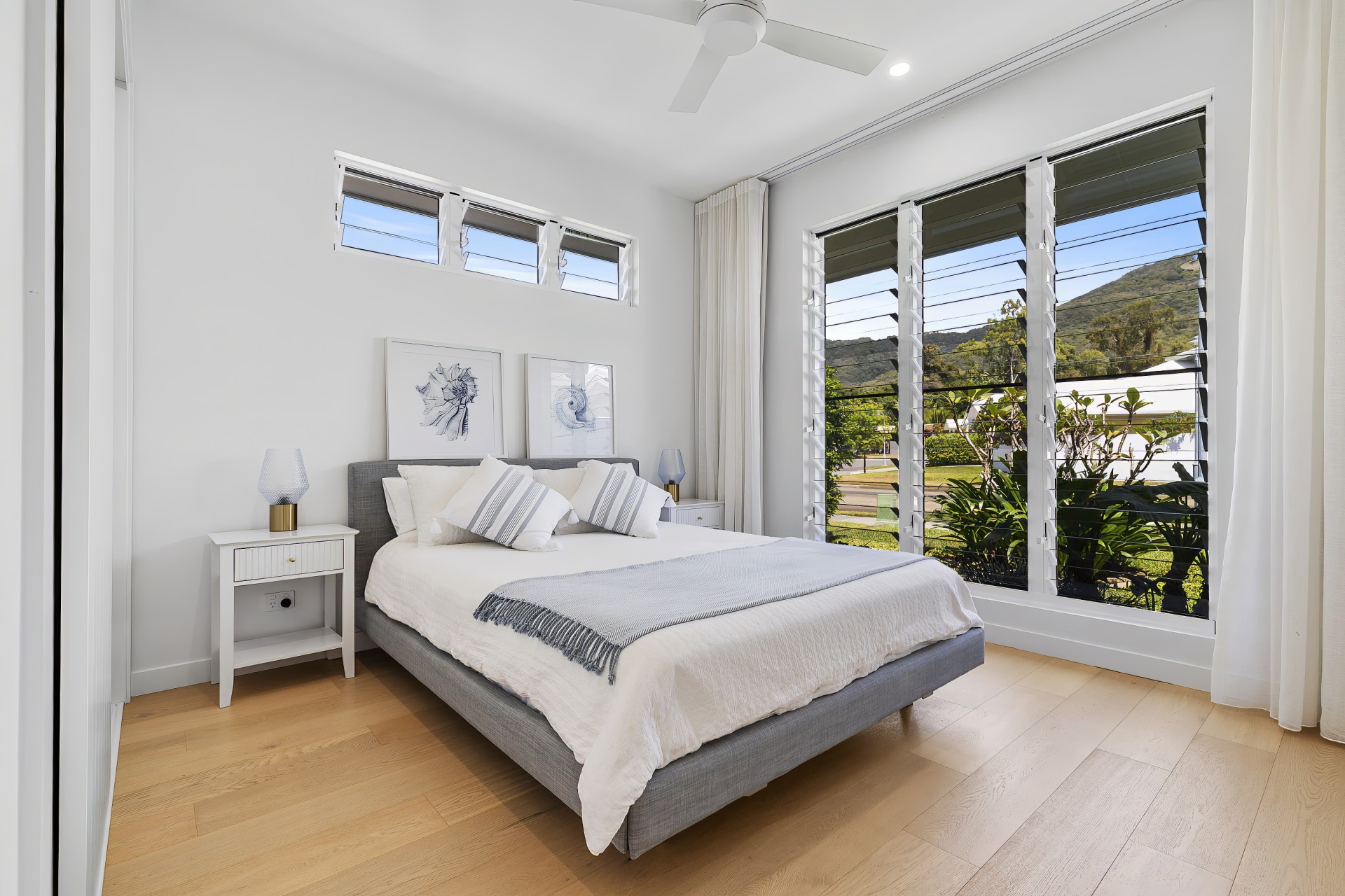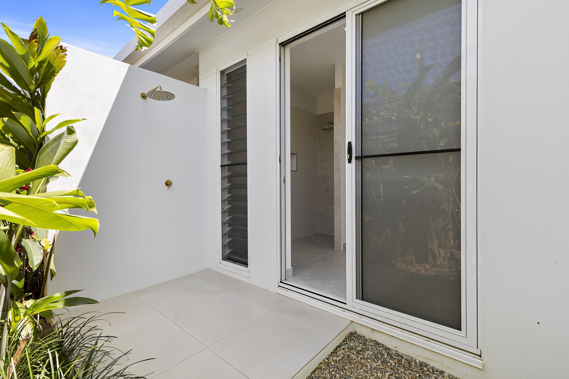 The master suite is thoughtfully positioned for privacy and relaxation, complete with a walk-in robe, elegant ensuite with dual vanity, outdoor shower access with hot water, and louvre windows to capture ocean breezes.