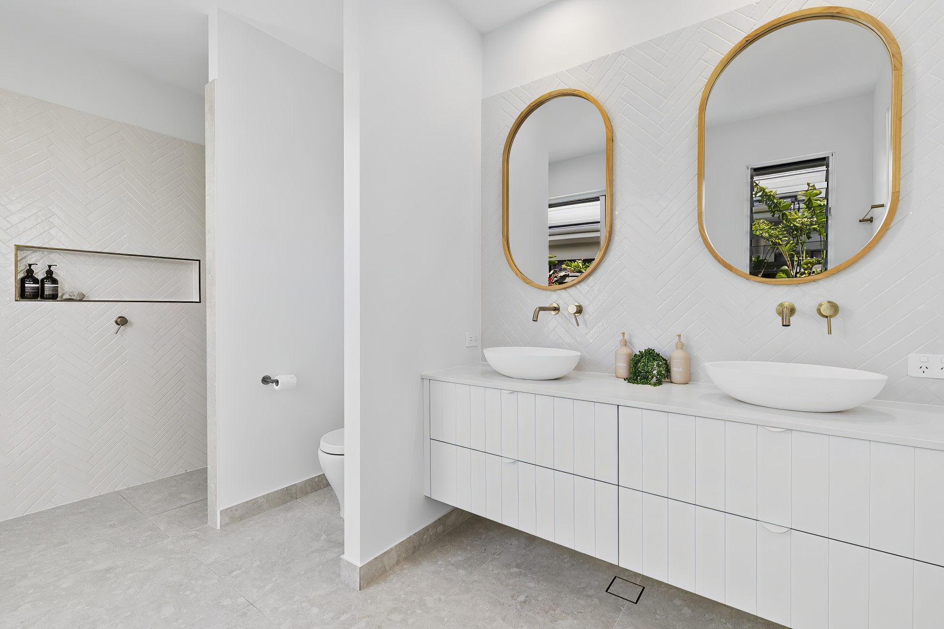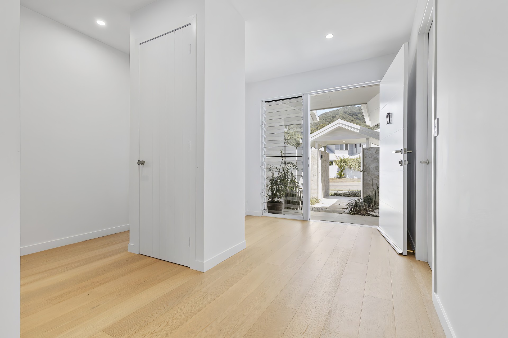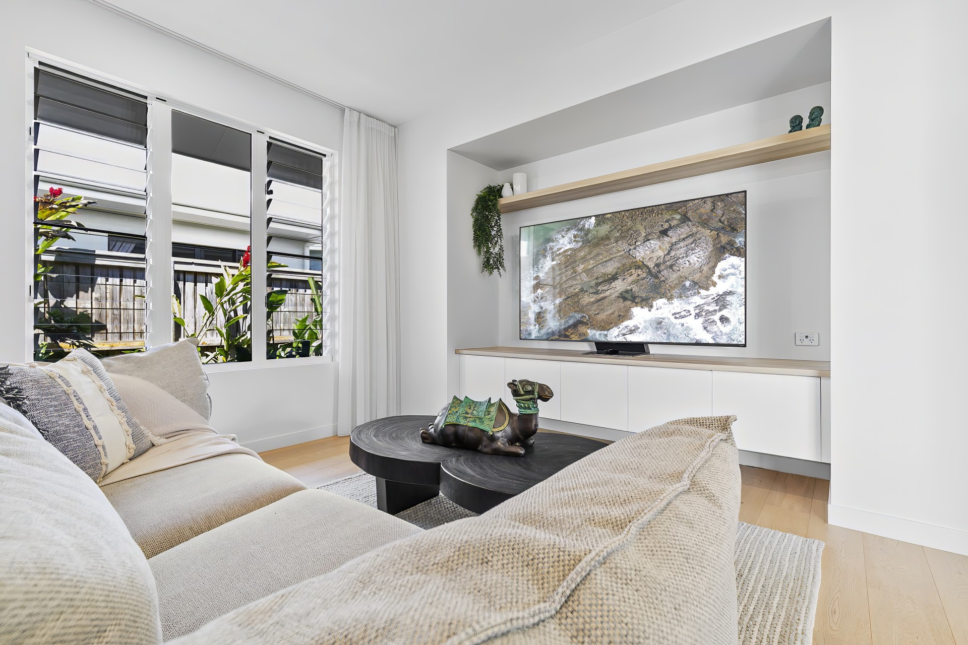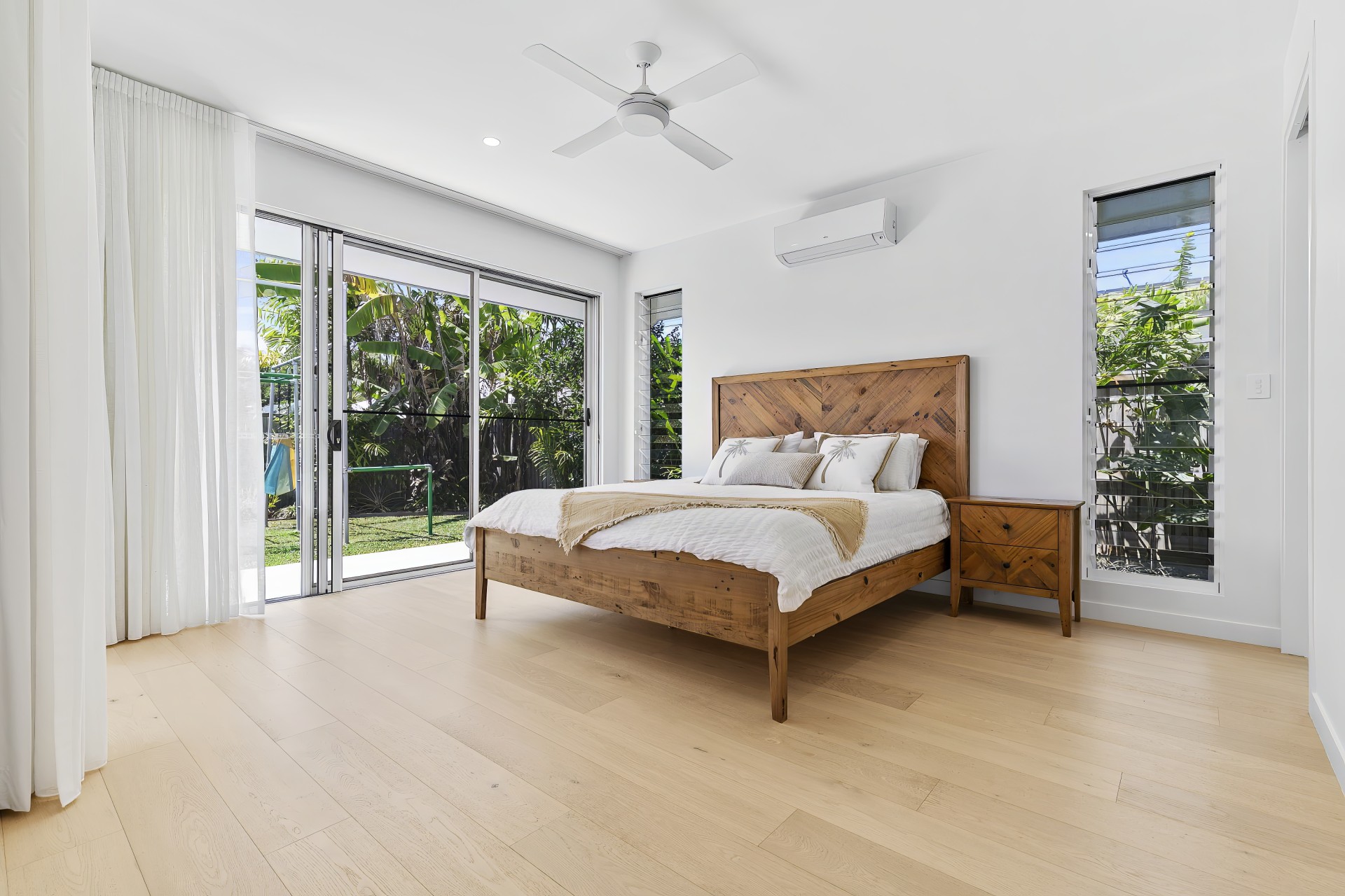 The master suite is thoughtfully positioned for privacy and relaxation, complete with a walk-in robe, elegant ensuite with dual vanity, outdoor shower access with hot water, and louvre windows to capture ocean breezes.