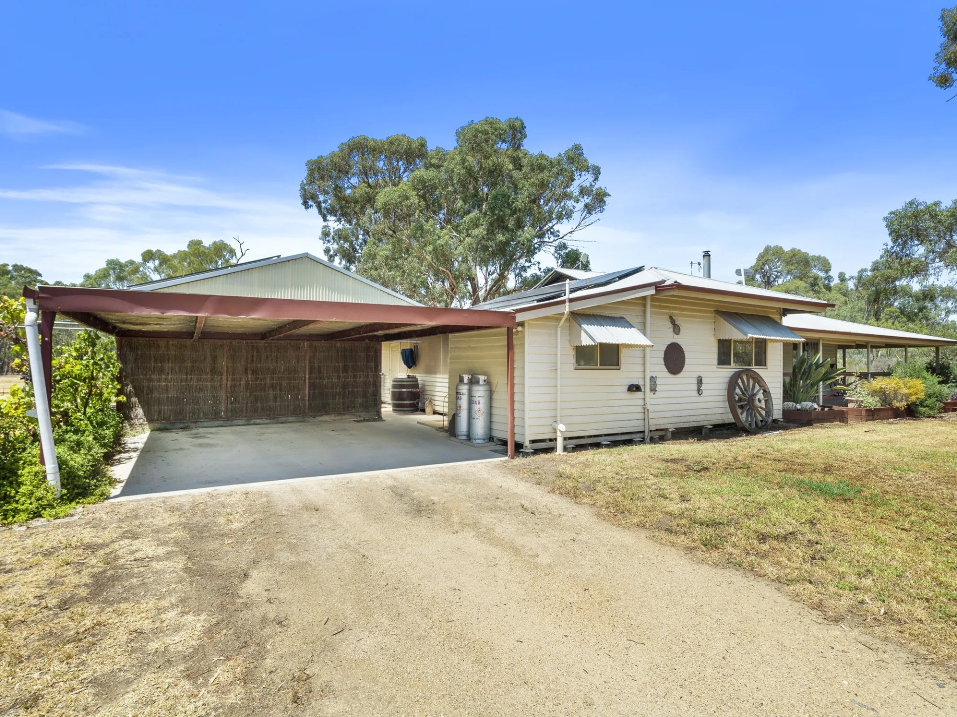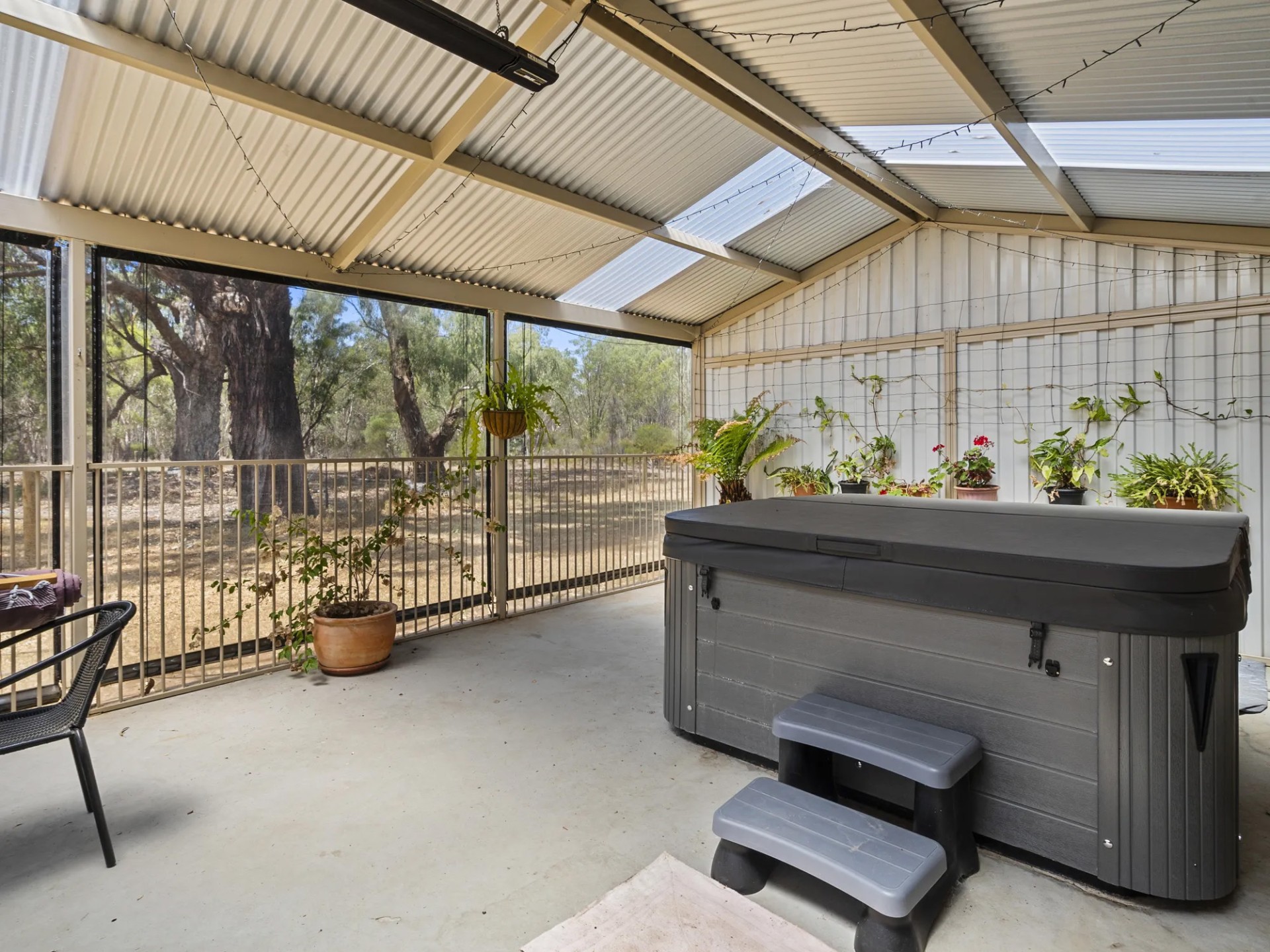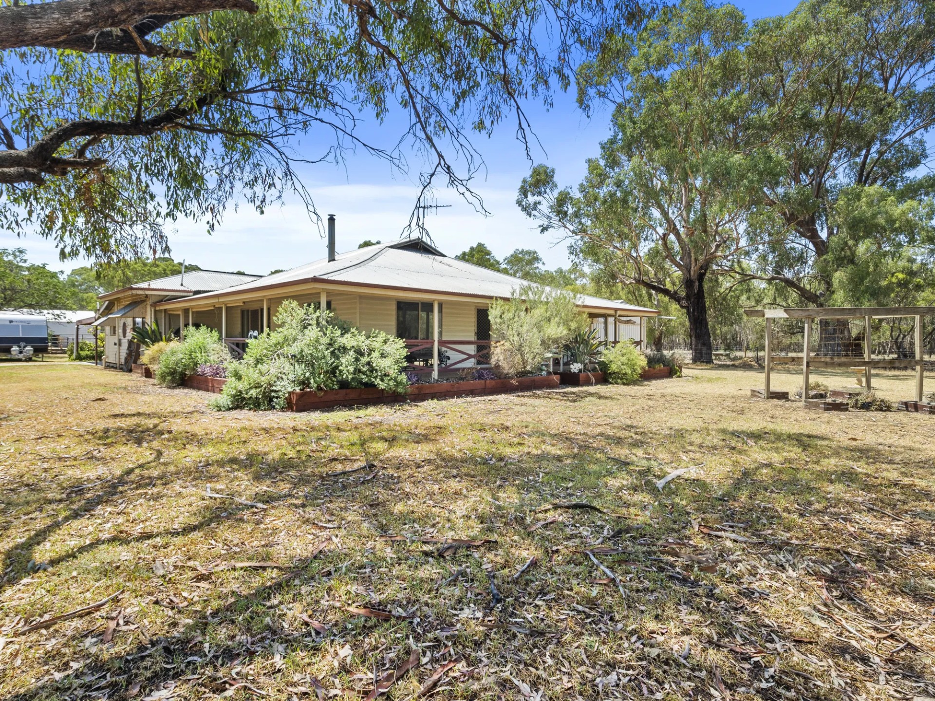 This home with town water connected has 4 bedrooms, 3 bathrooms, a large kitchen/family room with split system, separate lounge with ducted wood heater to the bedrooms. The large laundry also has a bath and toilet. The master bedroom with walk in robe and ensuite opens to the parents retreat/fernery with 6 seater spa. Evaporative cooling is ducted throughout the house. There are 8 foot verandahs on 3 sides.