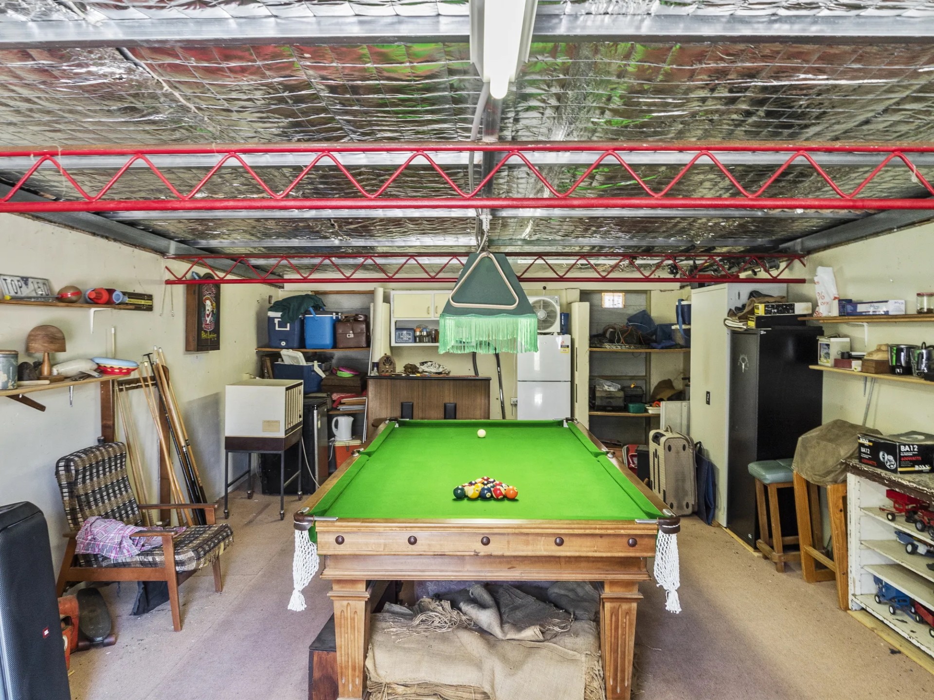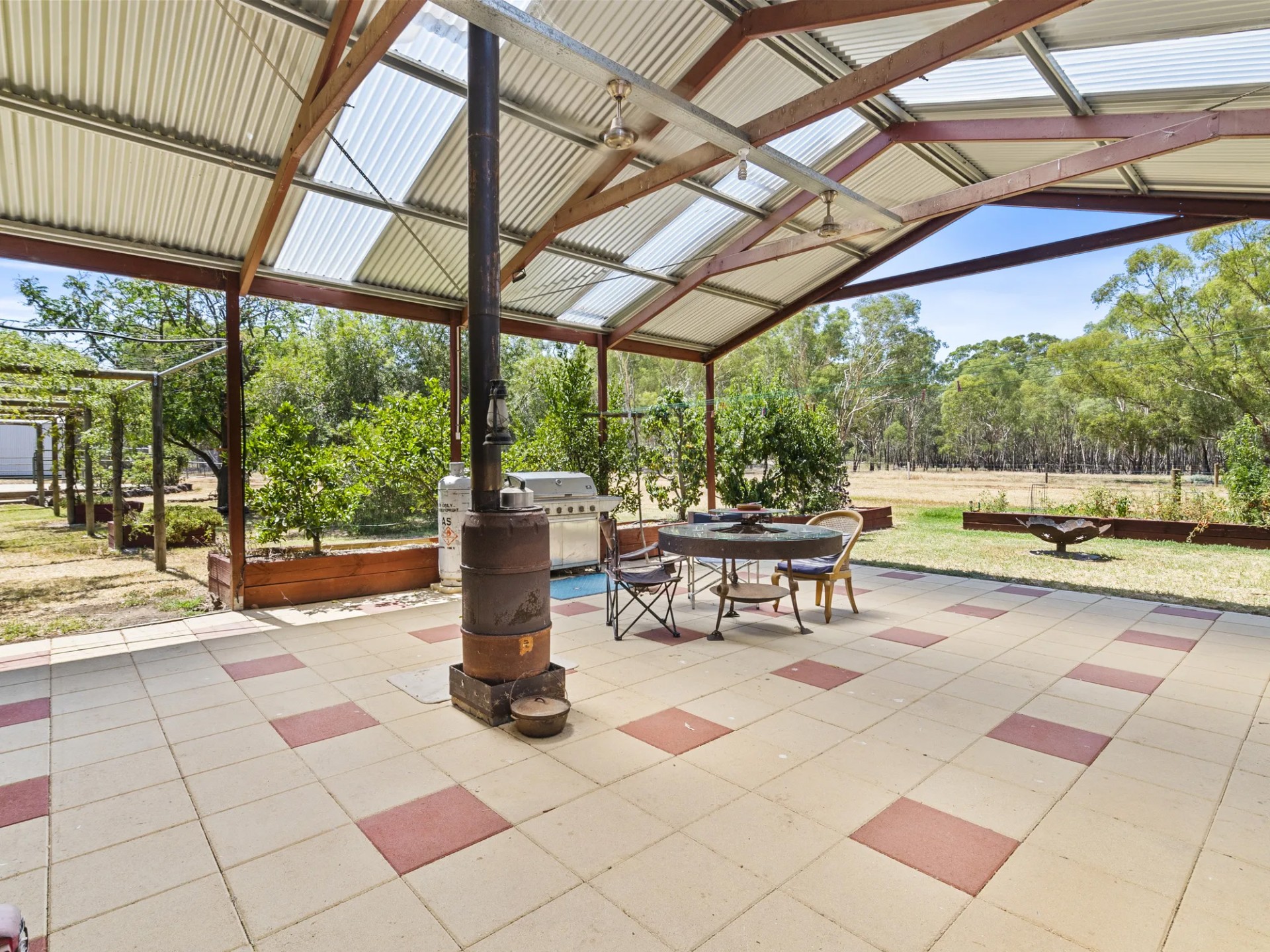 Outside the entertaining area has a pot belly for winter and overhead fans with misting sprays in summer. The separate 6x10 mancave with heater is big enough for the pool table and bar. A generous lockable