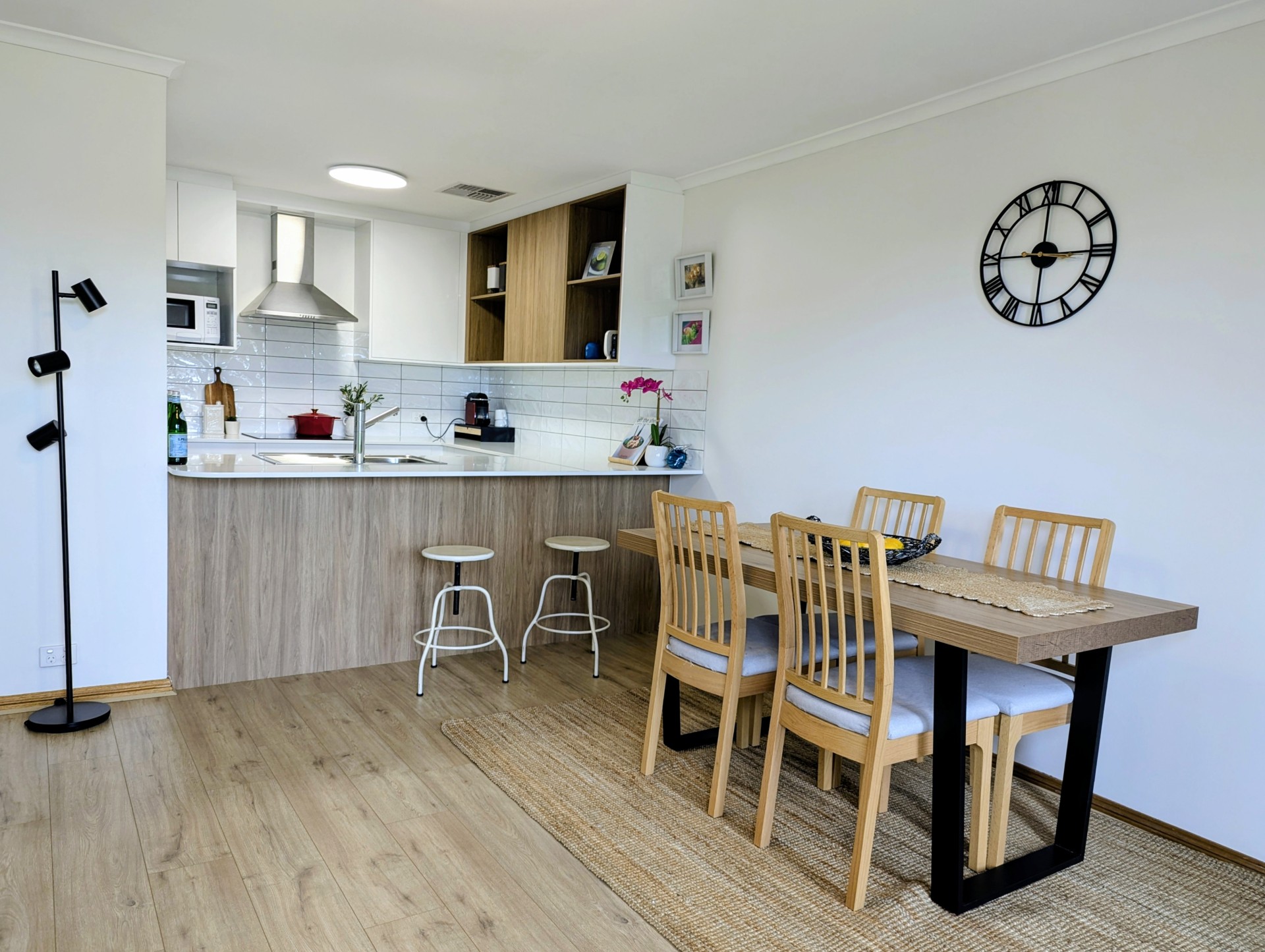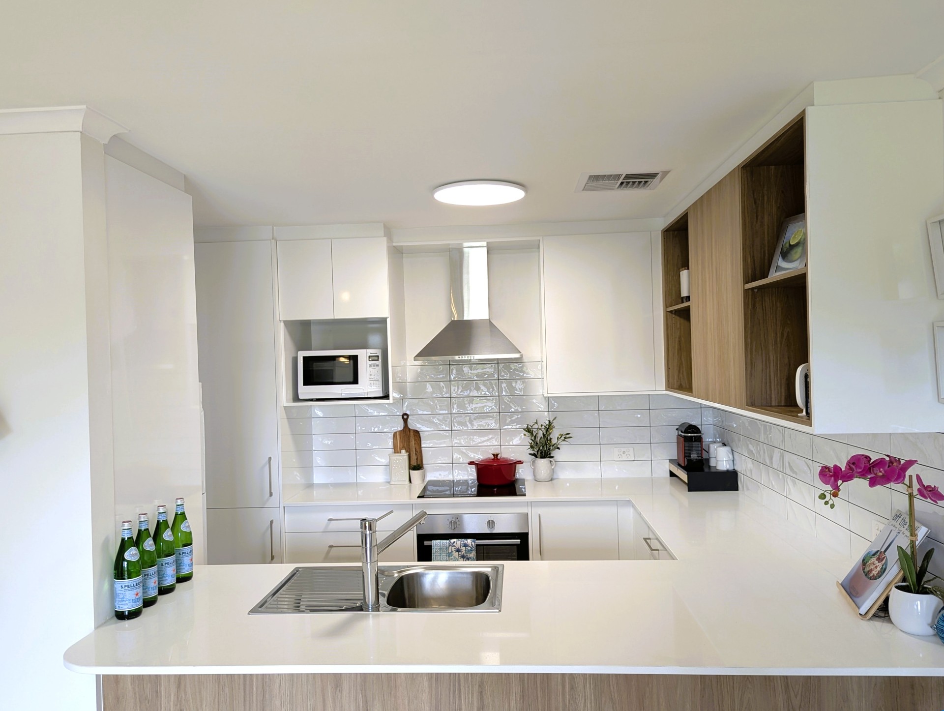 The sleek Wallspan kitchen, completed in September 2025, features stone benchtops, clever storage, and new stainless steel appliances including an oven, dishwasher, and induction cooktop. Dimmable, adjustable lighting, USB outlets, and extra power points complete the fully upgraded space.