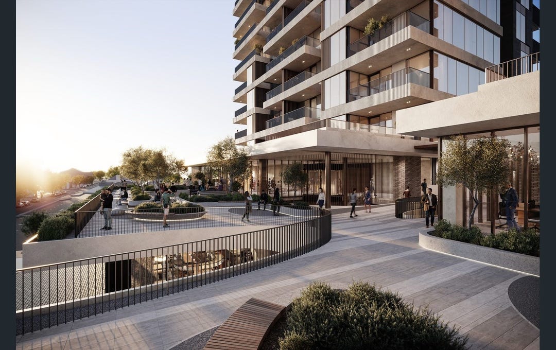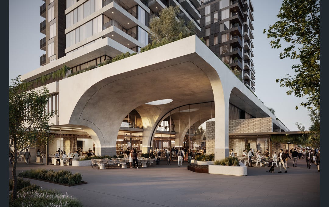 A curated retail precinct featuring boutique fashion labels, Messina gelato, Shadow Baking pastries, wellness services (radiology, pharmacy, allied health), and Hub Australia flexible workspace