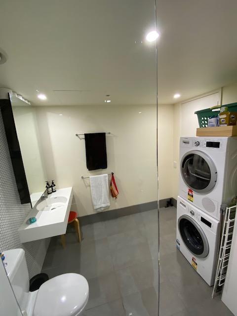 Spacious bathroom with laundry facilities: washer, condenser dryer, iron, and ironing board