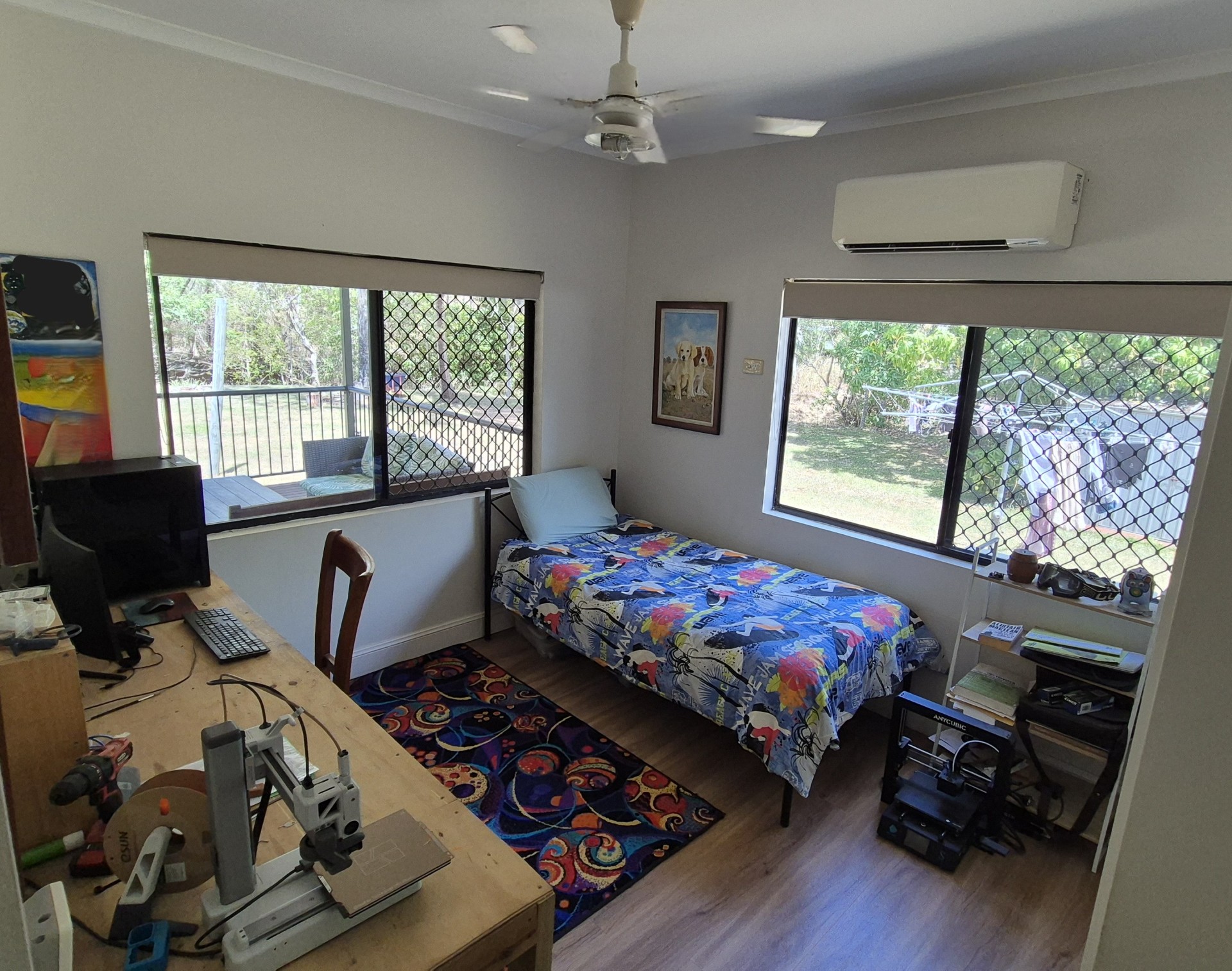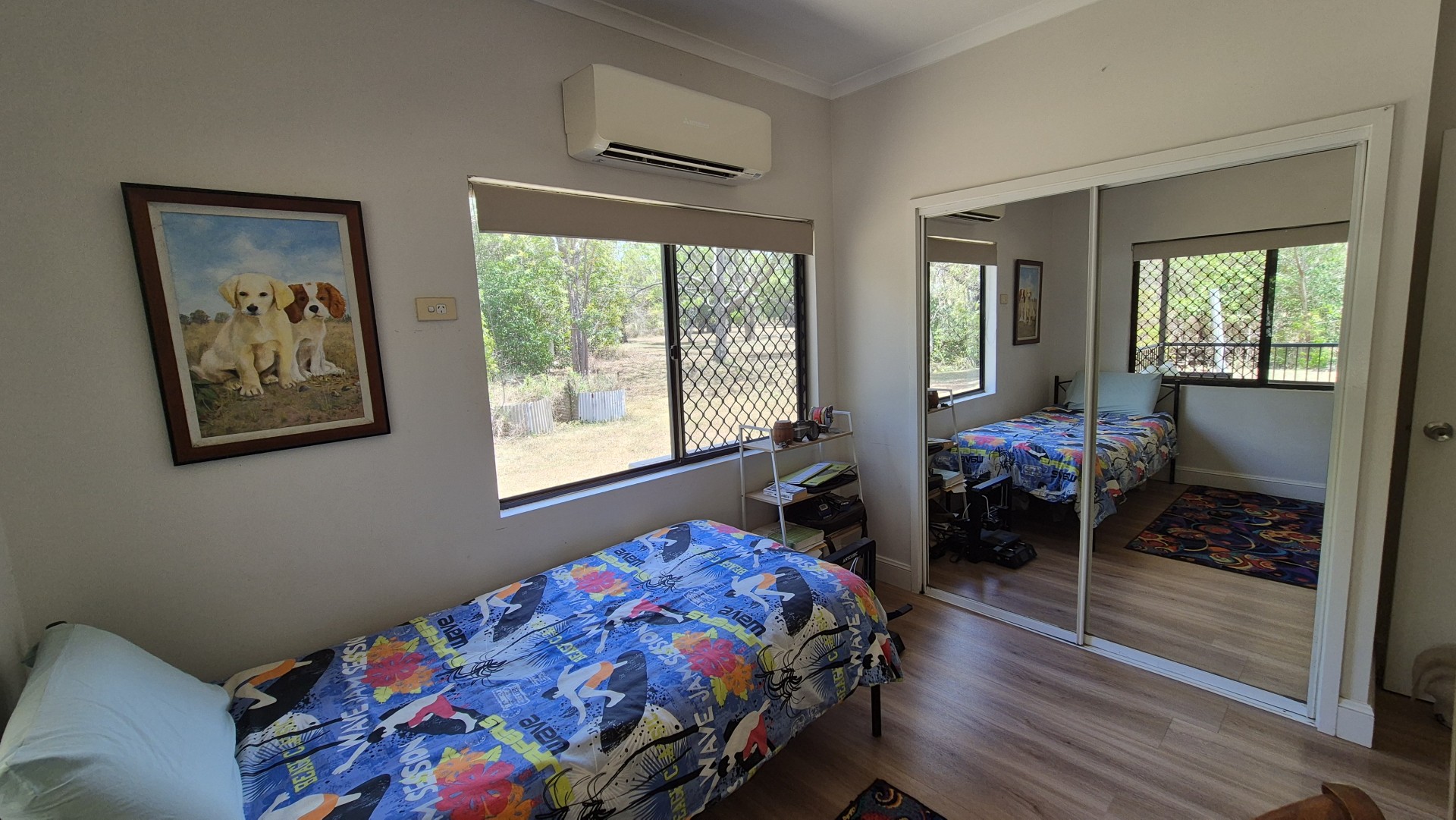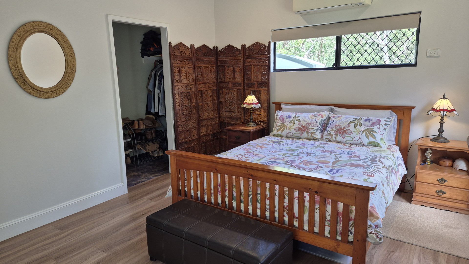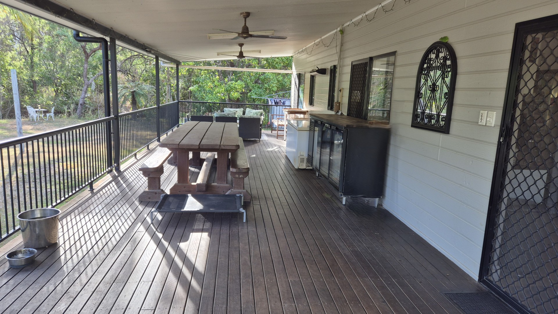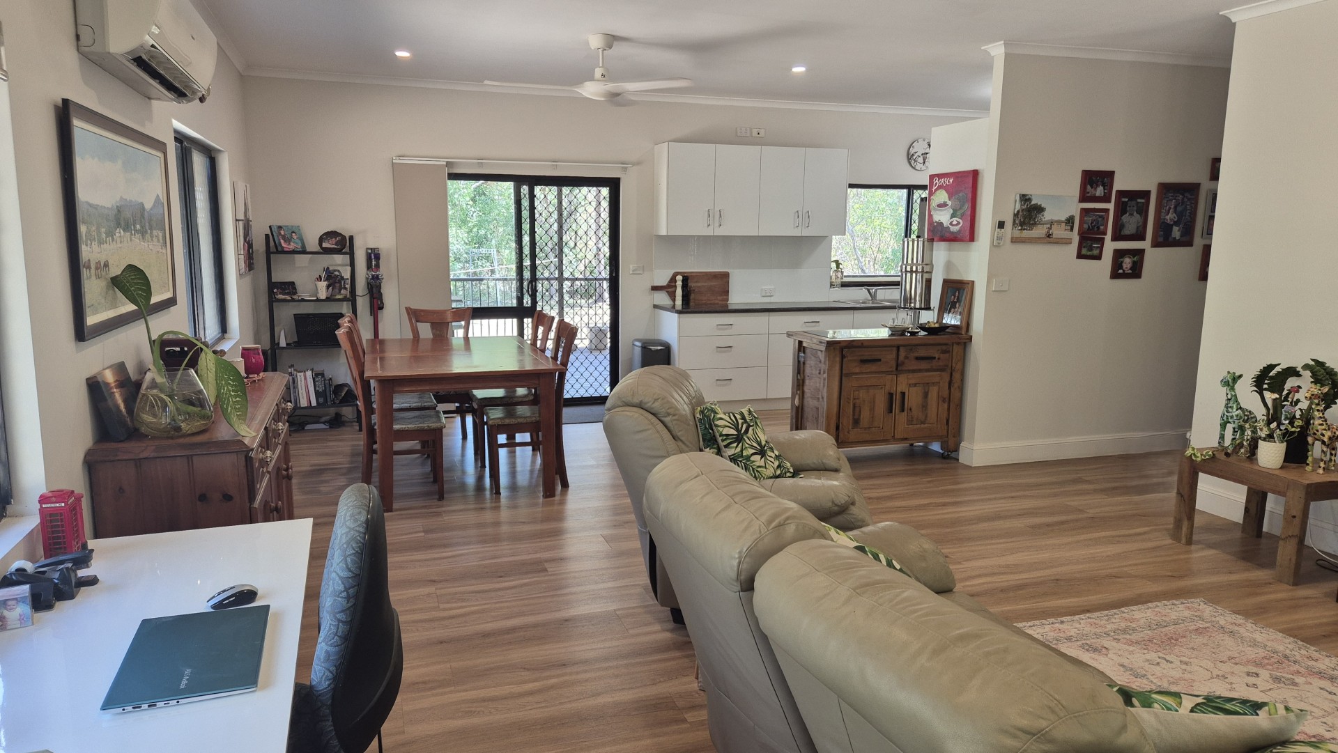 Set on 3.7 acres, the three-bedroom house is designed for relaxed family living. All bedrooms have built in wardrobes and two of the bedrooms open directly onto the inviting front deck, offering seamless indoor-outdoor flow and tranquil views. All bedrooms, as well as the expansive open plan living and dining area, are fitted with ceiling fans and air conditioning for year-round comfort. The home features a main bathroom equipped with a shower/bath, and toilet, plus the convenience of a separate toilet room. Recently installed kitchen and laundry facilities provide modern practicality.