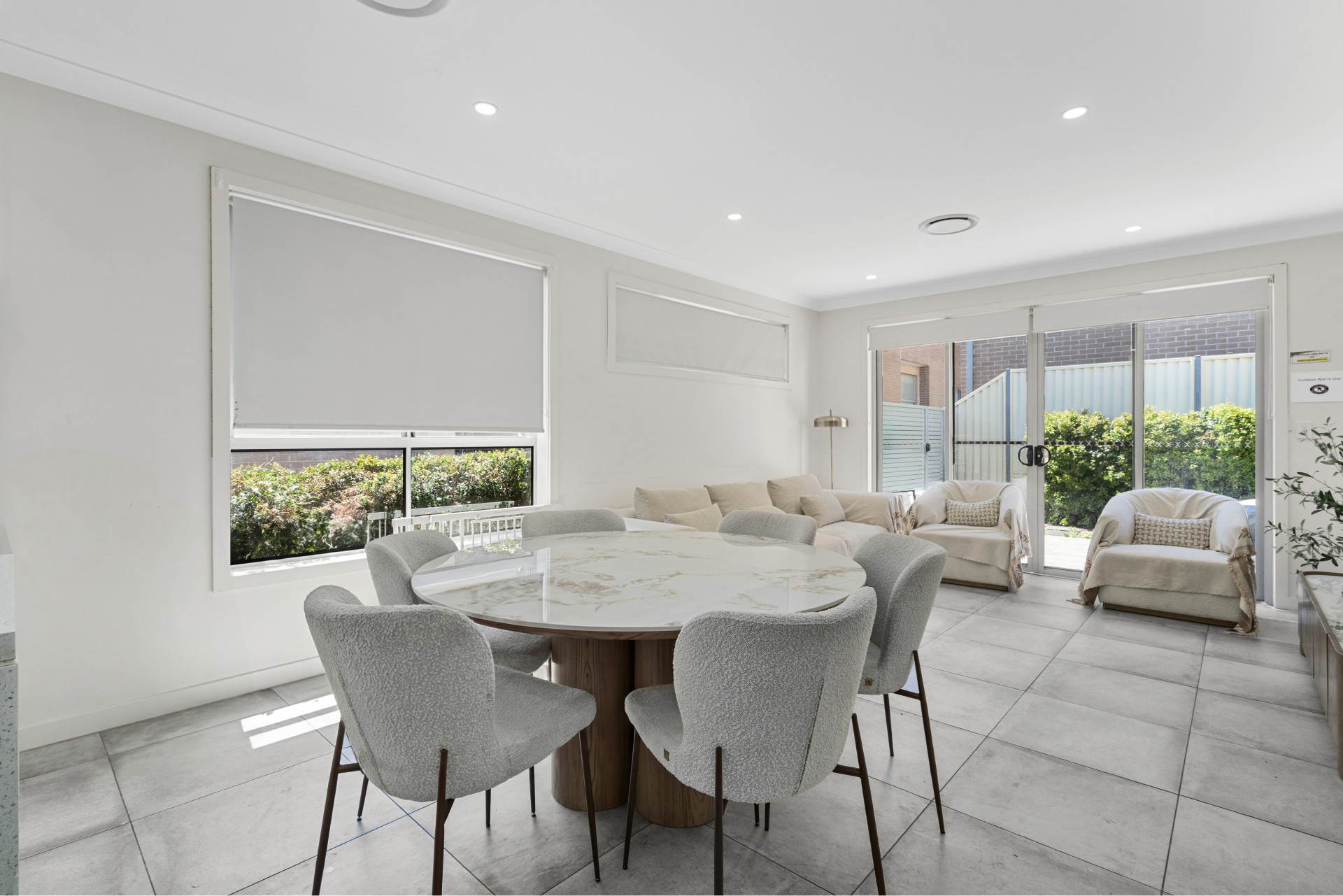 An opulent open living and dining room area, welcoming an abundance of natural light coming through to the house and reflecting on the beautiful polished concrete floors.