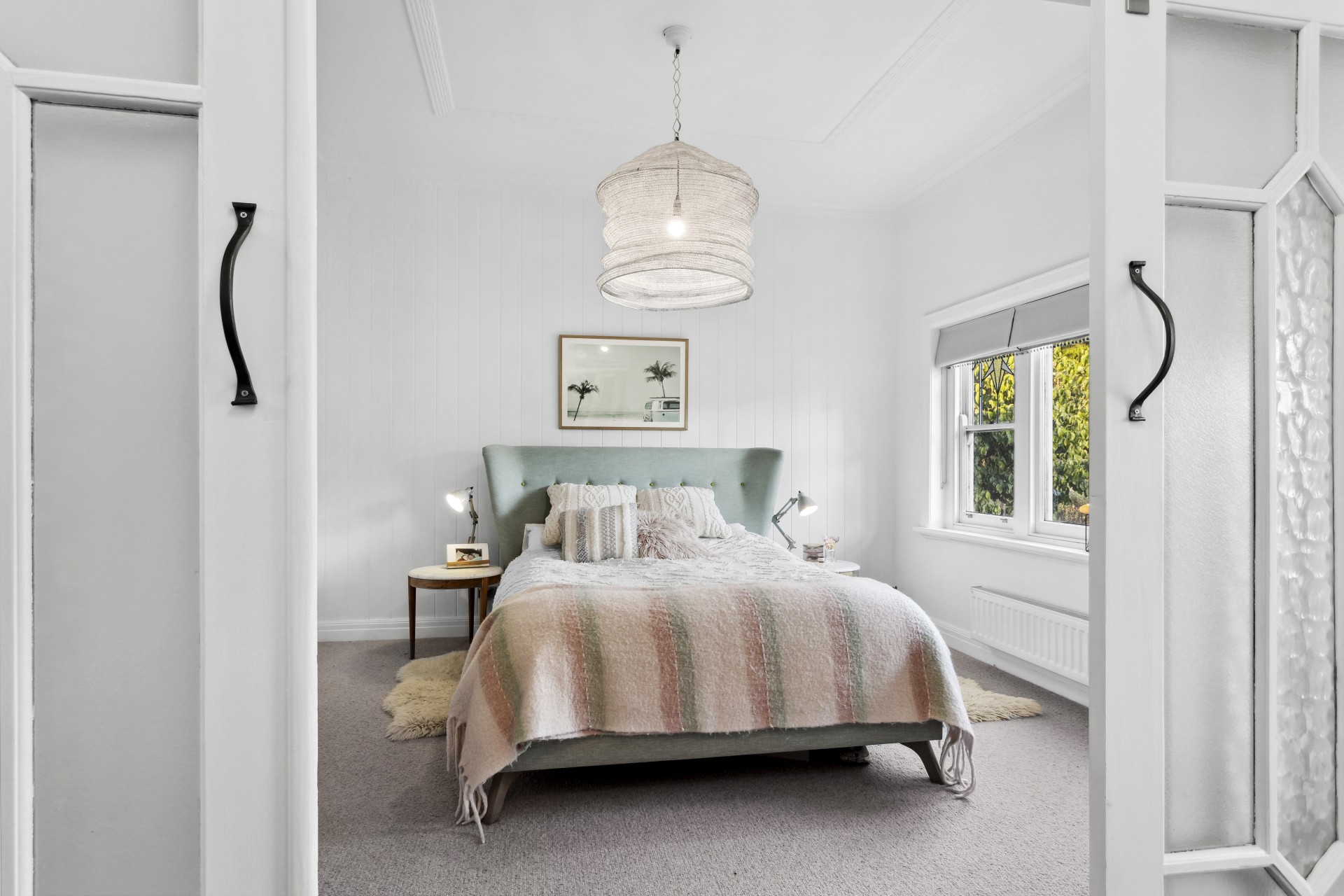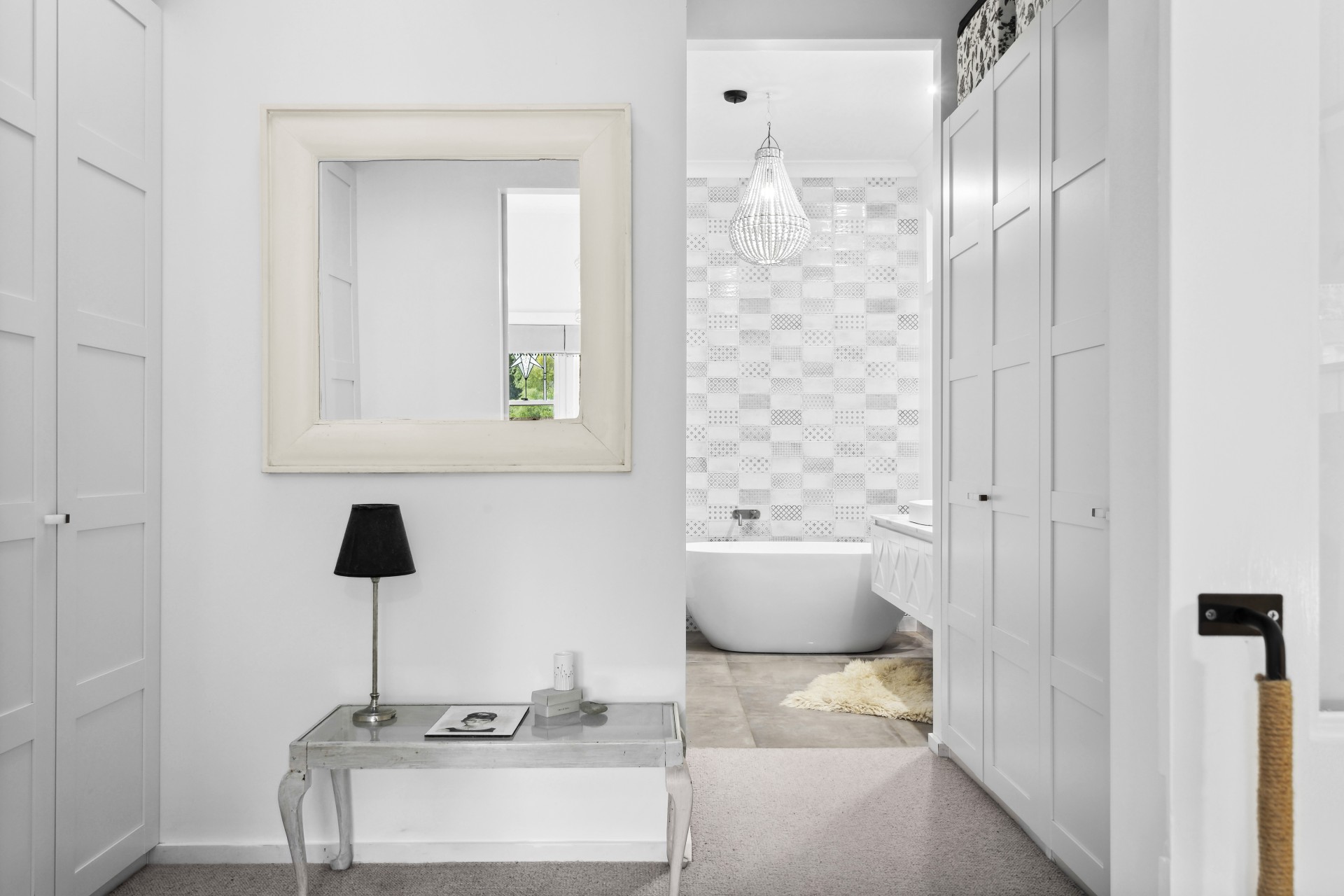 The spacious master bedroom with New Zealand pure wool carpet has been thoughtfully renovated & includes a spacious dressing room and luxurious bathroom ensuite with handmade Spanish tiles and an oval bath. Through French doors the second bedroom overlooks the greenery of the rear yard and has the convenience of its own ensuite and a walk-in robe. The third bedroom has a striking navy and white colour scheme and gorgeous leadlight windows, accompanied by another walk-in robe and would be a treat for any guest to wake up in.