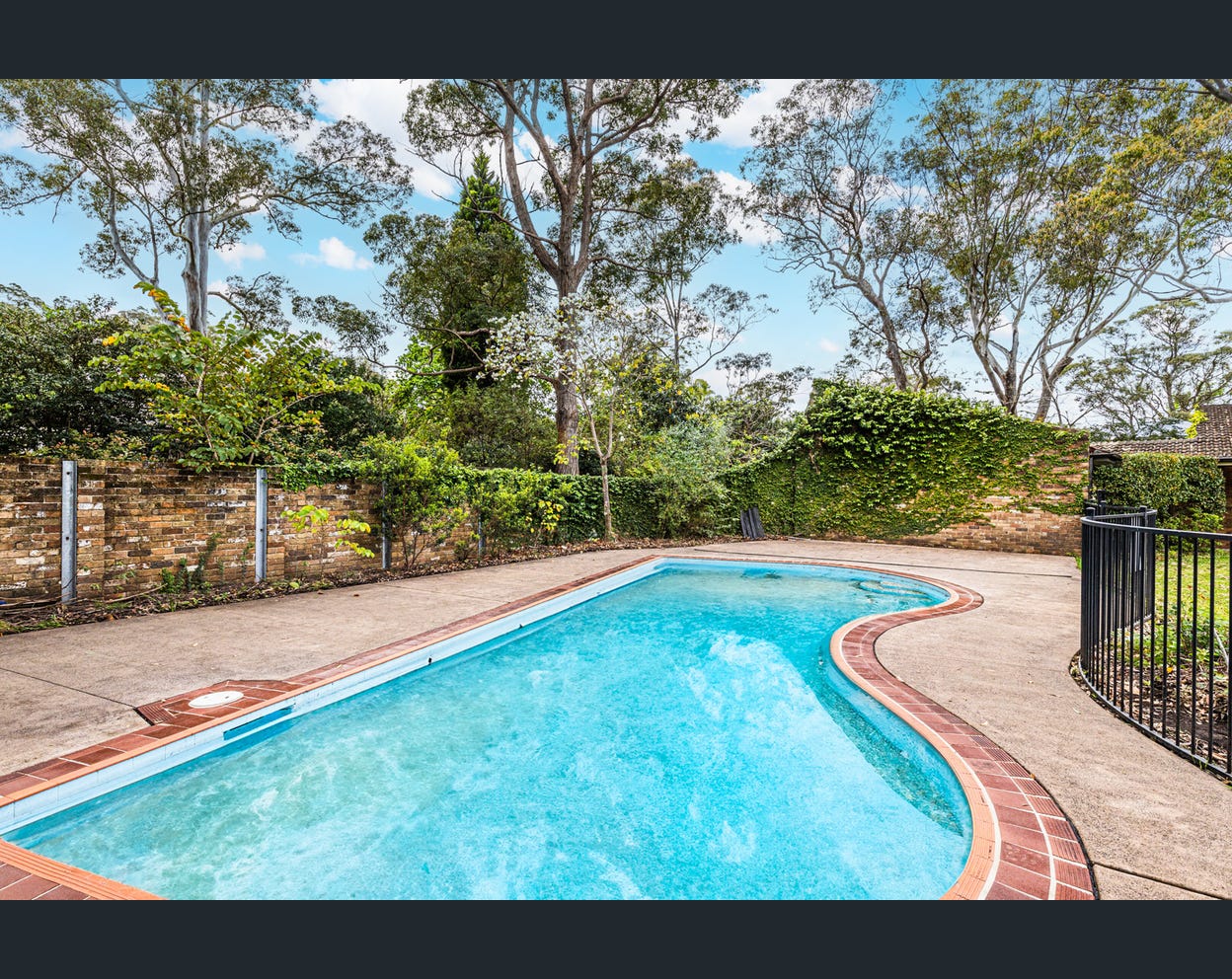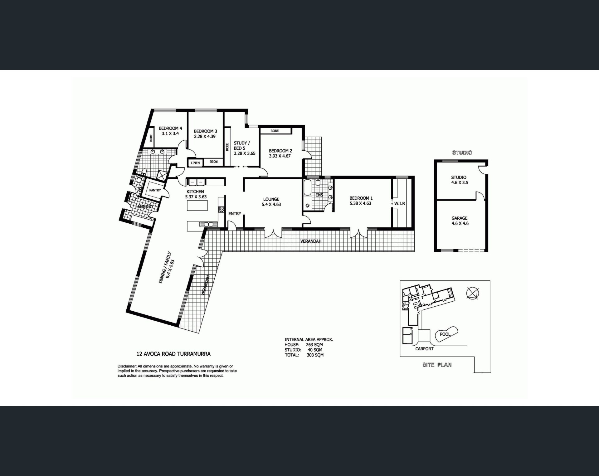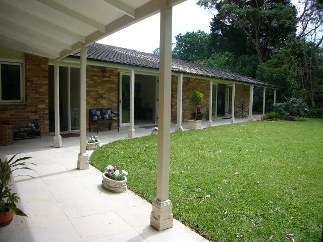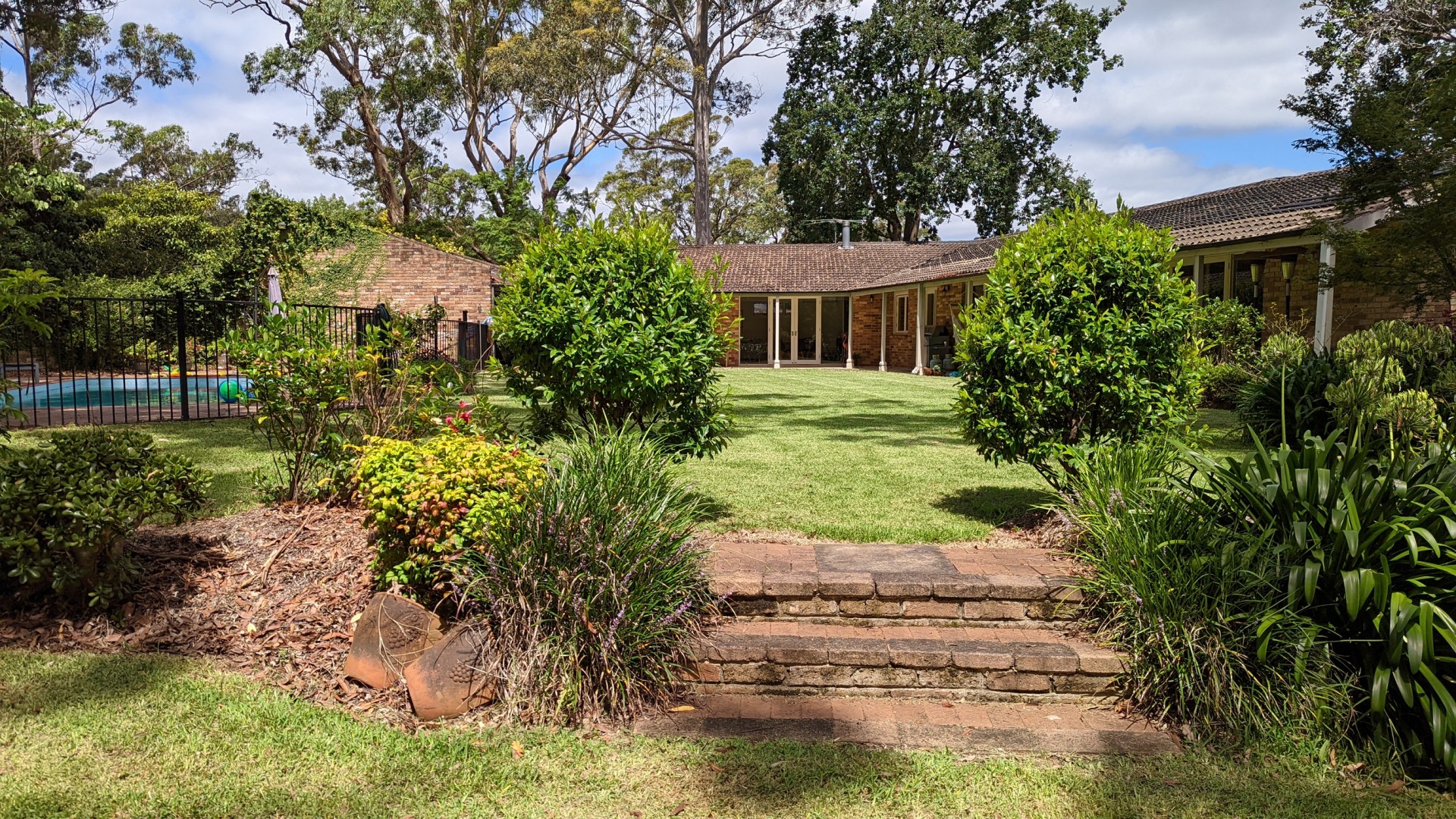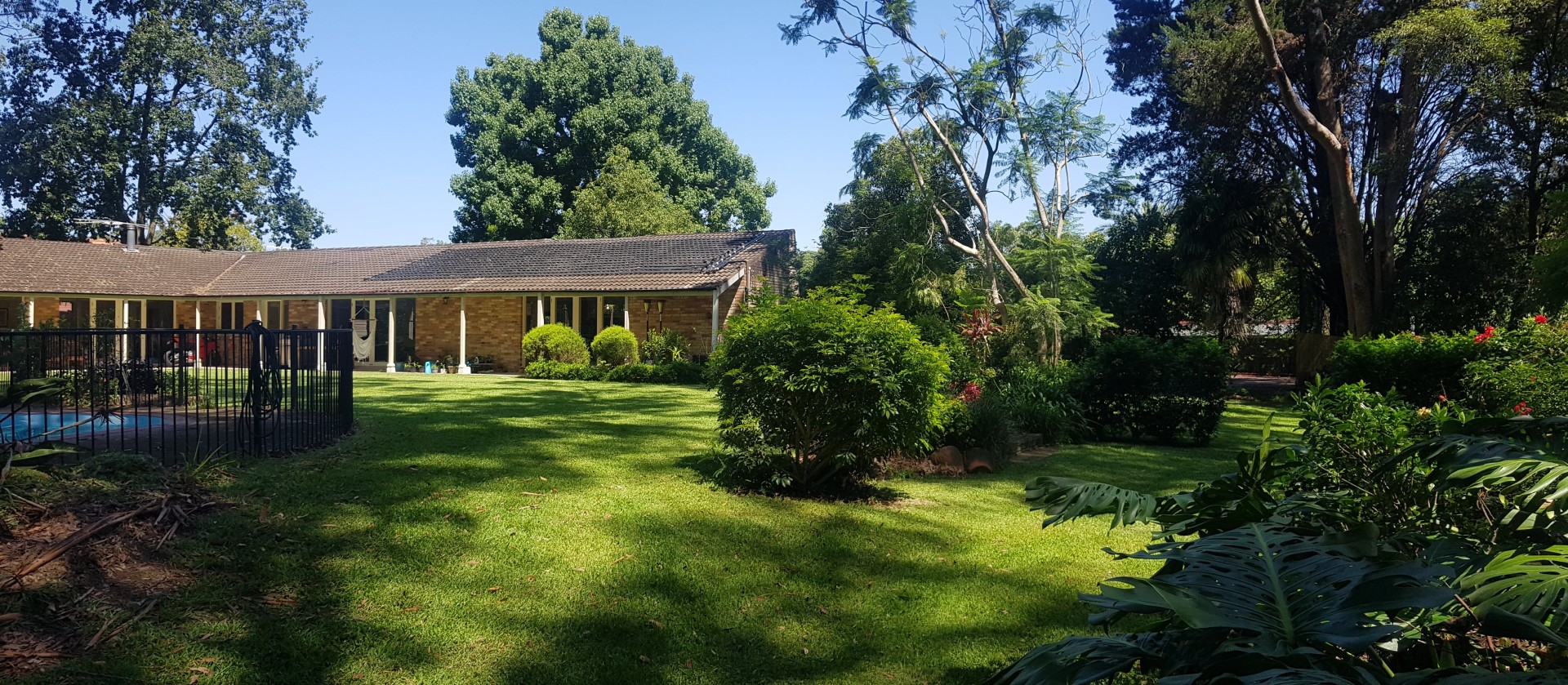 This home has 5 bedrooms, 2.5 bathrooms, living, open plan kitchen and dining, separate studio/office, 4 parking spaces (2 undercover), pool, a separate courtyard, and spacious gardens and pool.