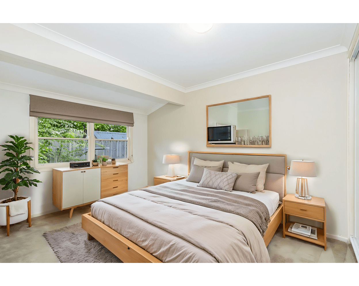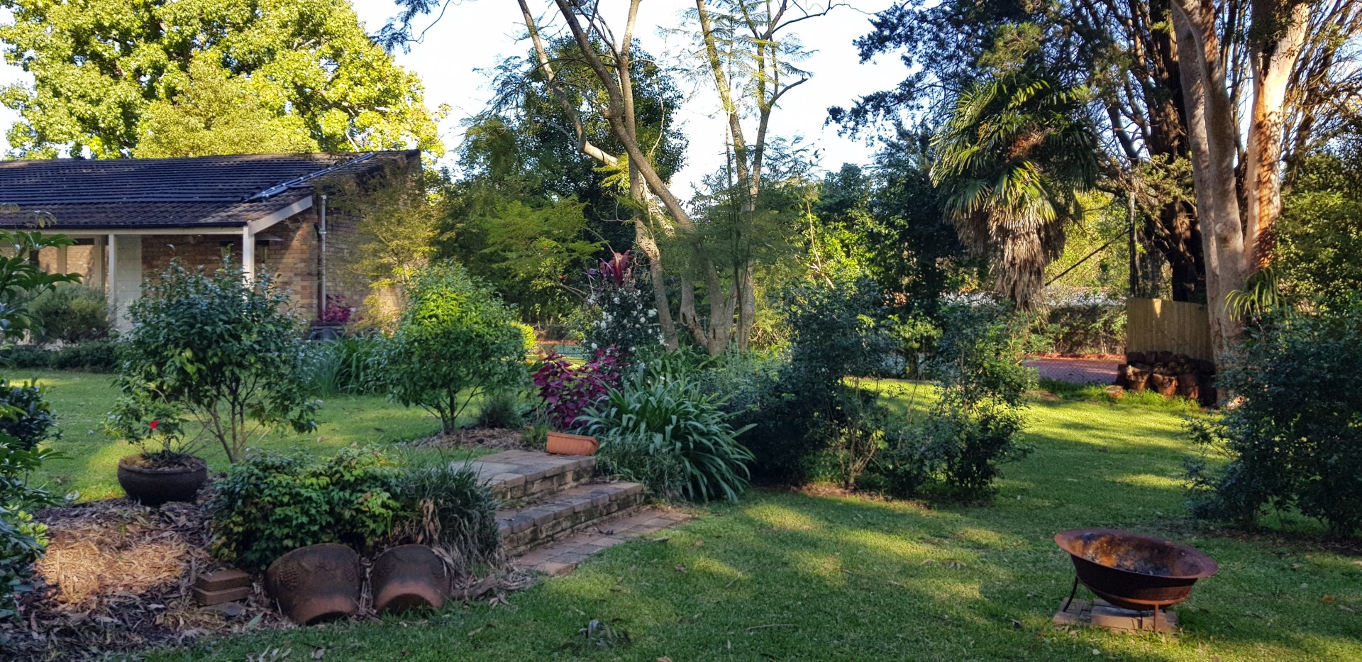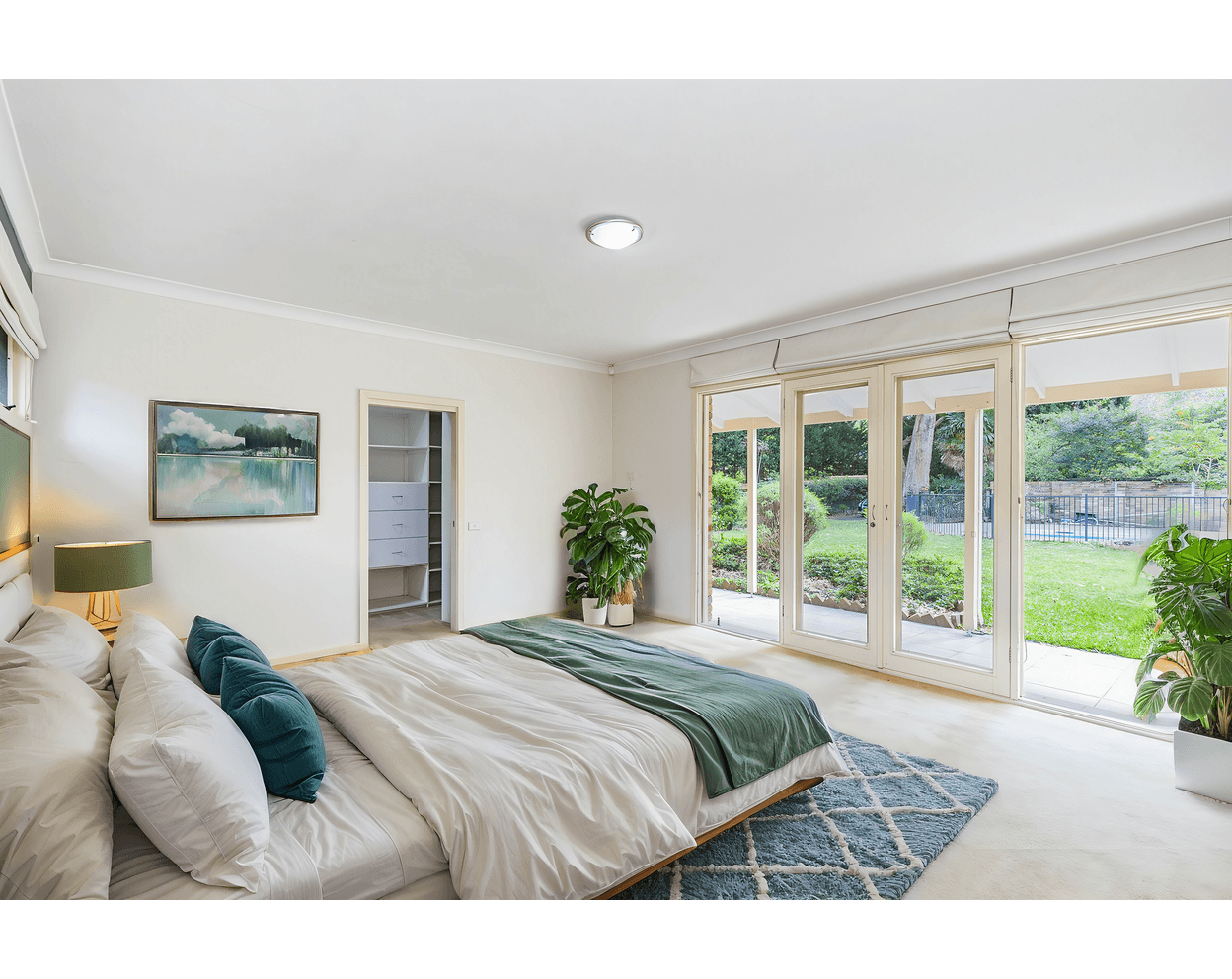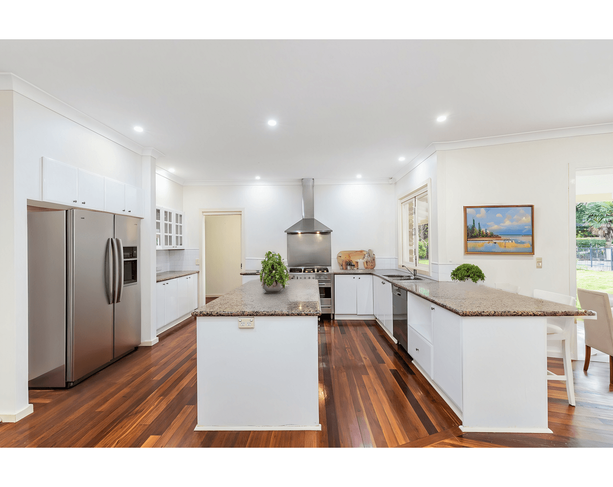 This home has 5 bedrooms, 2.5 bathrooms, living, open plan kitchen and dining, separate studio/office, 4 parking spaces (2 undercover), pool, a separate courtyard, and spacious gardens and pool.