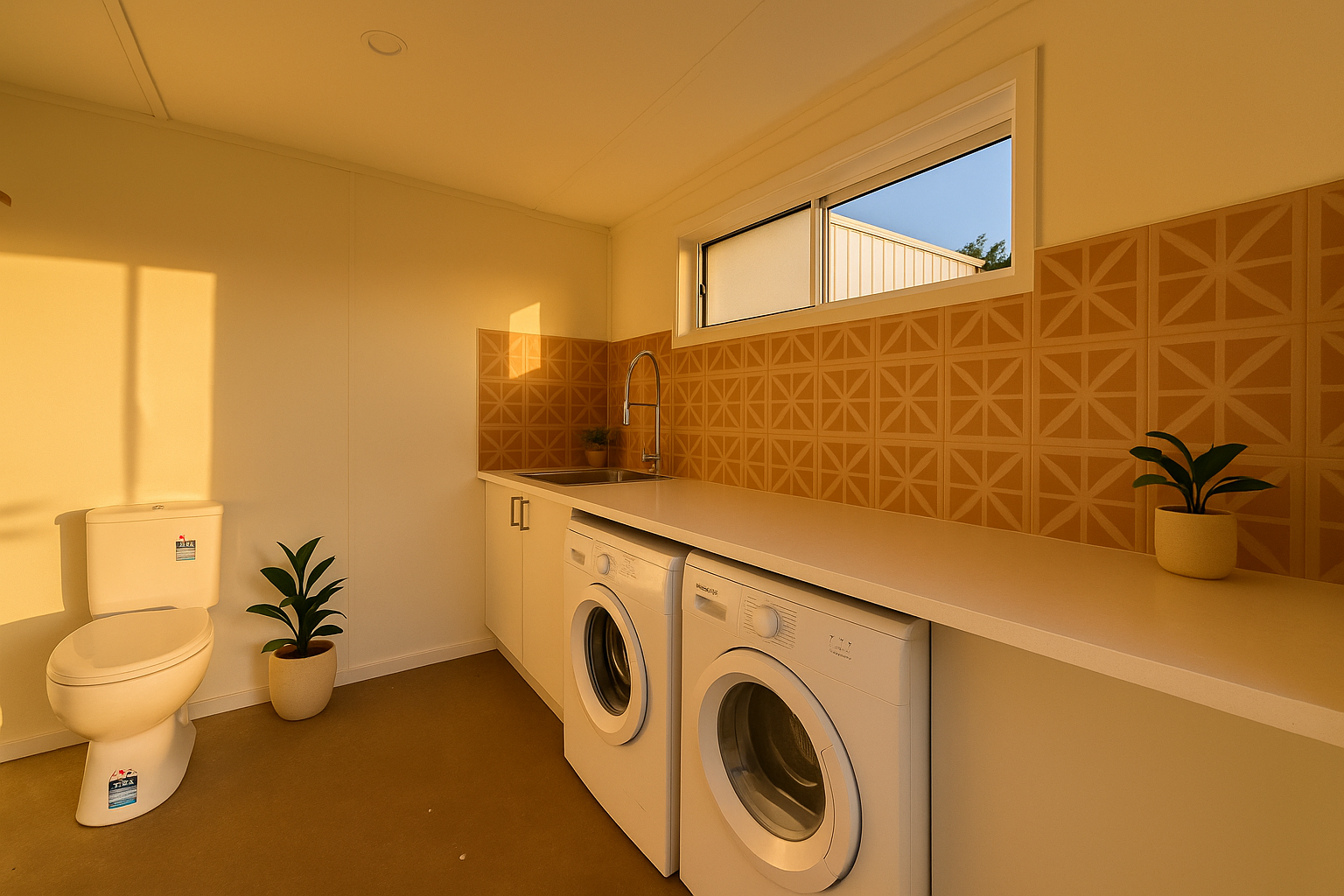 Each bedroom is full-sized, filled with light, and built for comfort. The main bathroom feels resort-like with its minimalist design and timeless finishes, while two separate toilets add convenience for family living.