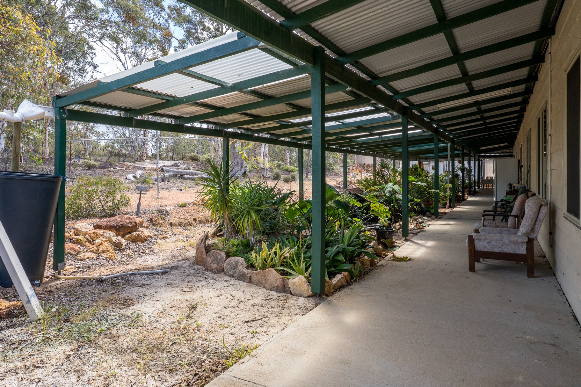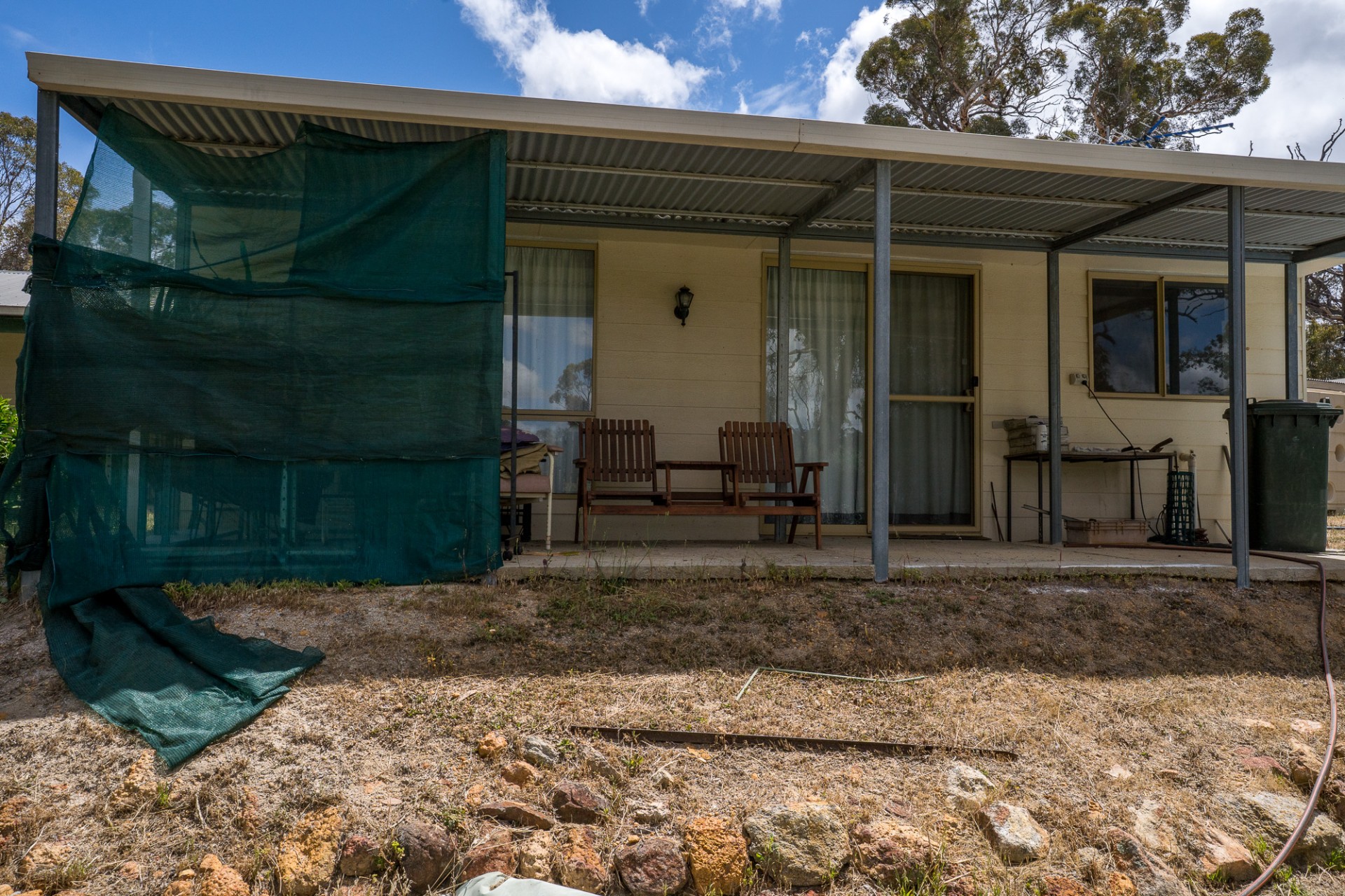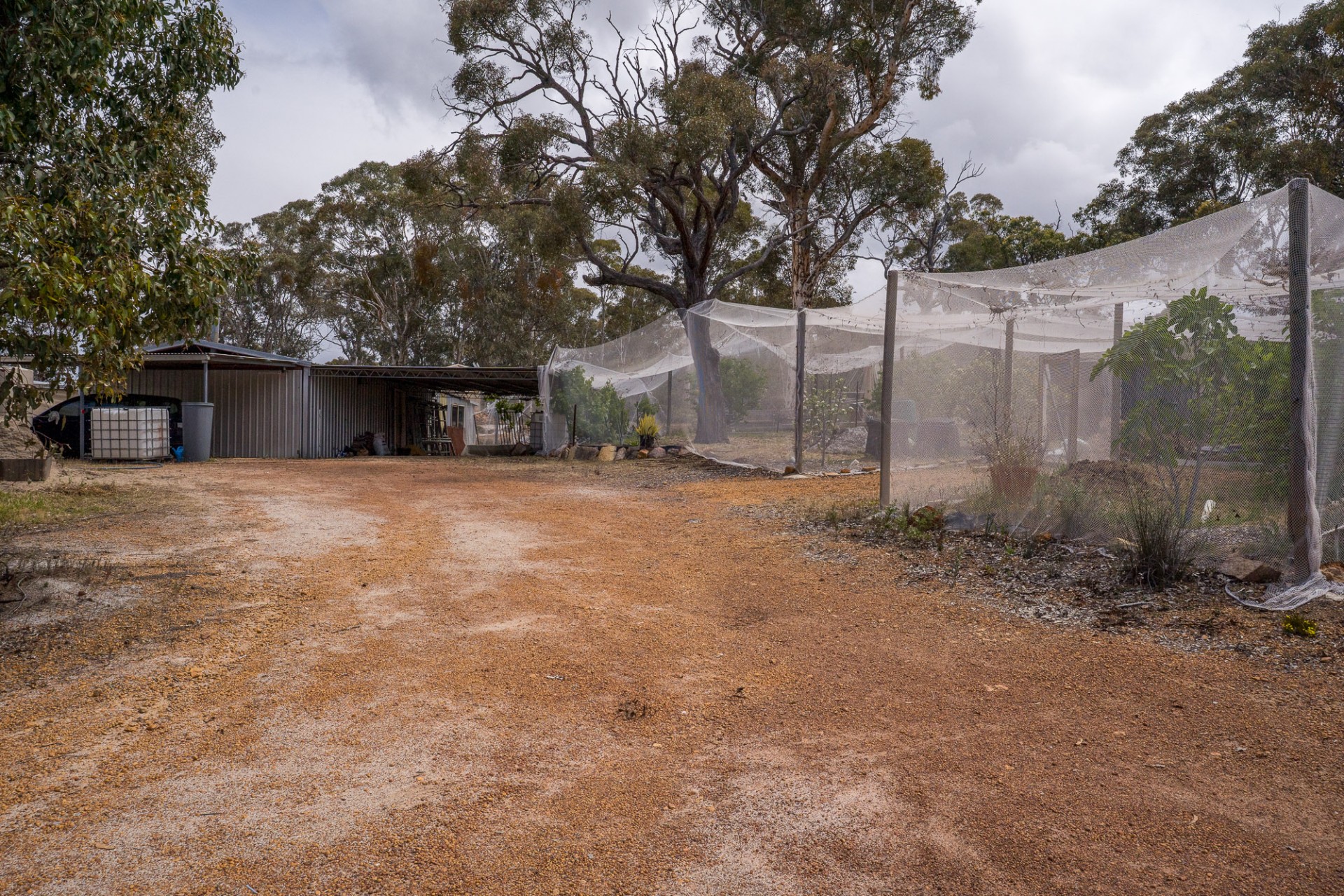 Netting covered fruit tree orchard and vegie garden space. Large water storage provisions.