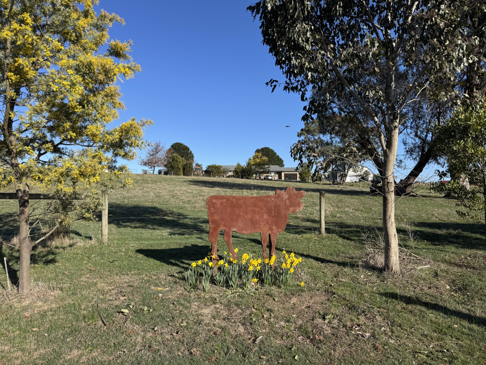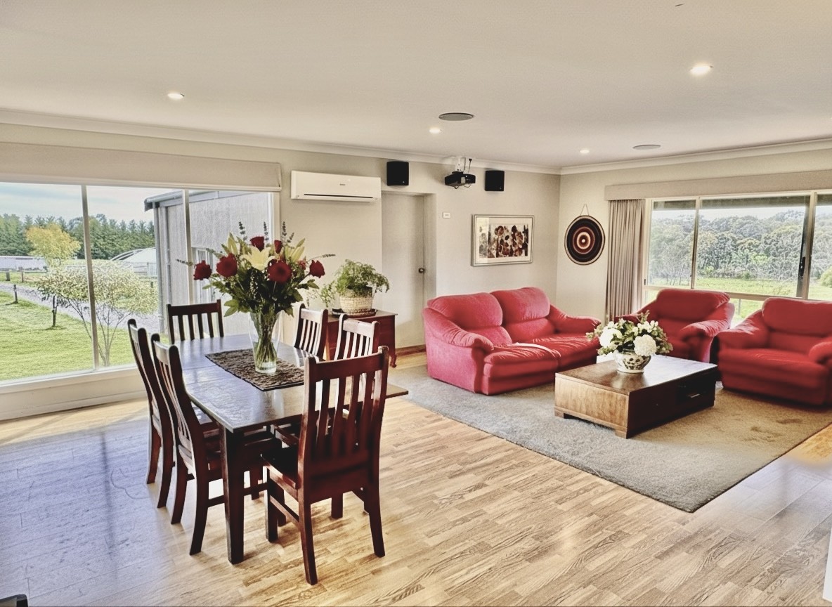 Nature flourishes here. A young garden of natives and introduced species invites your vision. Water is abundant with two dams on the property; one is spring-fed by a seasonal creek, which weaves through a fenced regrowth strip. Every paddock is plumbed with high-quality bore water, supported by a new bore and the home enjoys nearly 200,000 liters of drinking water across seven tanks-water security you can trust.
