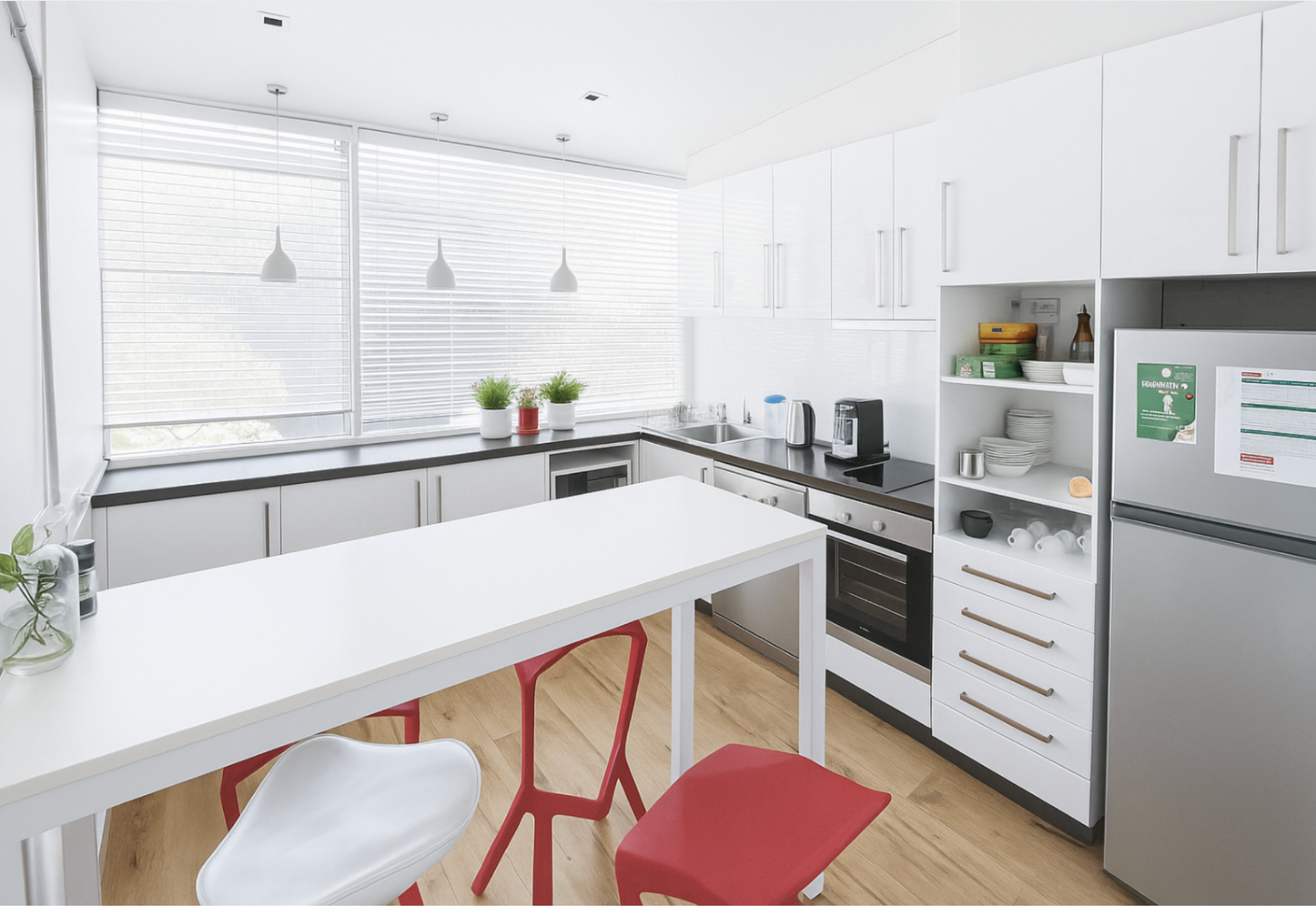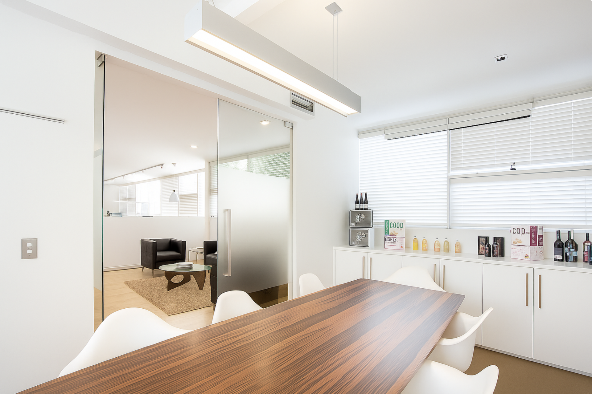 Contemporary fit out with floorboards and light filled windows on both sides