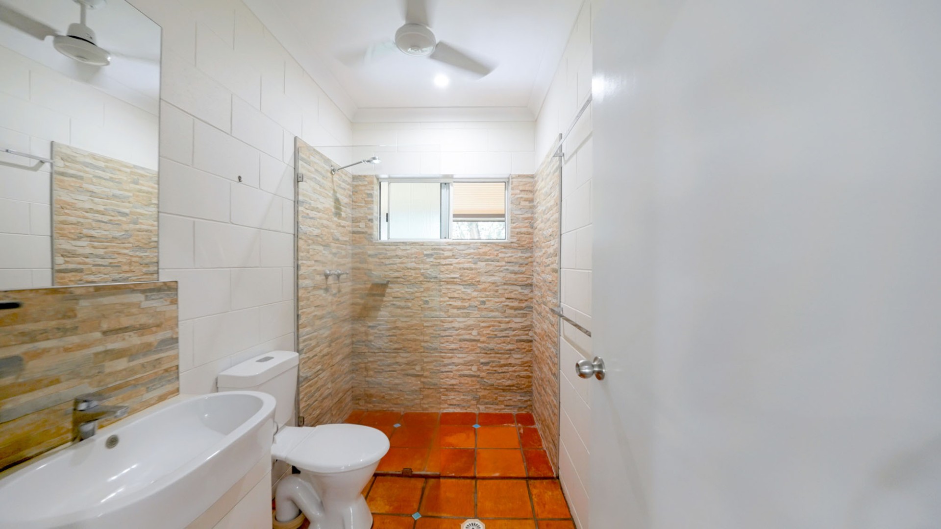 The ensuite bathroom off the main bedroom is tiled in terra cotta with a modern step in shower. It's simple yet functional and offers a personal space for relaxation.