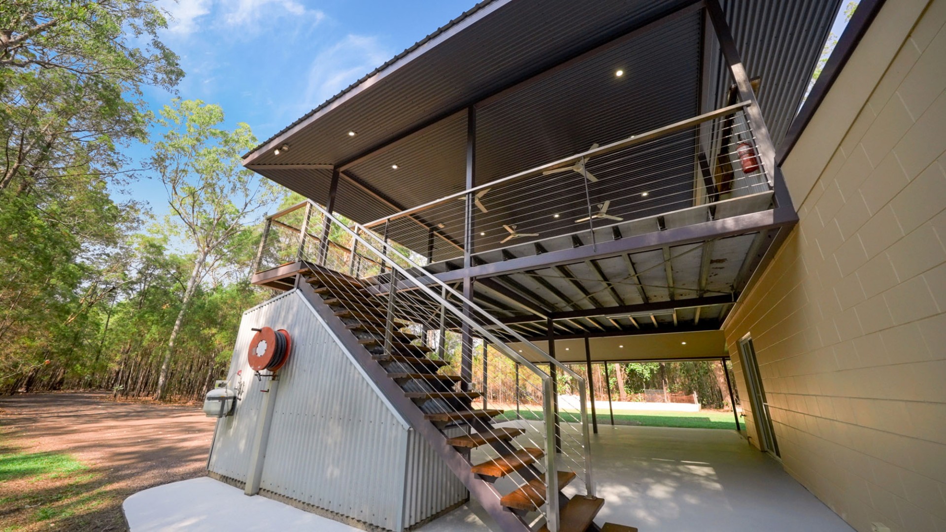 The upstairs open plan entertaining area with a nautical themed low maintenance stainless steel balustrade and marine carpet overlooks the mini oval where many a day has been spent practicing footy training or with family and friends playing a Boxing Day Test.