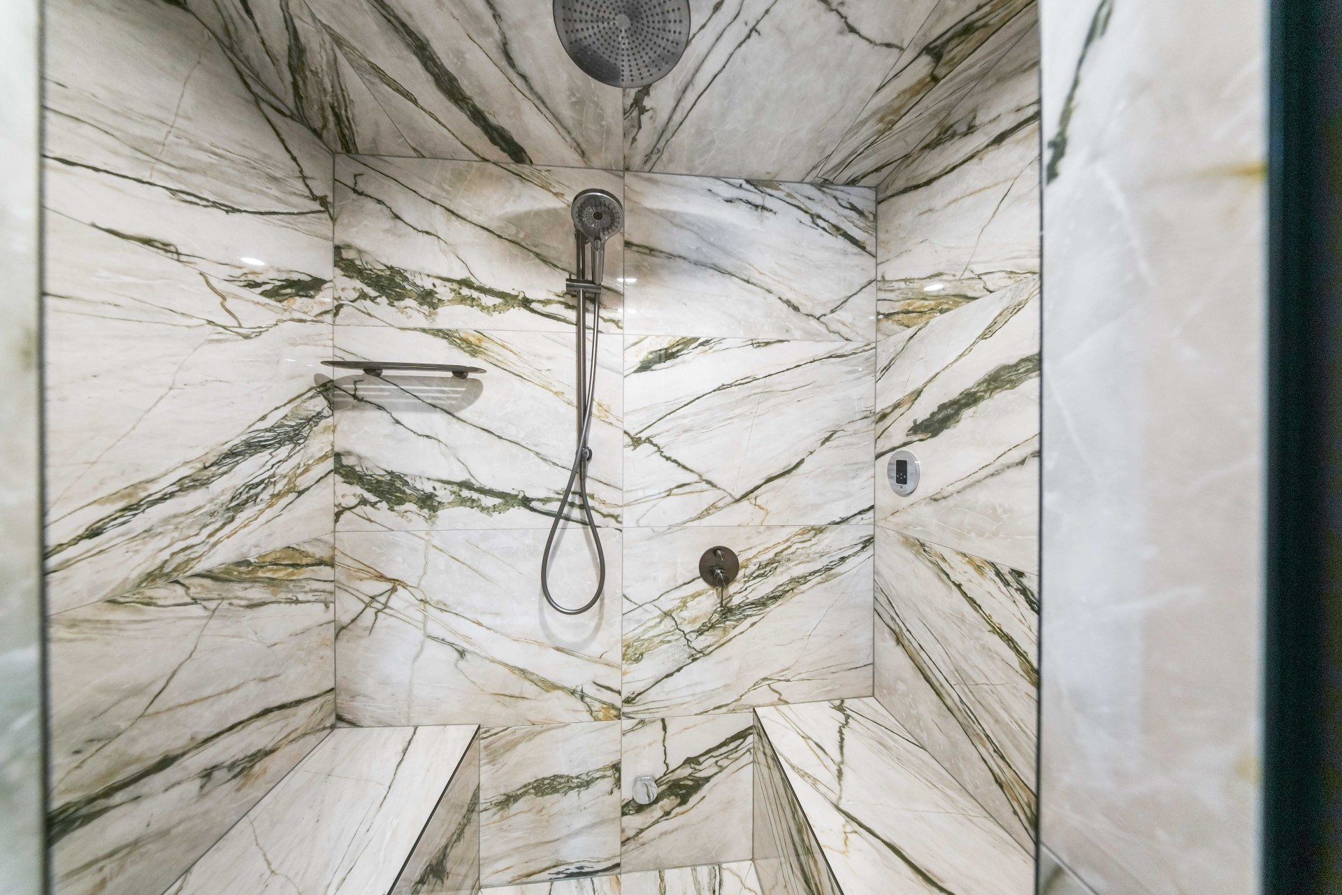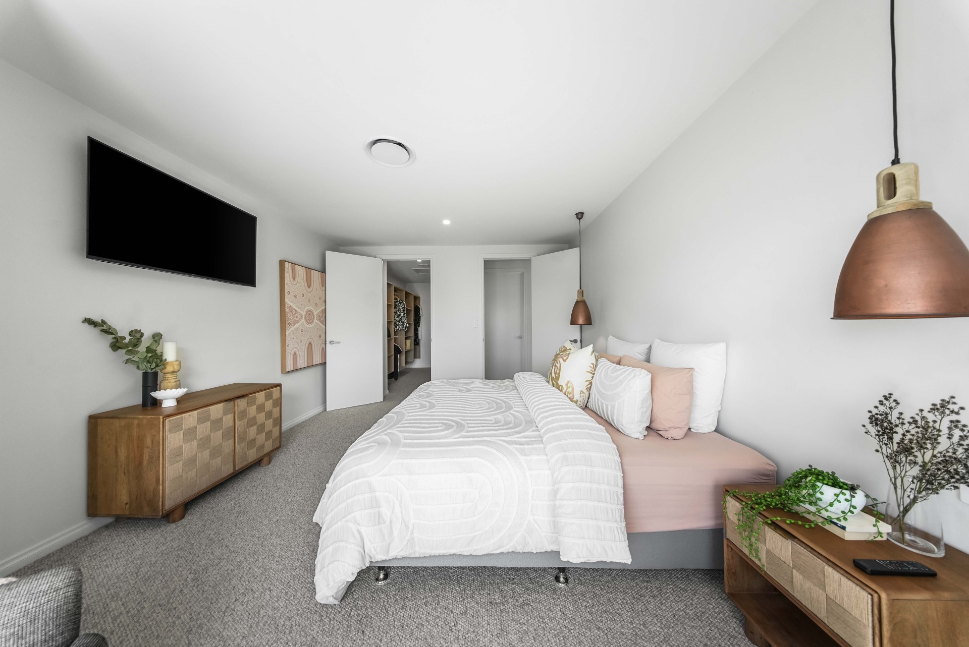 Master retreat with walk-in robe, Smart TV, and luxurious ensuite (double vanity, bidet, touch-pad steam shower), opening to a private outdoor spa