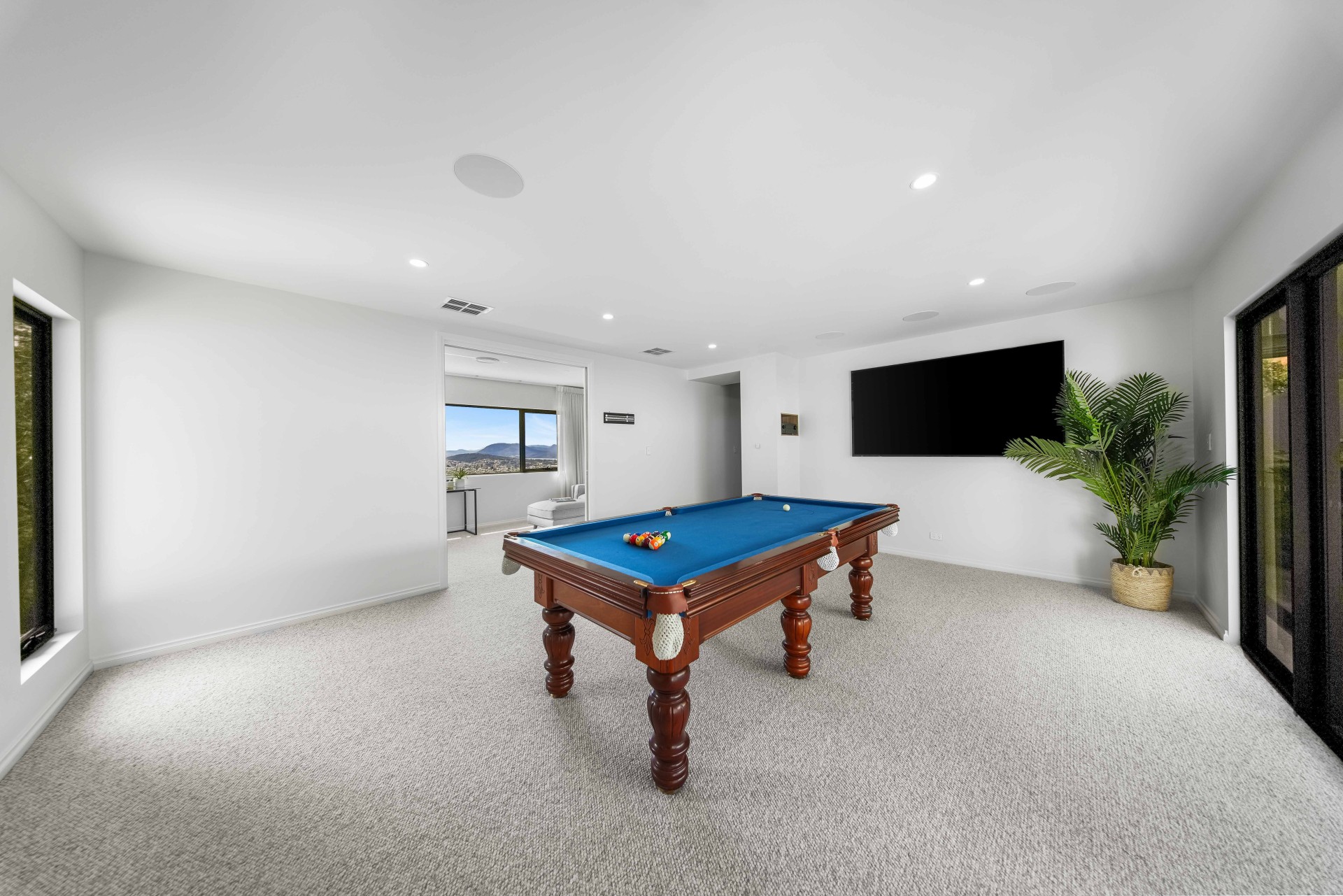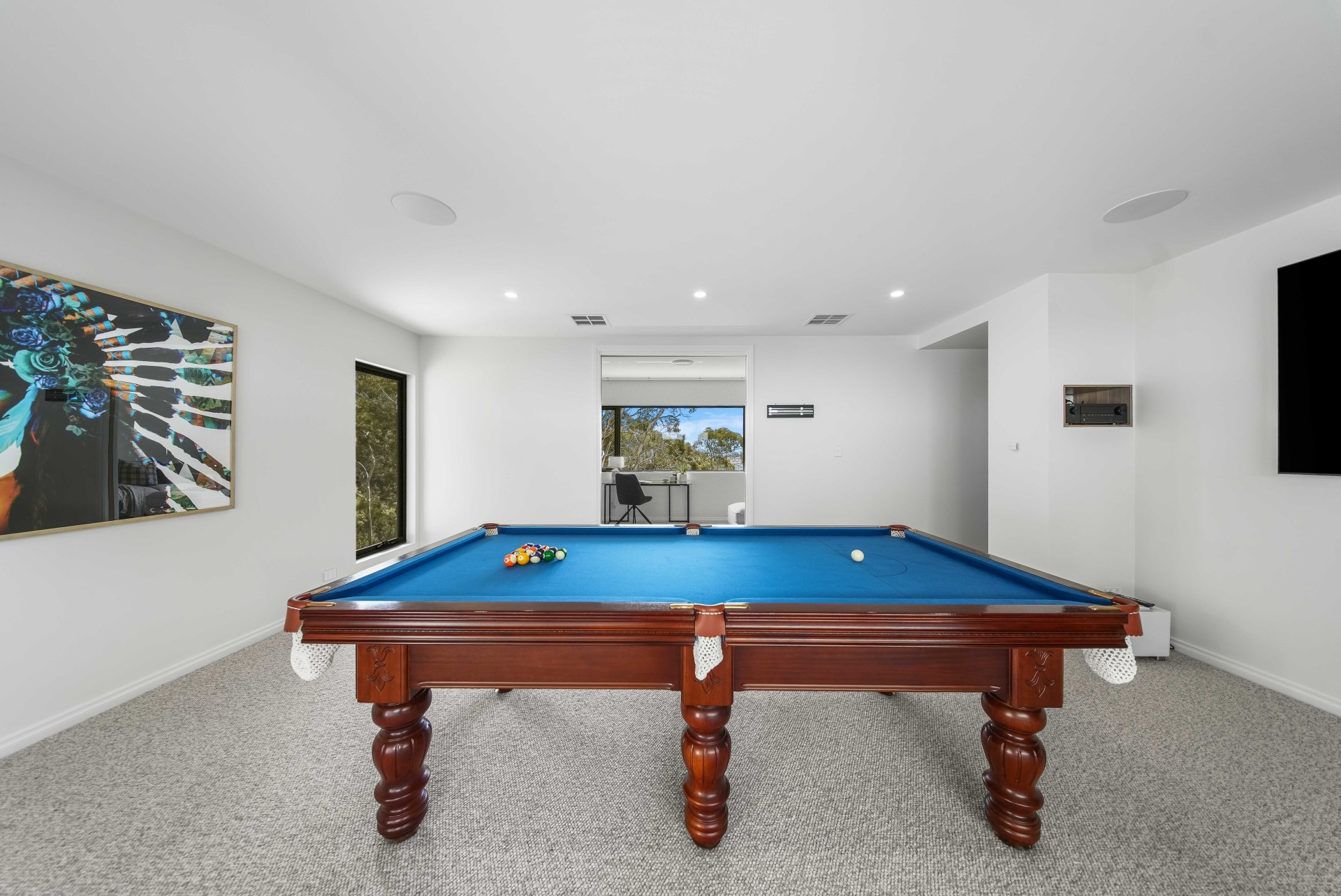 Spacious billiard room with 8x4 slate table, Smart TV, and surround sound