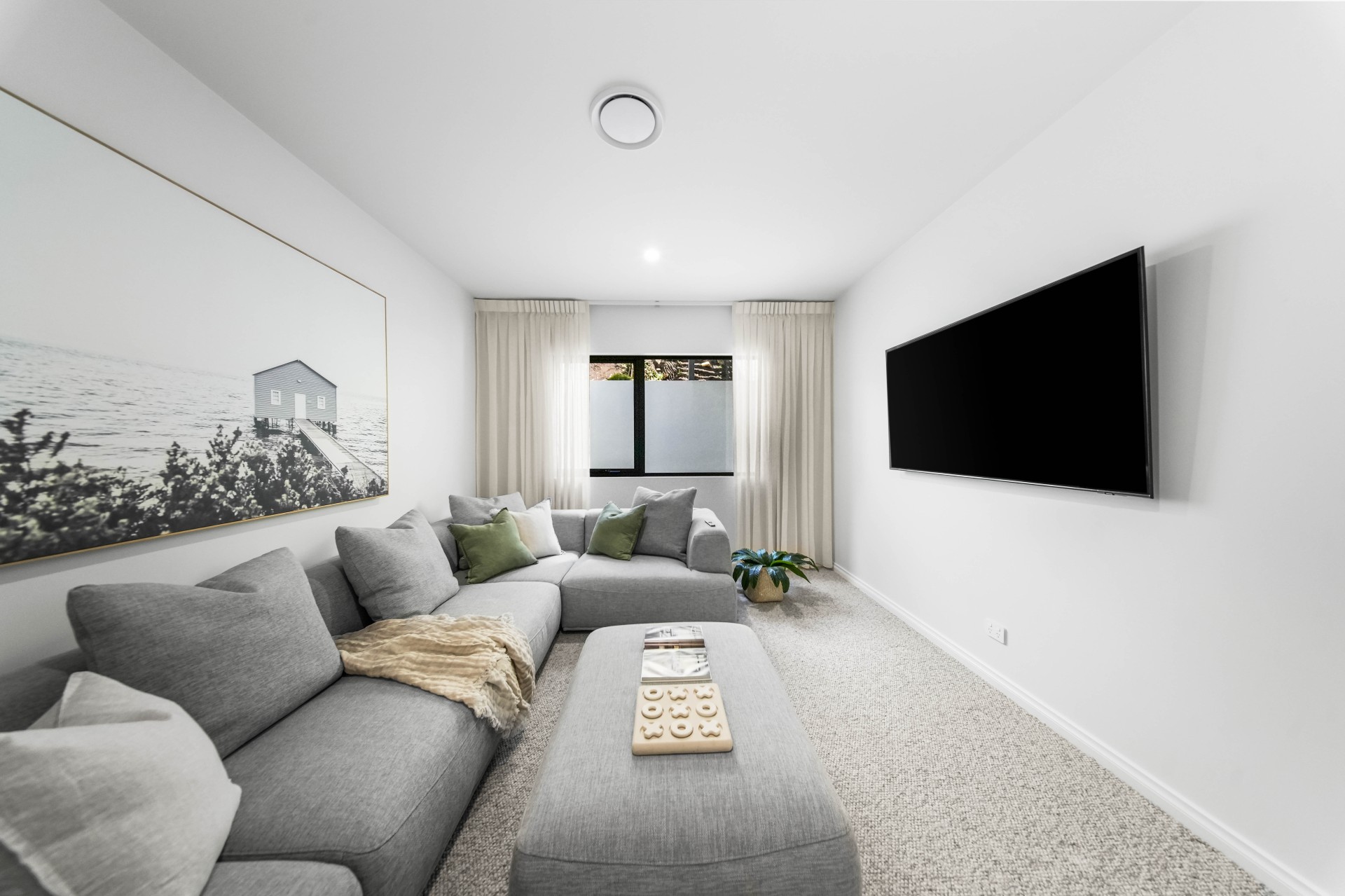 Open-plan dining and living with 98" QLED Smart TV and surround sound