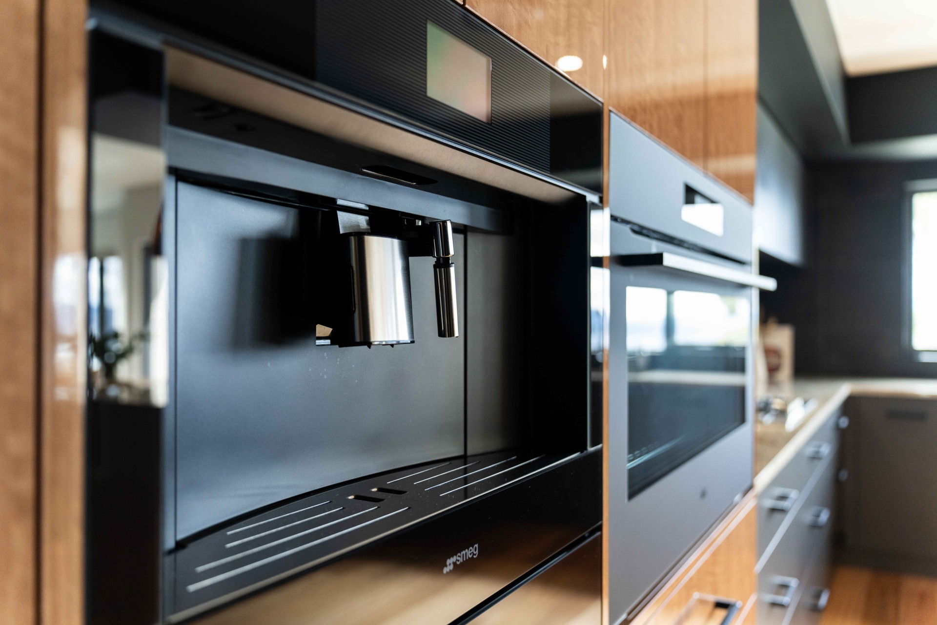 Designer kitchen with seamless stone benchtops and premium Smeg & AEG appliances (integrated dishwasher, fridge/freezer & coffee machine)