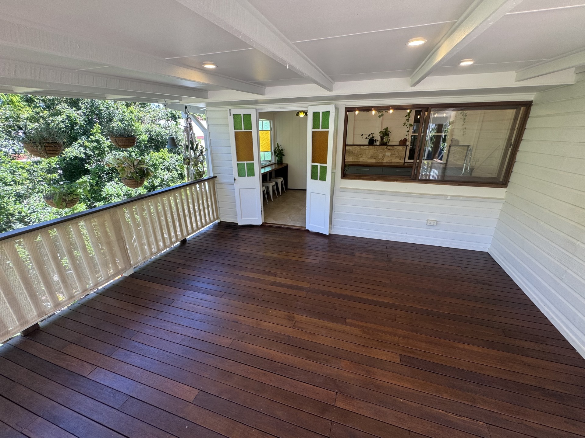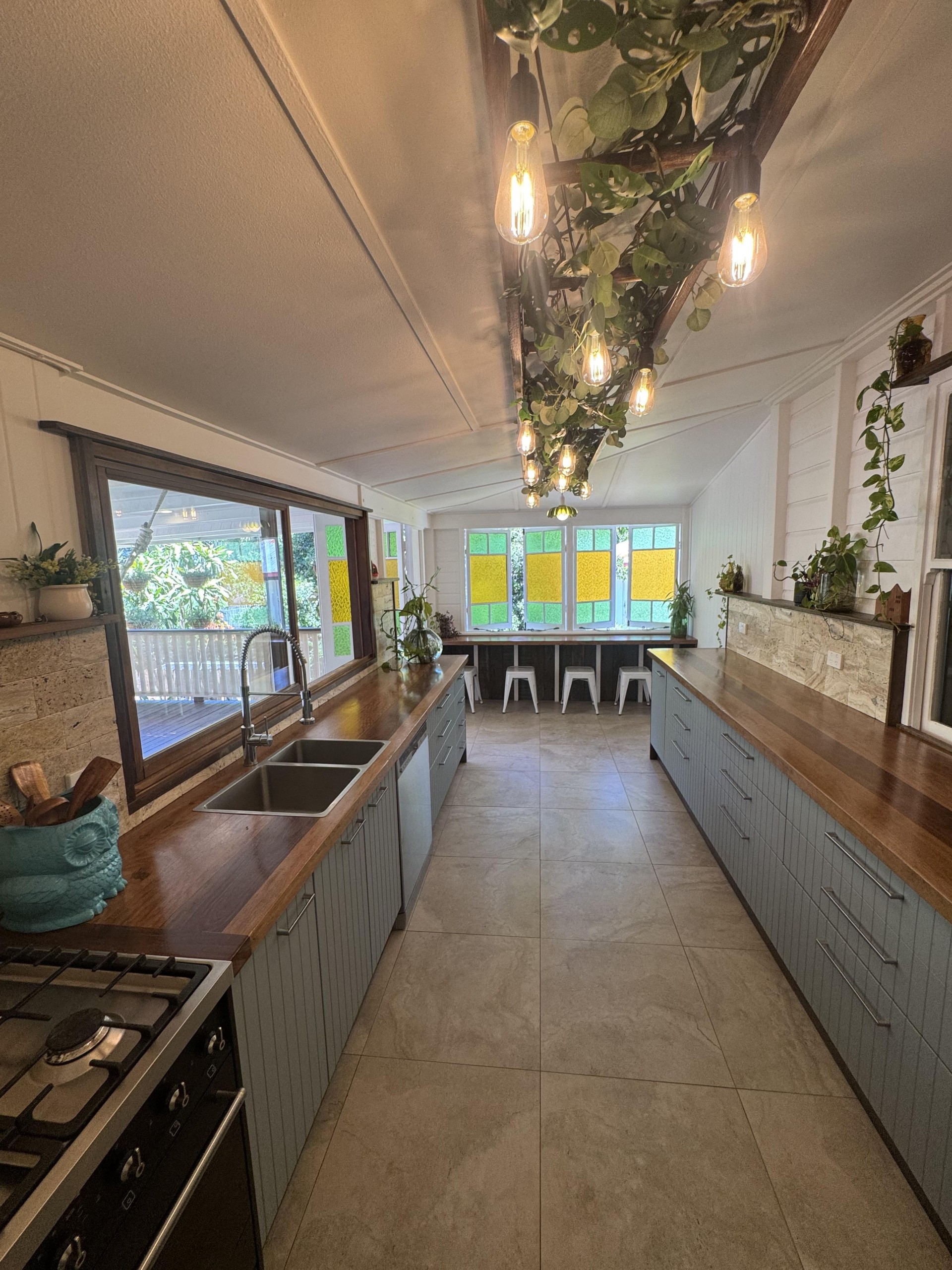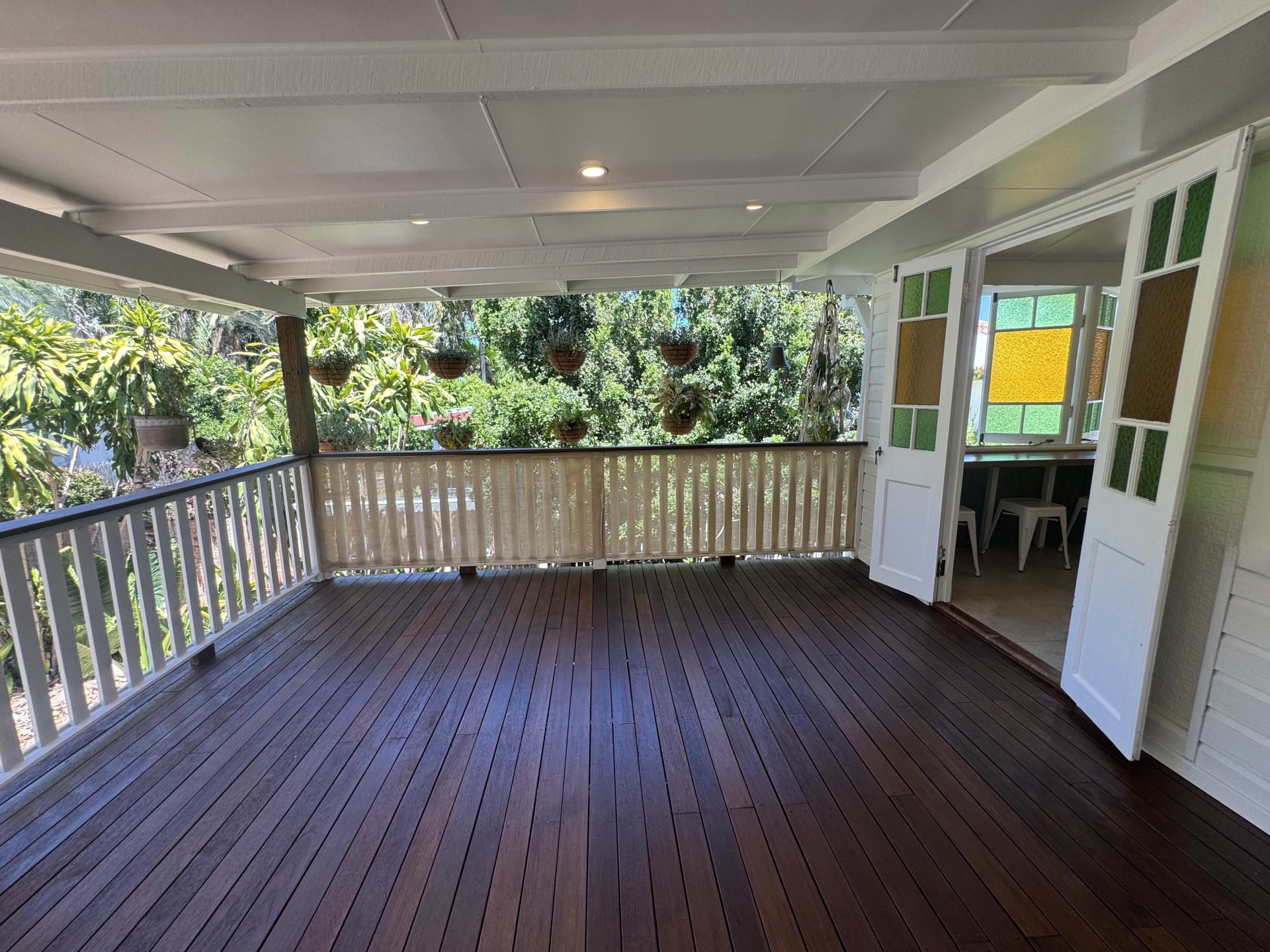 As you arrive, the large and secure front veranda sets the tone for relaxed North Queensland living. Step inside to discover a spacious interior featuring traditional tongue-and-groove walls and ceilings, 3-metre-high ceilings, French timber doors, and coloured casement windows that flood the home with light.