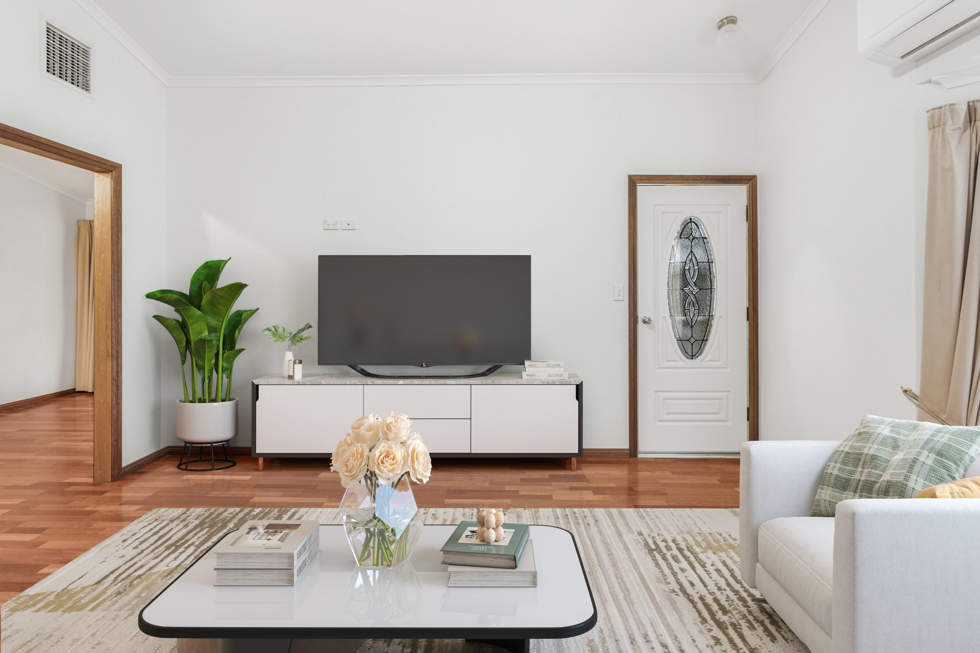 Step inside and be welcomed by an extra-large living room featuring stunning raked ceilings, creating a sense of openness and warmth.