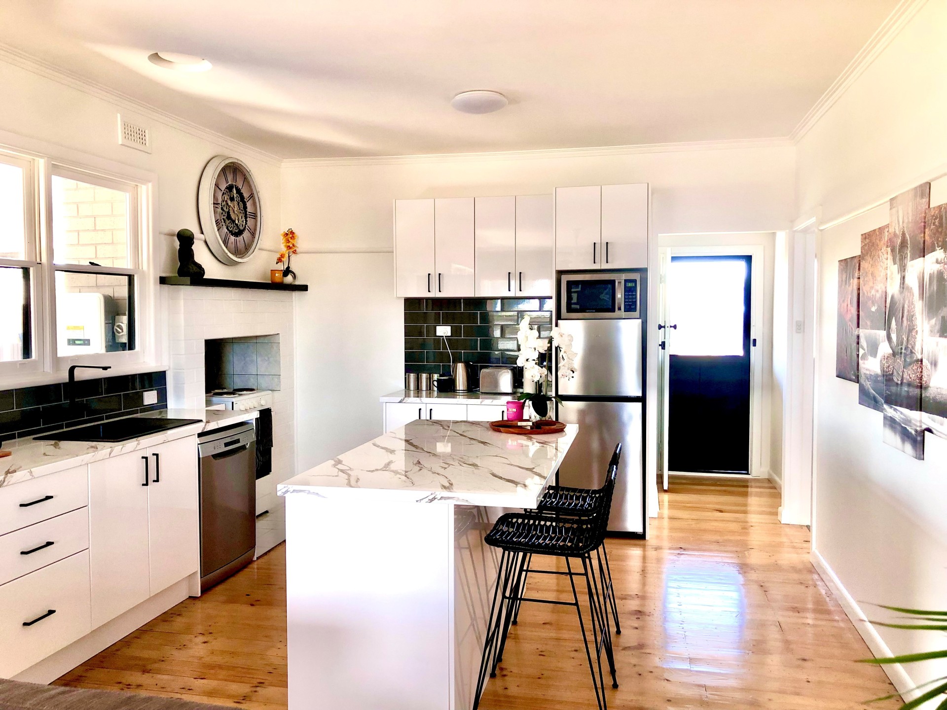 Freshly painted and renovated, comprising of 3 bedrooms, 1 with BIR's and ceiling fans, brand new kitchen has ample cupboard and bench space with island and dishwasher, matt black sink and fixtures, overlooking the living room with ceiling fan, combustion fire and heating and cooling split system.