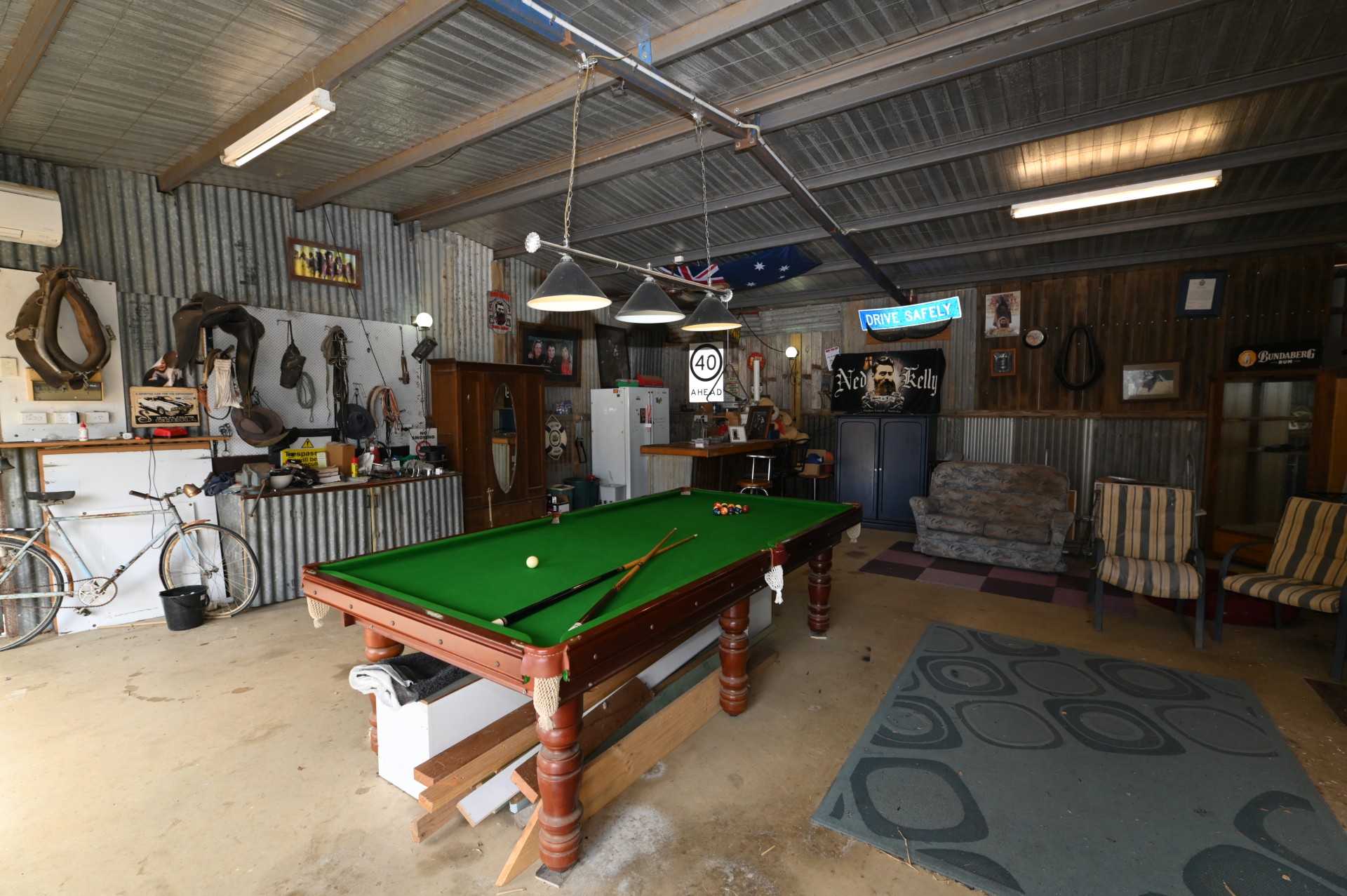 **8m x 10m lined and insulated Man Cave with Coonara type heater and ceiling fan.