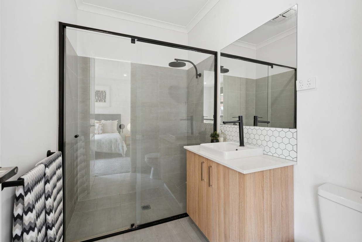 The ground floor is dedicated to accommodation, headlined by a private main bedroom featuring a modern ensuite and built-in robes. Two further bedrooms are serviced by a central bathroom, delivering comfort and practicality for family members or visiting guests.