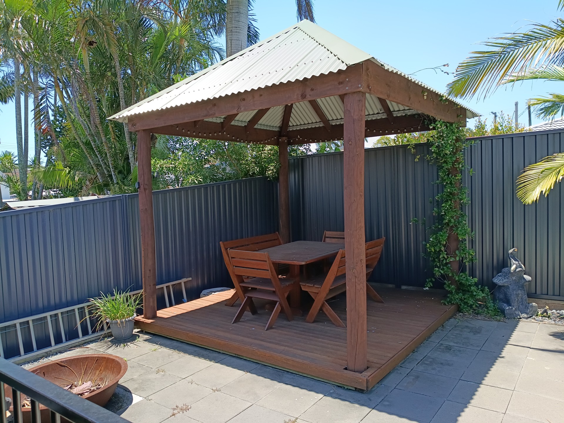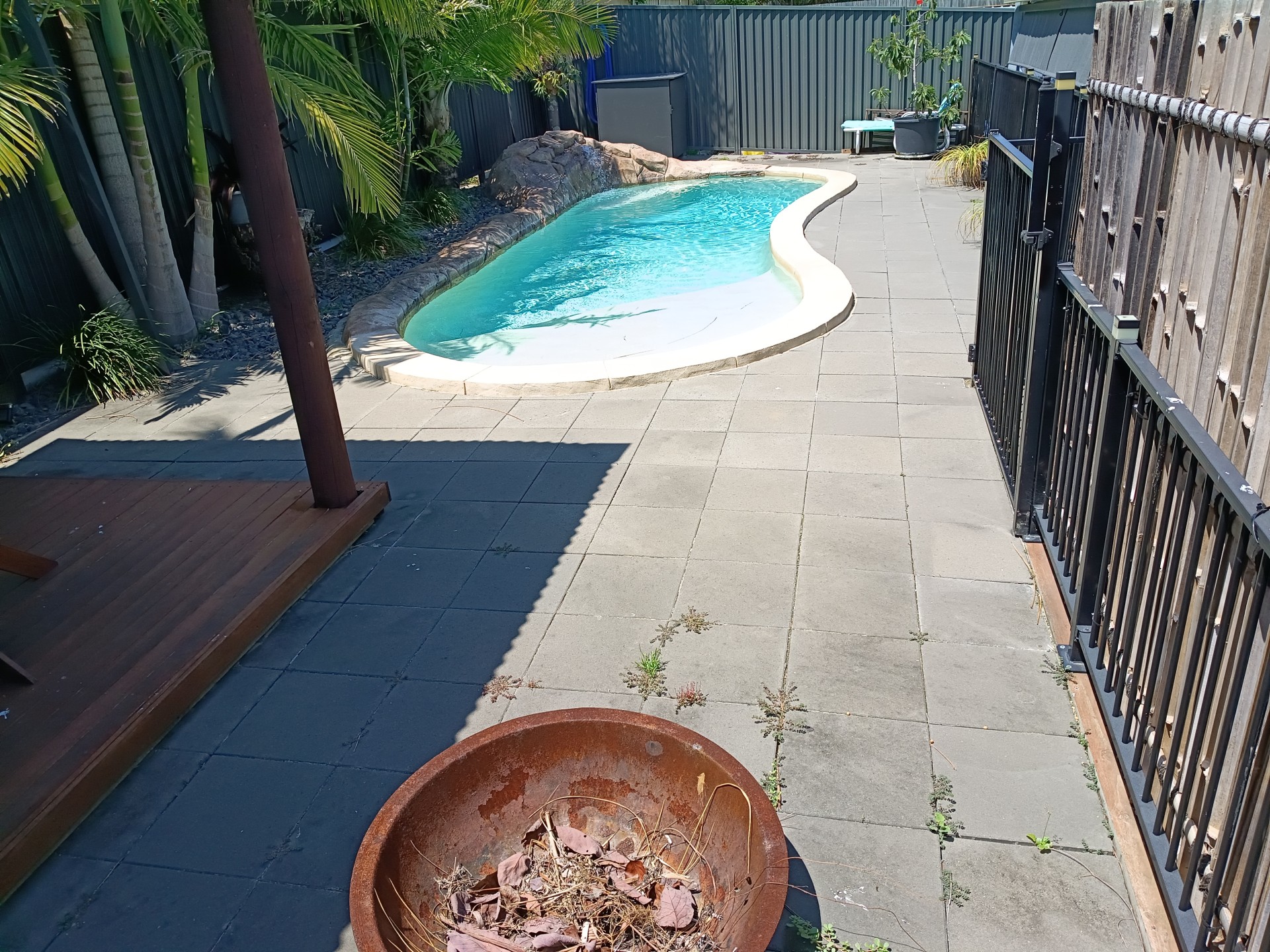• Solar-heated in-ground pool with spa, rock waterfall, gazebo, and fire-pit area, with optional 6m×6m shade sail over pool area