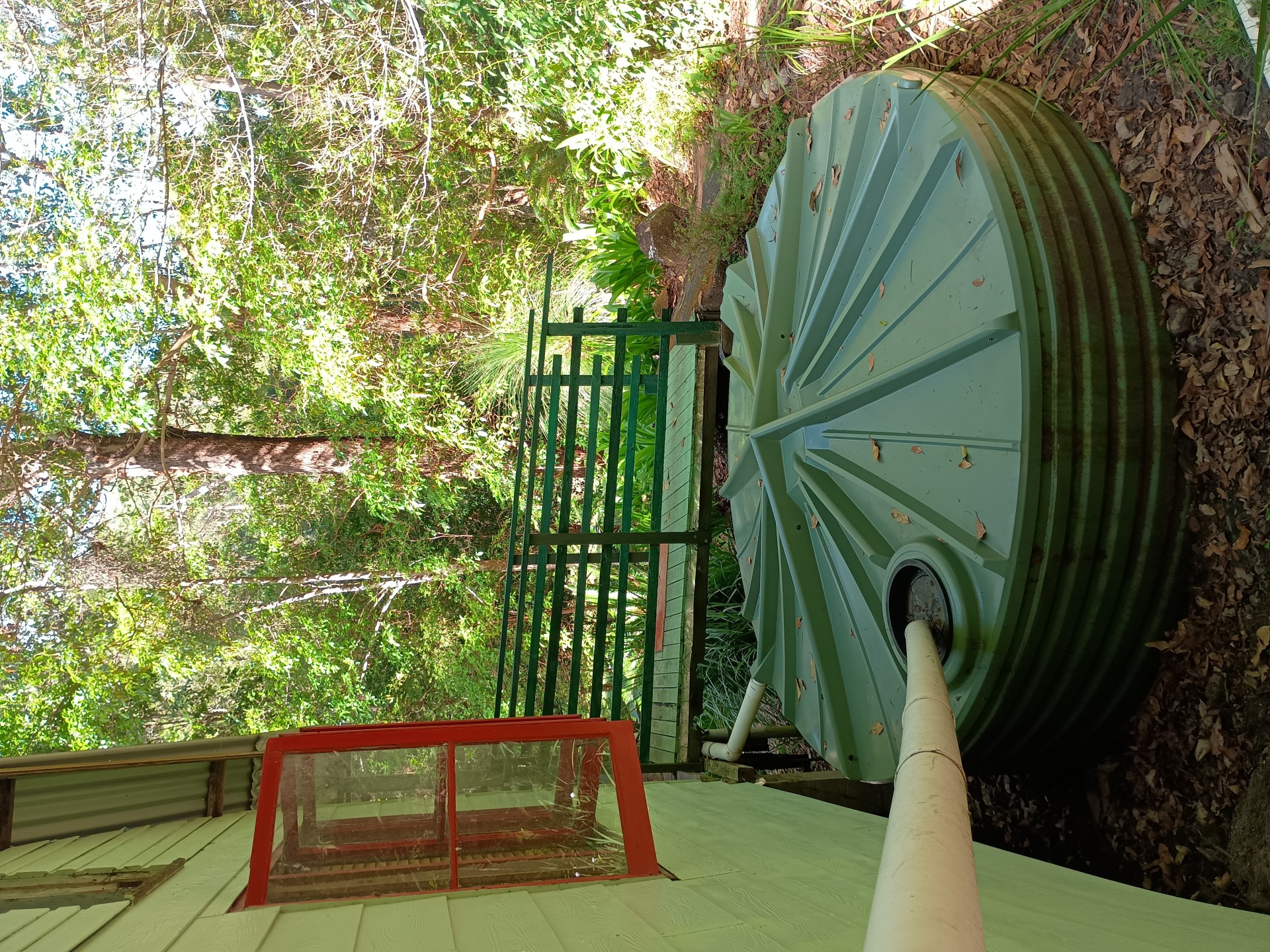 Three water tanks, 36000 L total, including a header tank uphill to enable gravity fed water.
