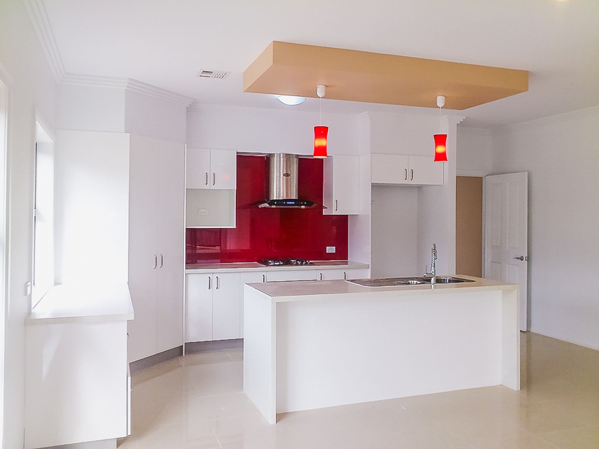 • Modern Kitchen with stainless steel appliances including dishwasher, Star white granite benchtop with waterfall island bench, glass splashback & glass canopy rangehood and big Family/Dining area