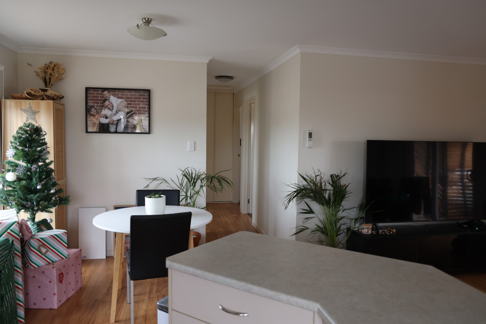 Open plan modern living, dining, kitchen.