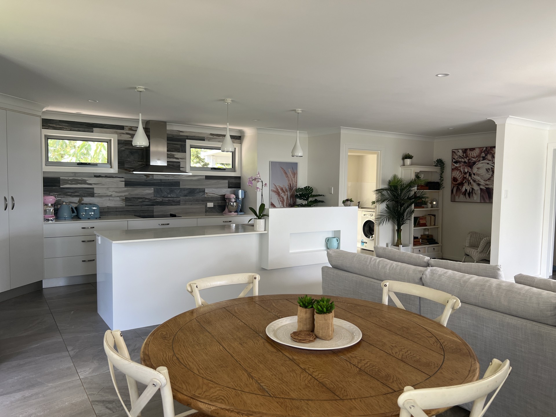 • Contemporary kitchen with island bench and direct connection to the deck and views