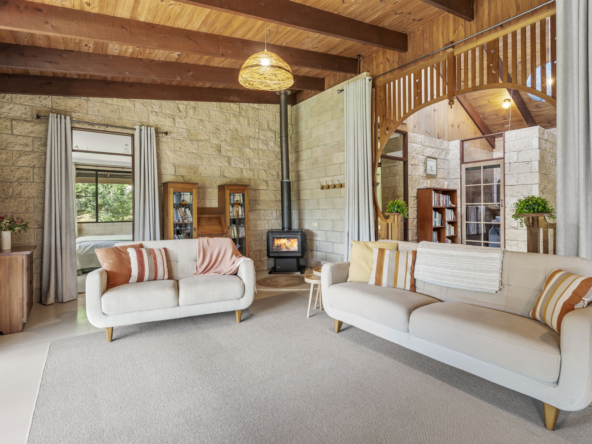 Upon entering the character-filled main dwelling you are greeted by a light filled formal entrance featuring ornate woodwork and raked timber ceiling, which leads into the spacious open plan living/dining/kitchen area. This comfortable space features 3.7m high ceilings with exposed timber beams and looks out to the impressive cliffs of Mt Billen. Large glass doors and windows on all sides fill the space with natural light and provide sweeping vistas of forest and mountains. A north east aspect and wide verandahs all round make for a thermally balanced living space keeping you cool in summer and warm in winter.
